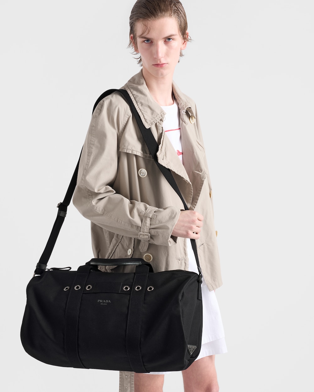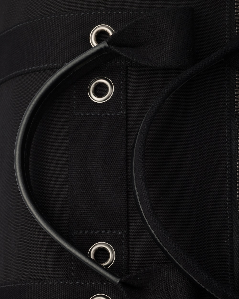 「このダッフルバッグは、クリーンでグラフィックなラインと力強いアクセントを備え、機能性をスタイルの真正性の表現として解釈しています。ソフトでコンパクトなボリュームが日常使いに適しており、コットンキャンバスが洗練されたスポーティな印象を与えます。デザインは、調節可能なショルダーストラップとメタルパーツで完成され、現代的なダイナミズムのために設計されたアクセサリーの実用的な本質を際立たせます。