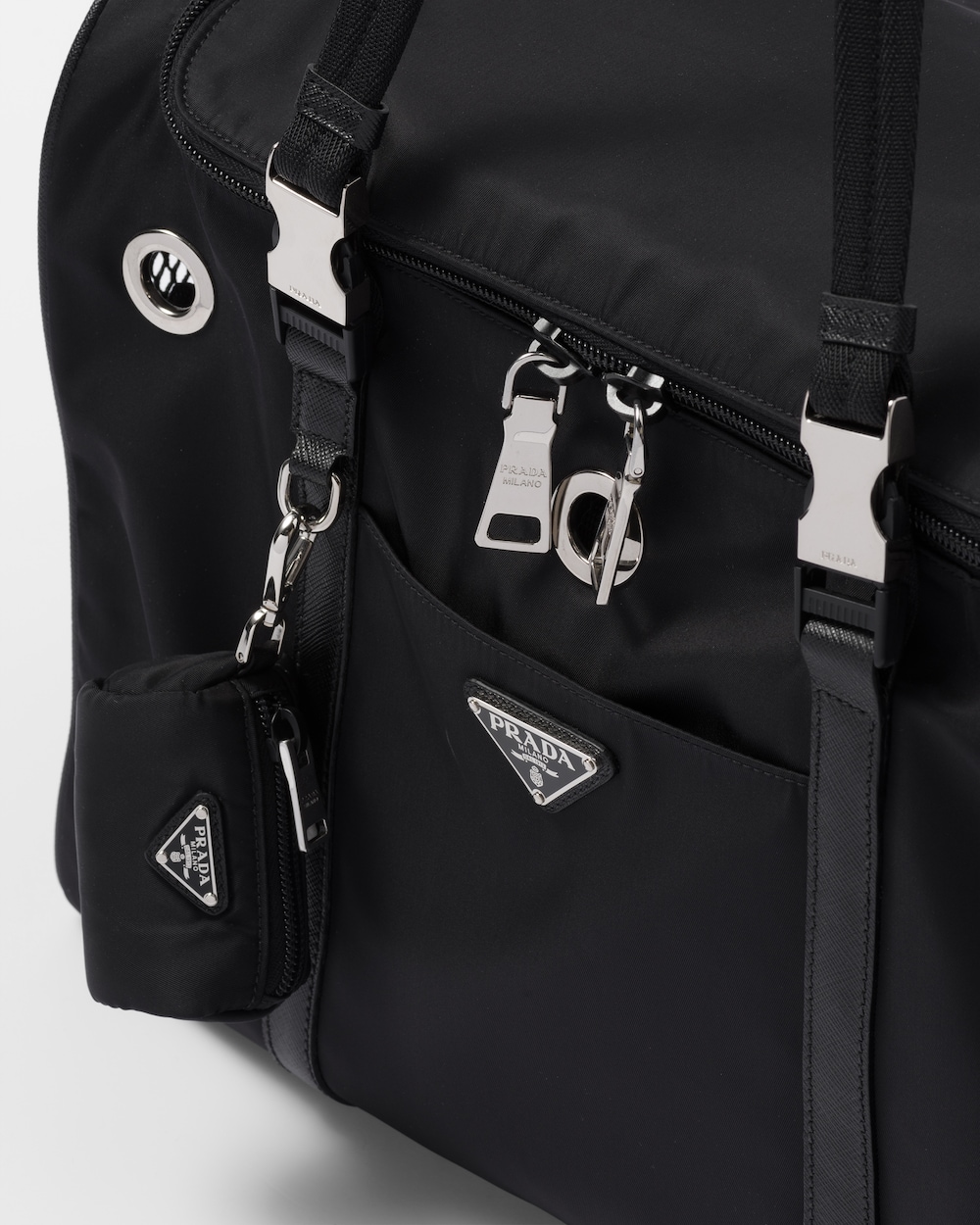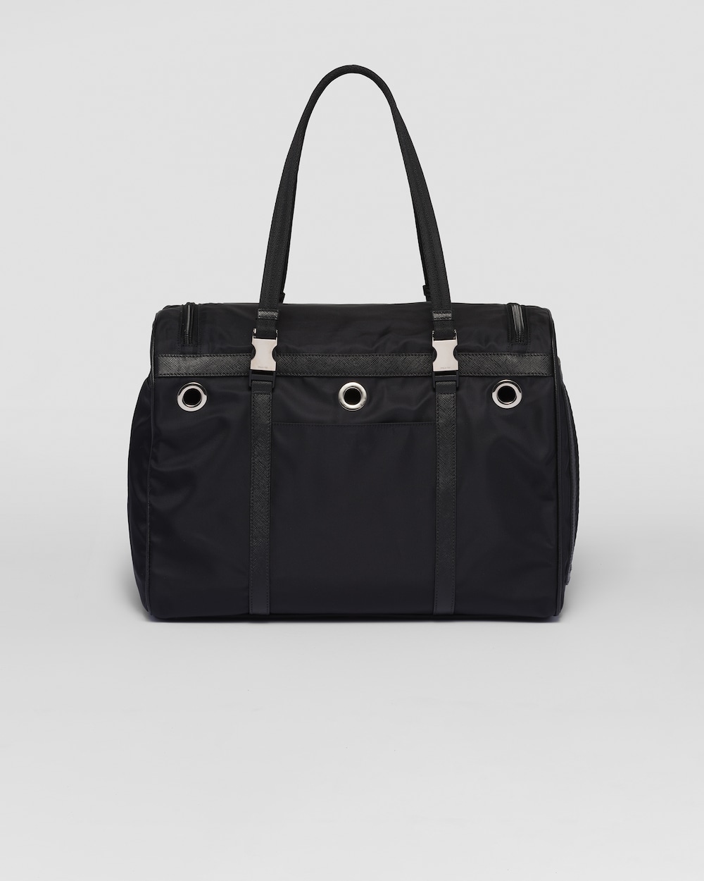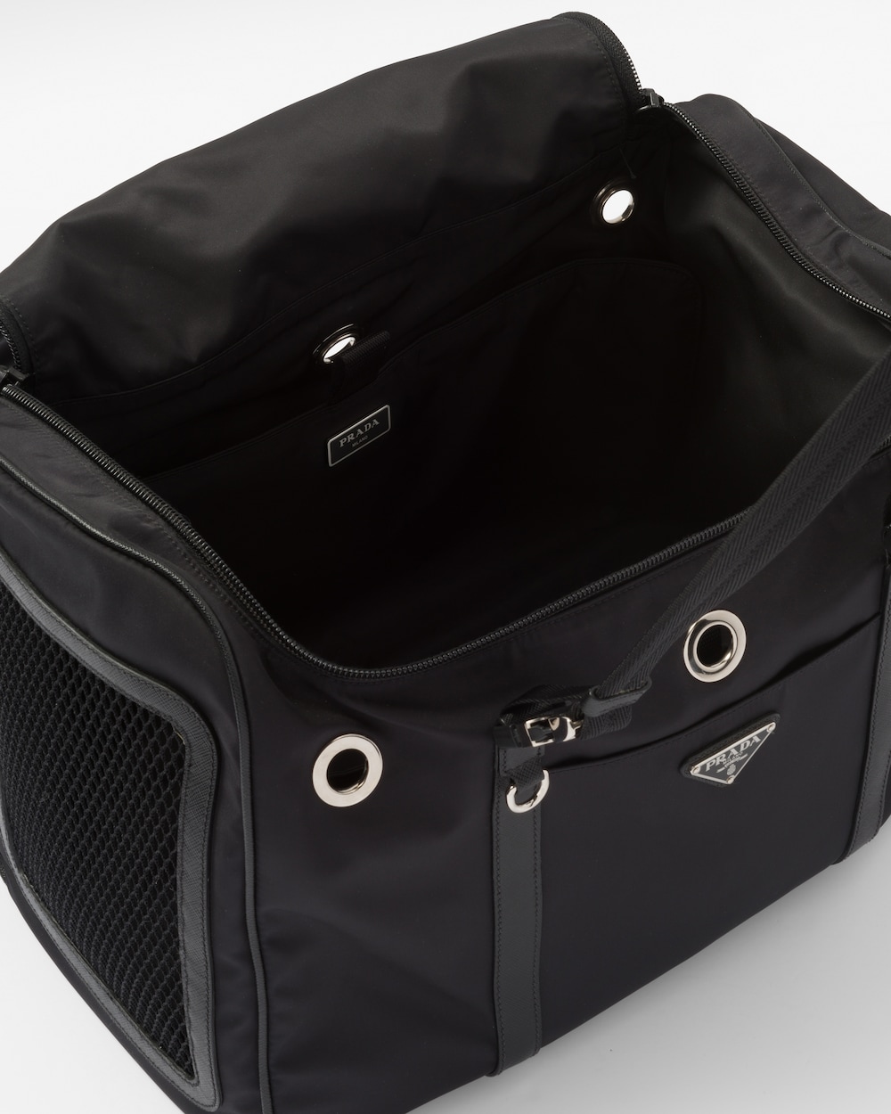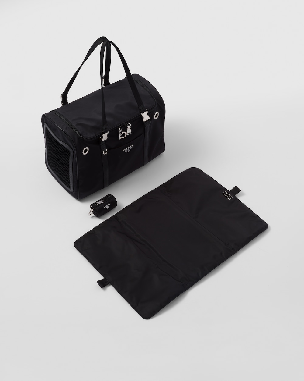 ペットの移動に適したダブルハンドル付ペット用バッグ。プラダを象徴する2つの素材、「サフィアーノ」レザー(牛革)とプラダによって初めてラグジュアリーブランドで採用されたファブリックであるナイロンを組み合わせました。アイコニックなトライアングルロゴがあしらわれた、外ポケット付の便利なデザイン。ペットカラー用ストラップ、フードボウル、ペット用トイレ袋ケースなど、ペットのケアに欠かせないアイテムが備わっています。 サスティナブルなお手入れ方法:製品の風合いを保つため、また環境への負荷を軽減するために、製品を頻繁にクリーニングすることを推奨しておりません。使用後は風通しの良い場所で陰干ししていただき、クリーニングが必要な場合は環境に配慮したクリーニング店でドライクリーニングをすることをおすすめします。