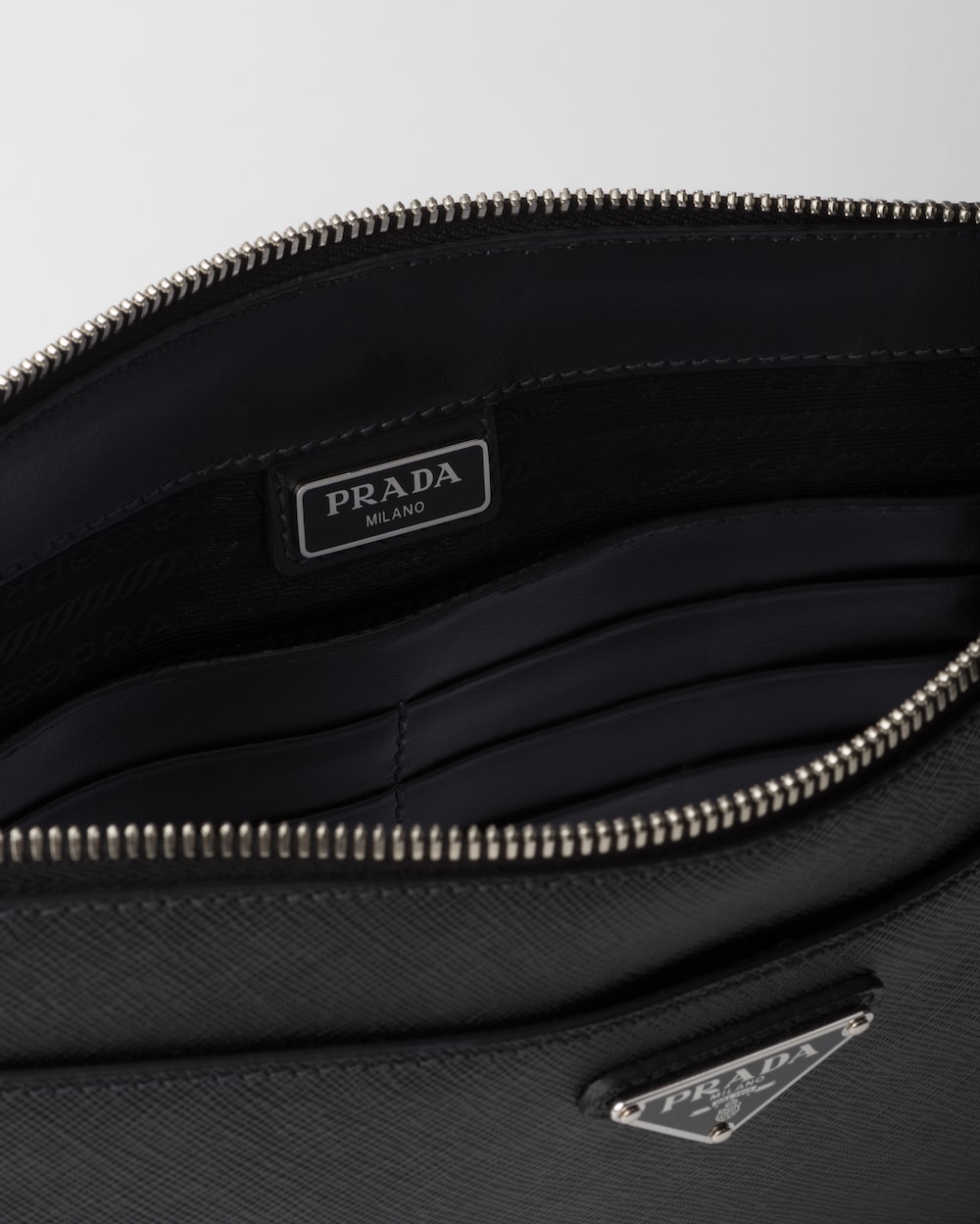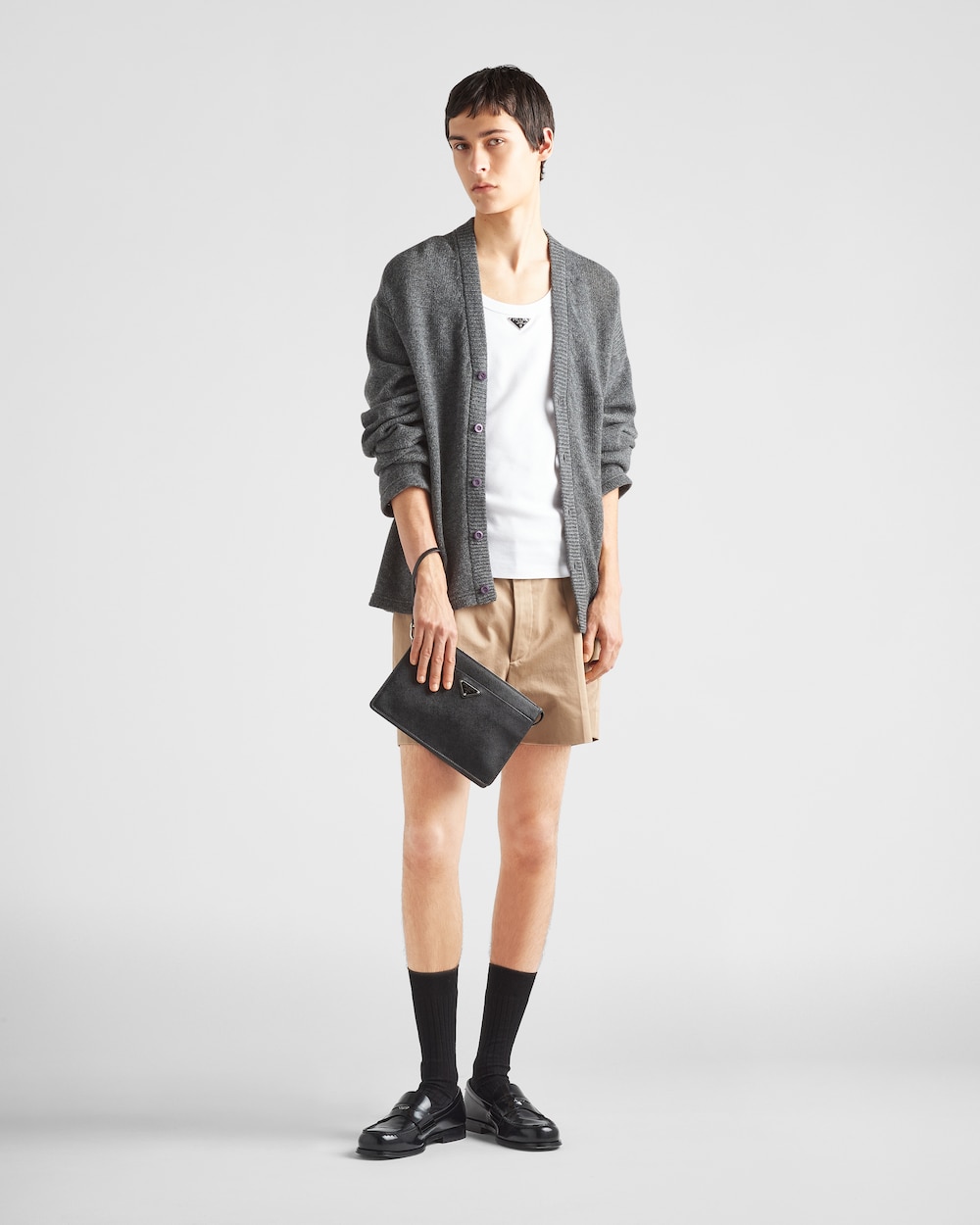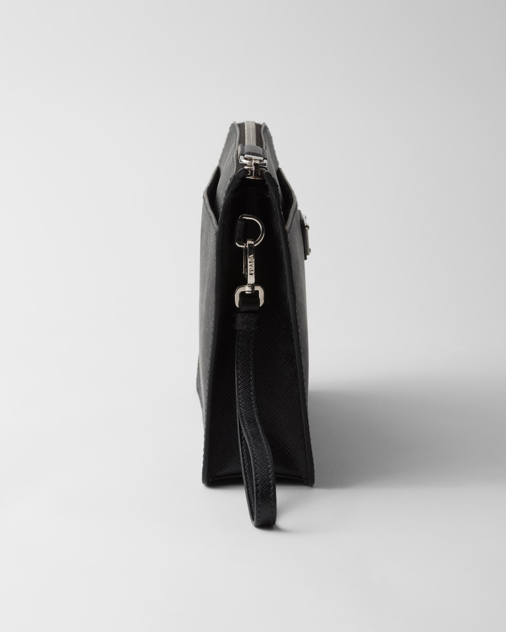 取り外し可能なレザー リストストラップが付いたコンパクトなメンズバッグ。メタル トライアングルロゴがあしらわれています。