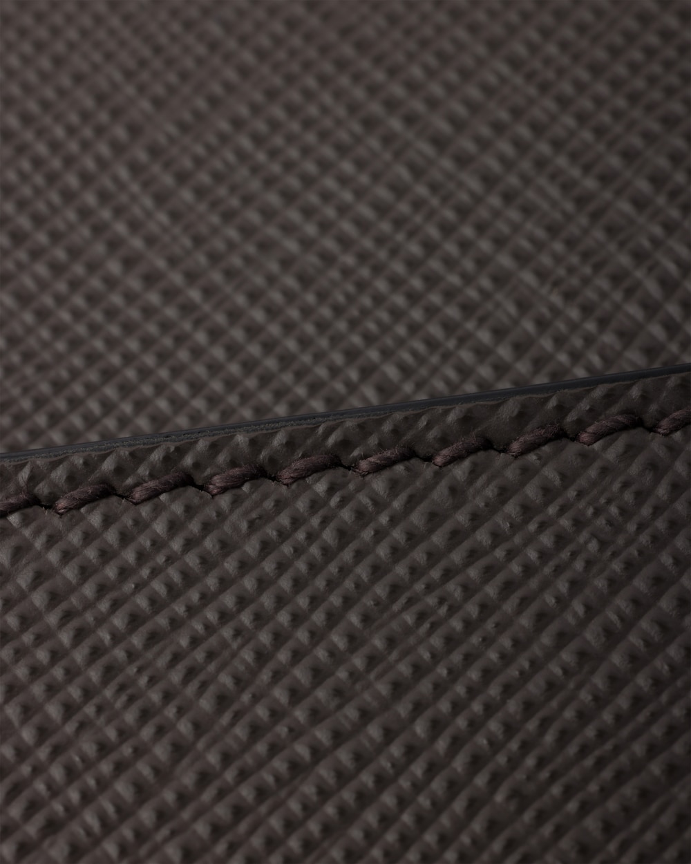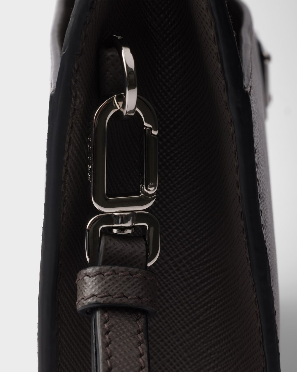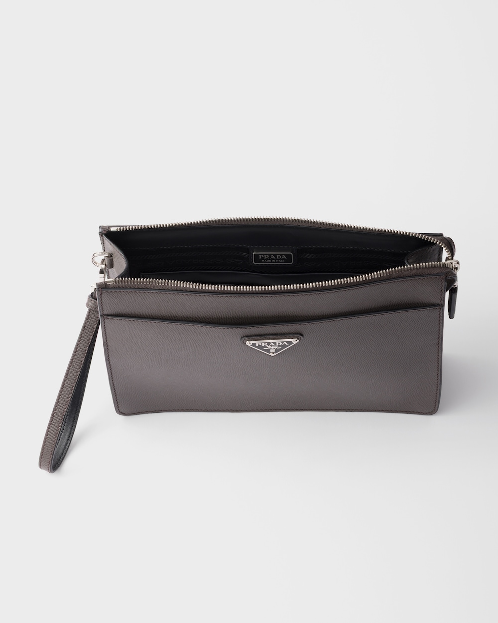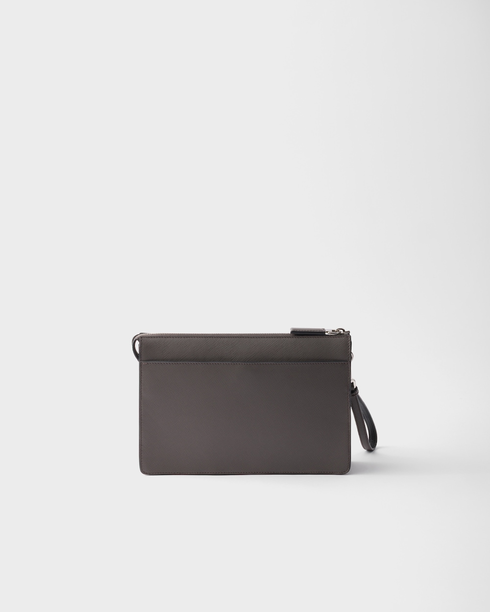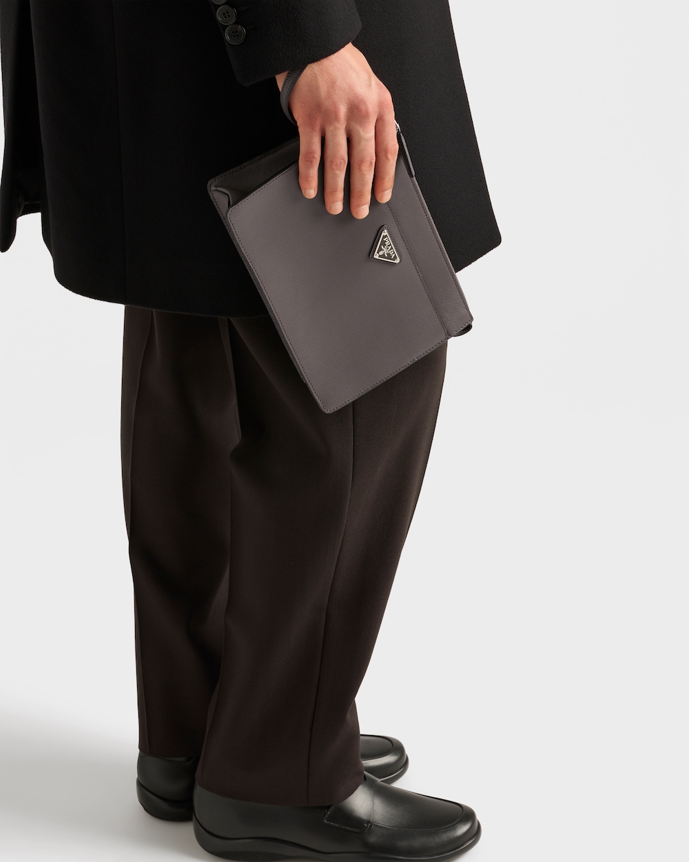 取り外し可能なレザー リストストラップが付いたコンパクトなメンズバッグ。メタル トライアングルロゴがあしらわれています。