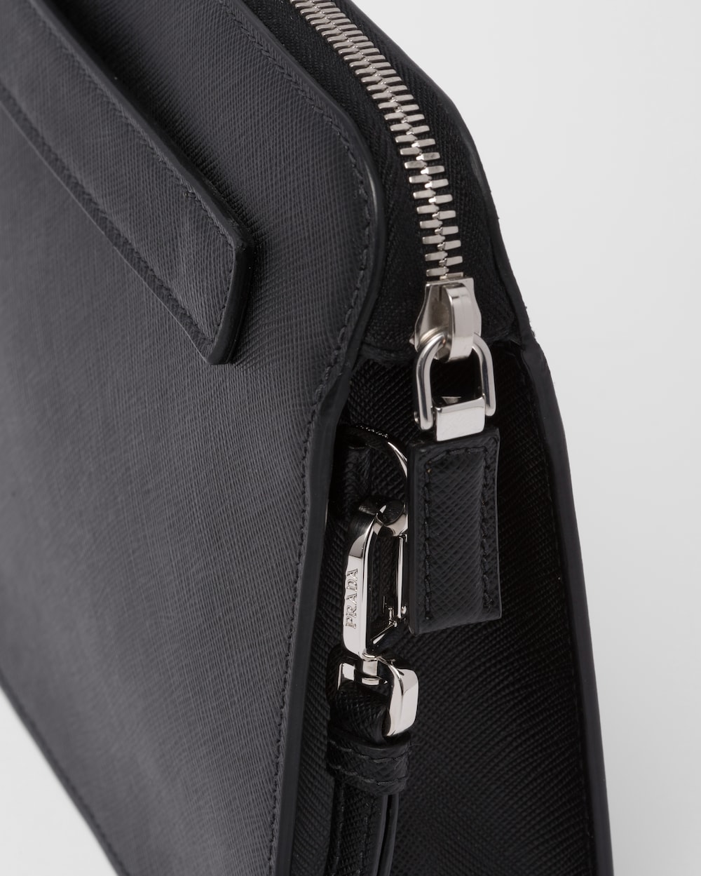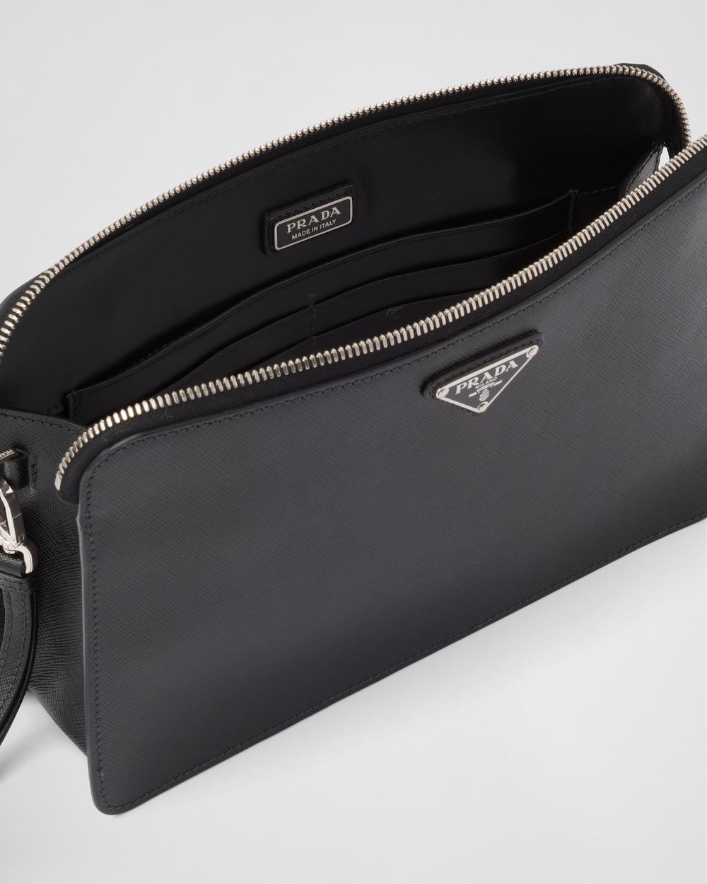 現代的なデザインと伝統を融合した、取り外し可能なリストストラップ付ファスナー開閉式ポーチ。創業者のマリオ・プラダがデザインしたトランクに初めて登場したトライアングルロゴがあしらわれています。プラダを象徴する素材であるクロスハッチ加工とワックス仕上げを施した「サフィアーノ」レザー(牛革)はラグジュアリーの代名詞であり、伝統的なイタリア製レザーグッズの生産技術を象徴する素材。