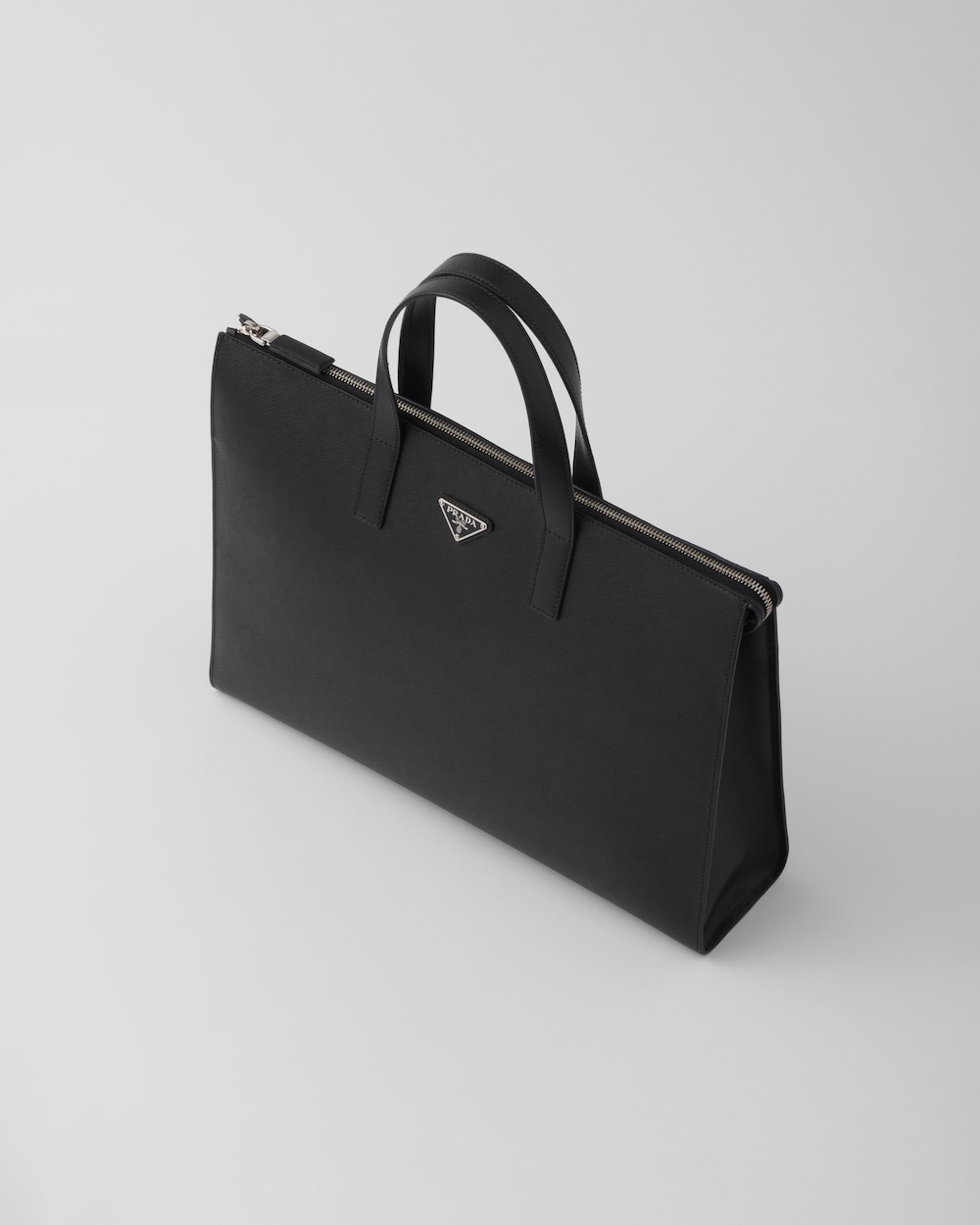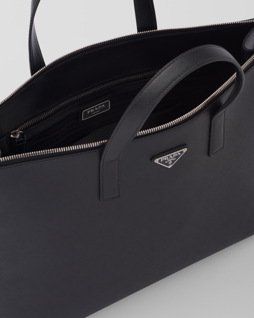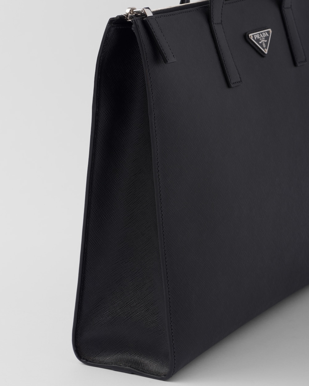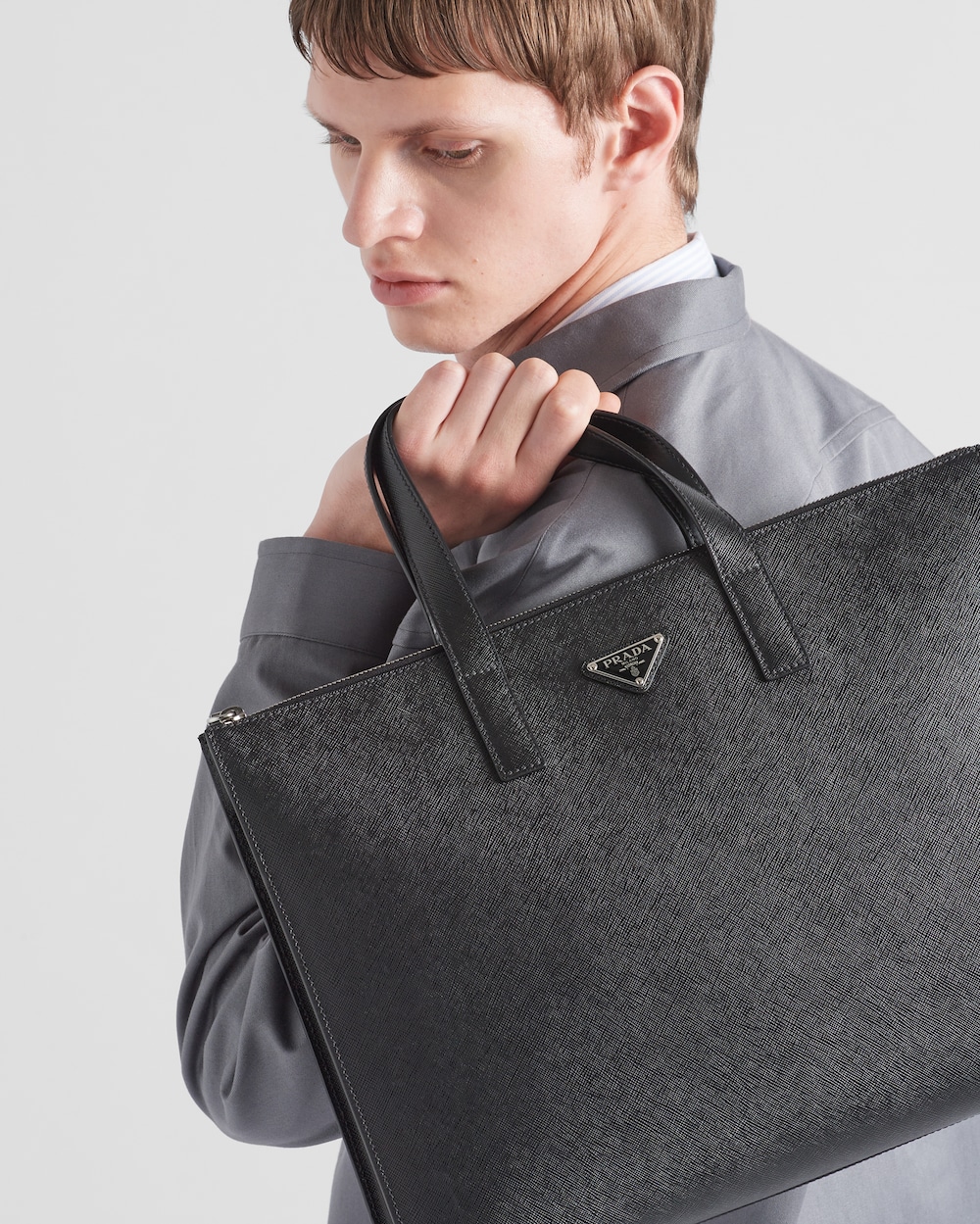 1913年に創業者のマリオ・プラダがデザインしたトランクに初めて登場したトライアングルロゴをあしらい、モダニズムとクラシックが融合した洗練されたトートバッグ。プラダを象徴する素材であるクロスハッチ加工とワックス仕上げを施した「サフィアーノ」レザー(牛革)はラグジュアリーの代名詞であり、伝統的なイタリア製レザーグッズの生産技術を象徴する素材。