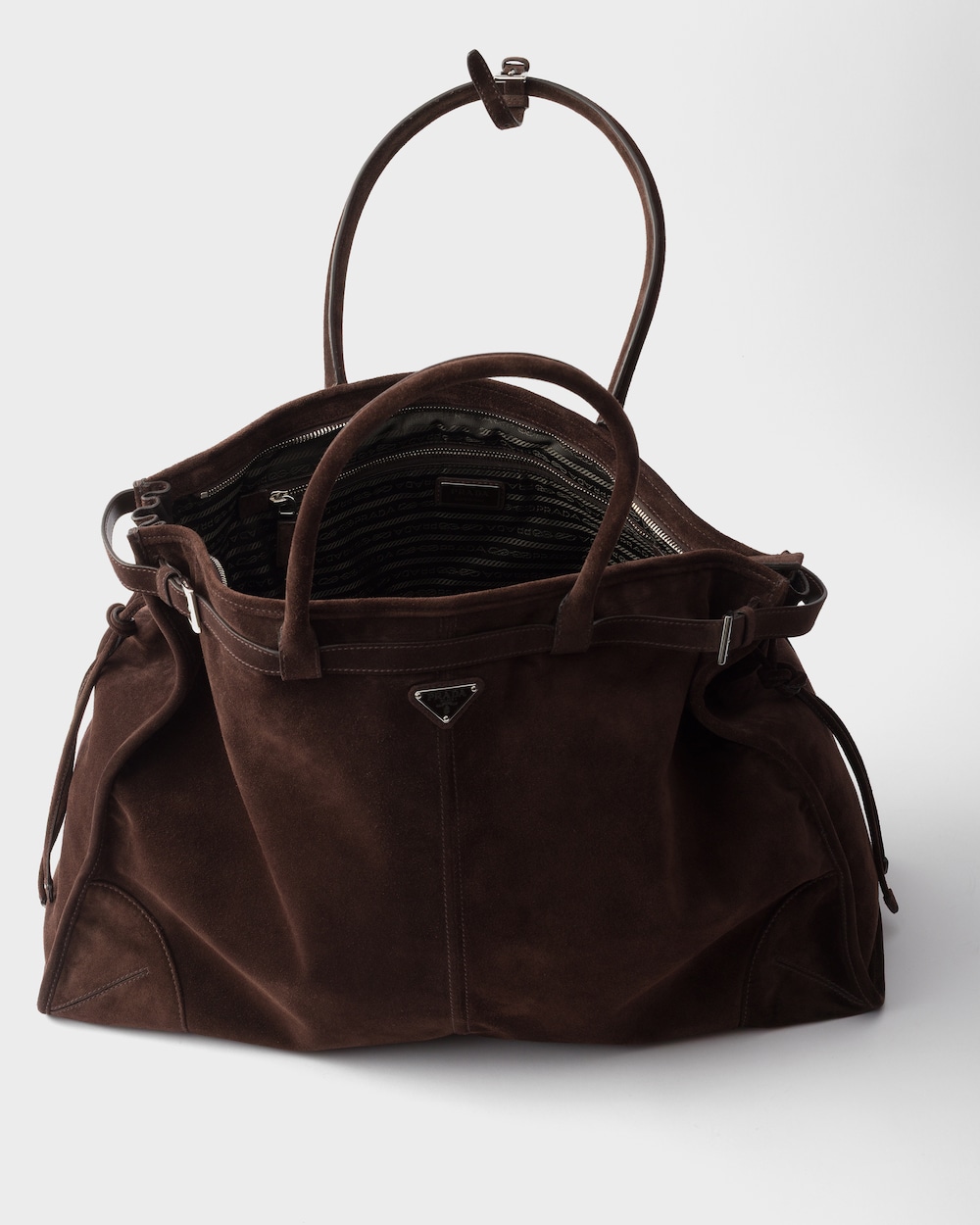 スエードを使用した、実用的で洗練されたトートバッグ。エレガントなストラップを備えています。異なるスタイルを組み合わせることで洗練と個性を両立させた収納力のあるシルエットに、アイコニックなエナメルメタルのトライアングルロゴをあしらいました。