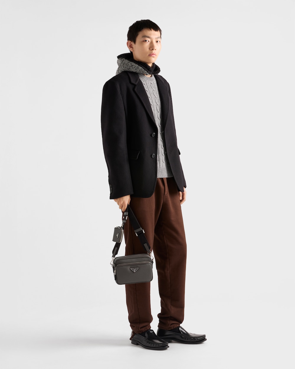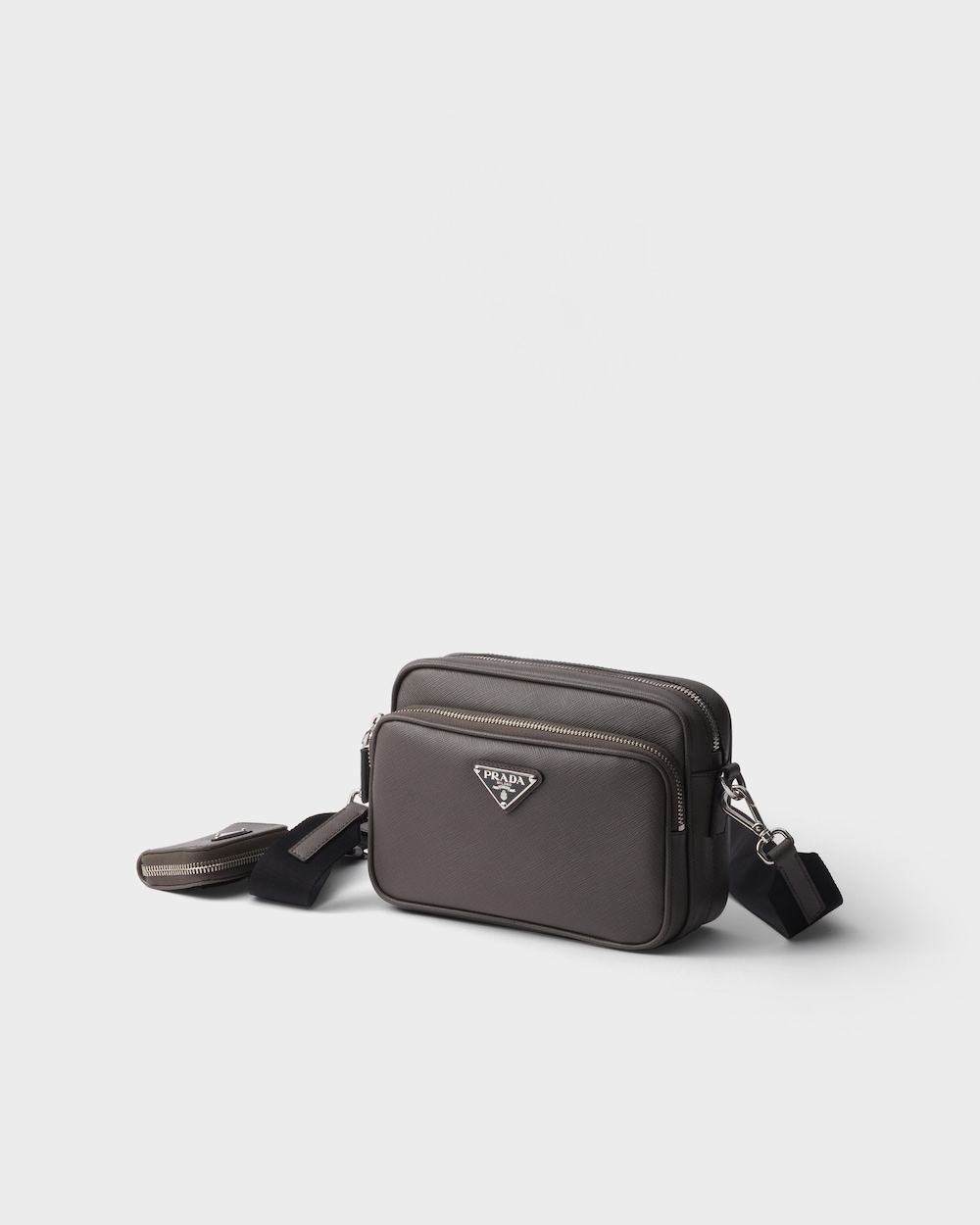 「サフィアーノ」レザー(牛革)を使用したショルダーバッグ。プラダを象徴するこの素材は、伝統的なイタリア製レザーのクラフツマンシップが息づく、ラグジュアリーの代名詞でもあります。フロントにアイコニックなポーチとエナメルメタルのトライアングルロゴがあしらわれています。