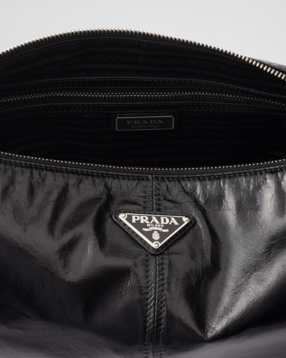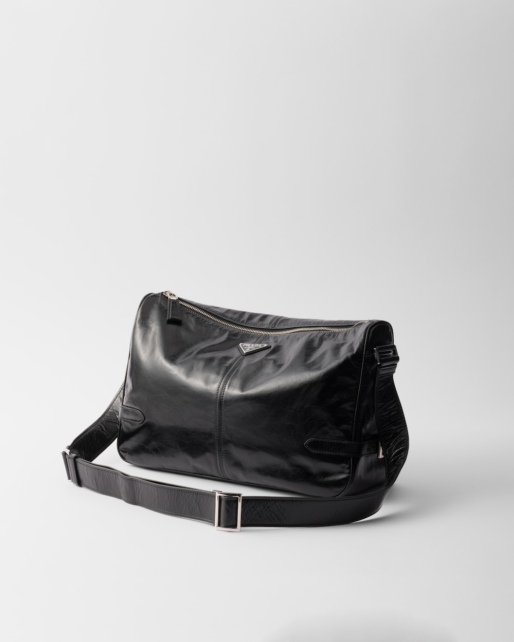 モダンで多用途に使えるこのショルダーバッグは、洗練されたディテールを備えたなめらかなシルエットが特徴。光沢仕上げのソフトレザーを使用し、特徴的なトライアングルロゴをあしらっています。