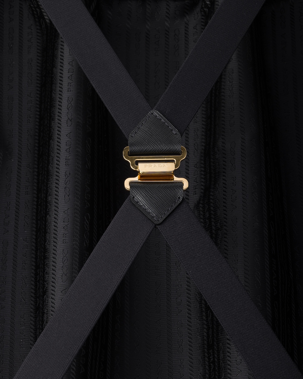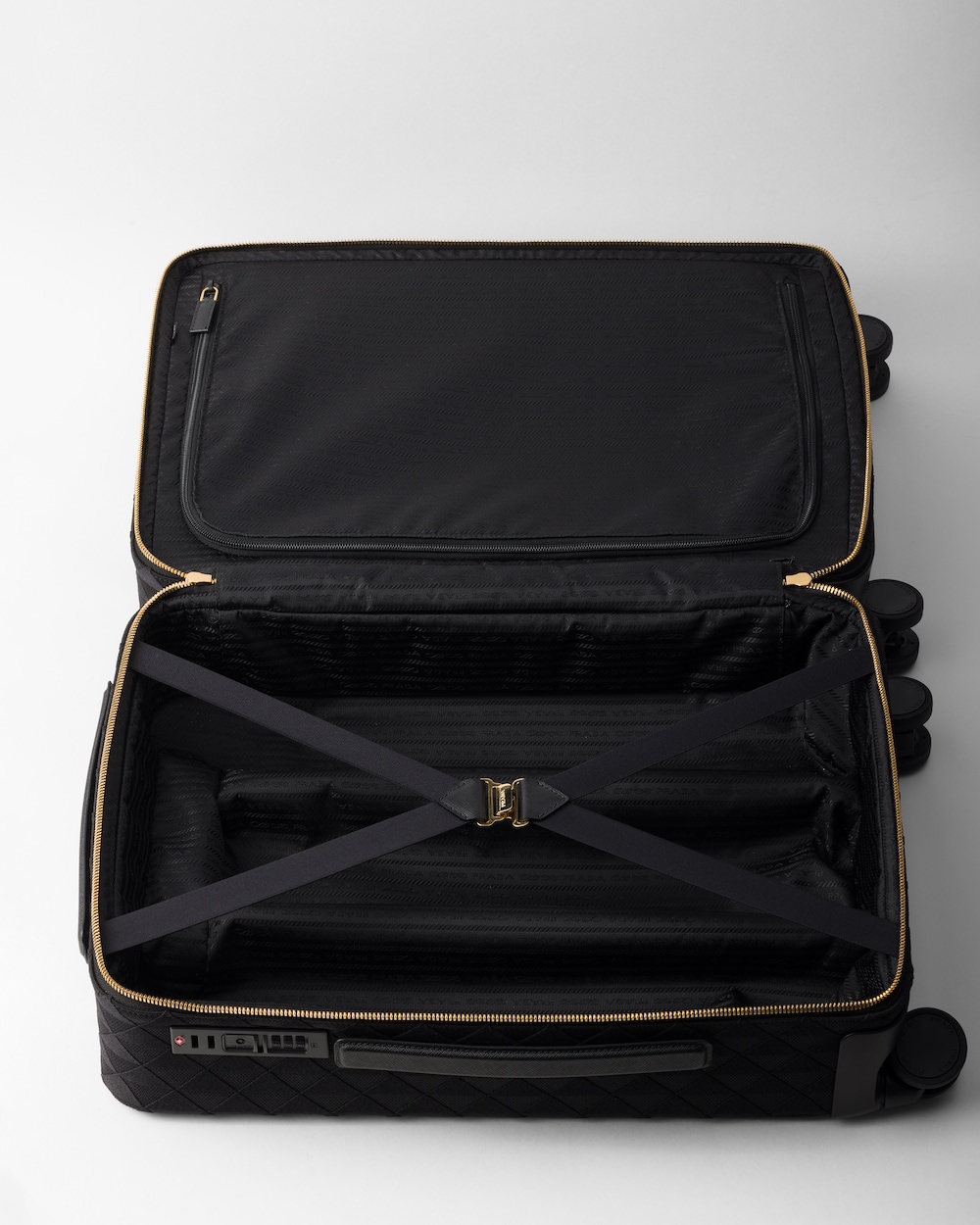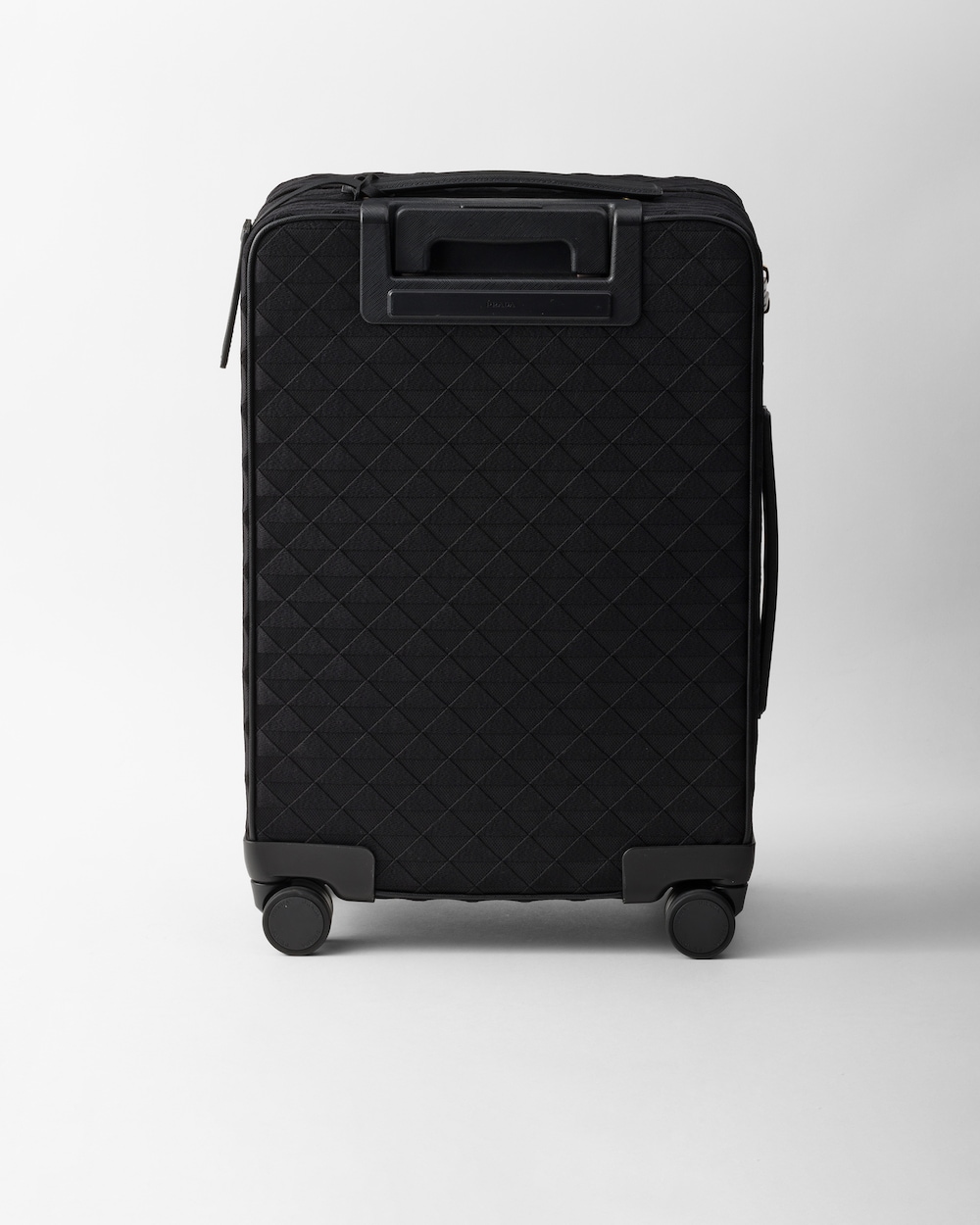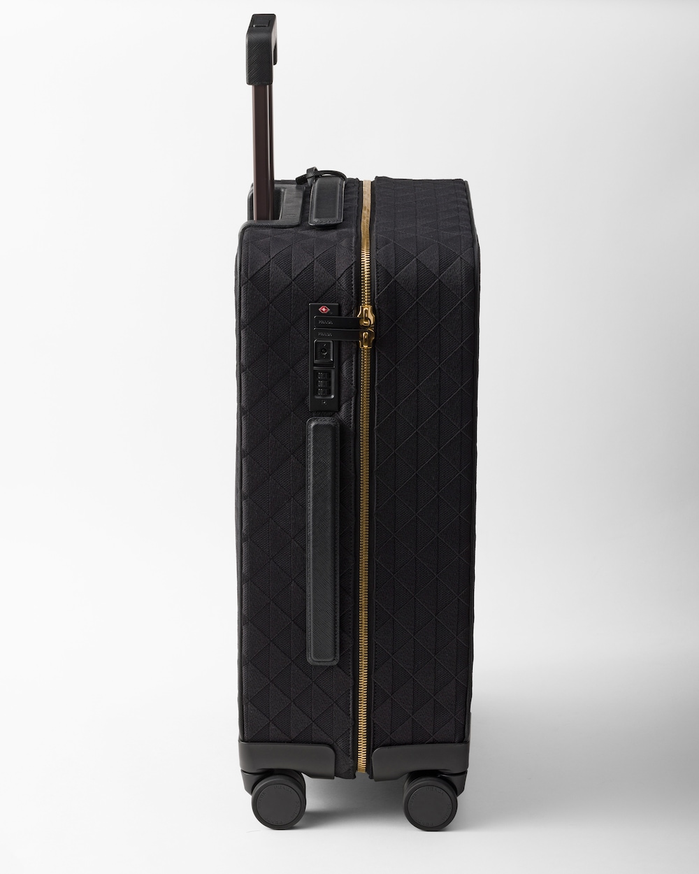 エレガントで実用的なトロリー。アイコニックなプラダ シンボルのモチーフに着想を得た同色の幾何学模様のファブリックを使用したアイテム。レザーのネームタグ、トライアングルロゴが洗練されたデザインを引き立てます。