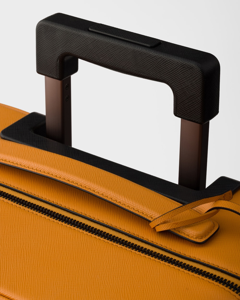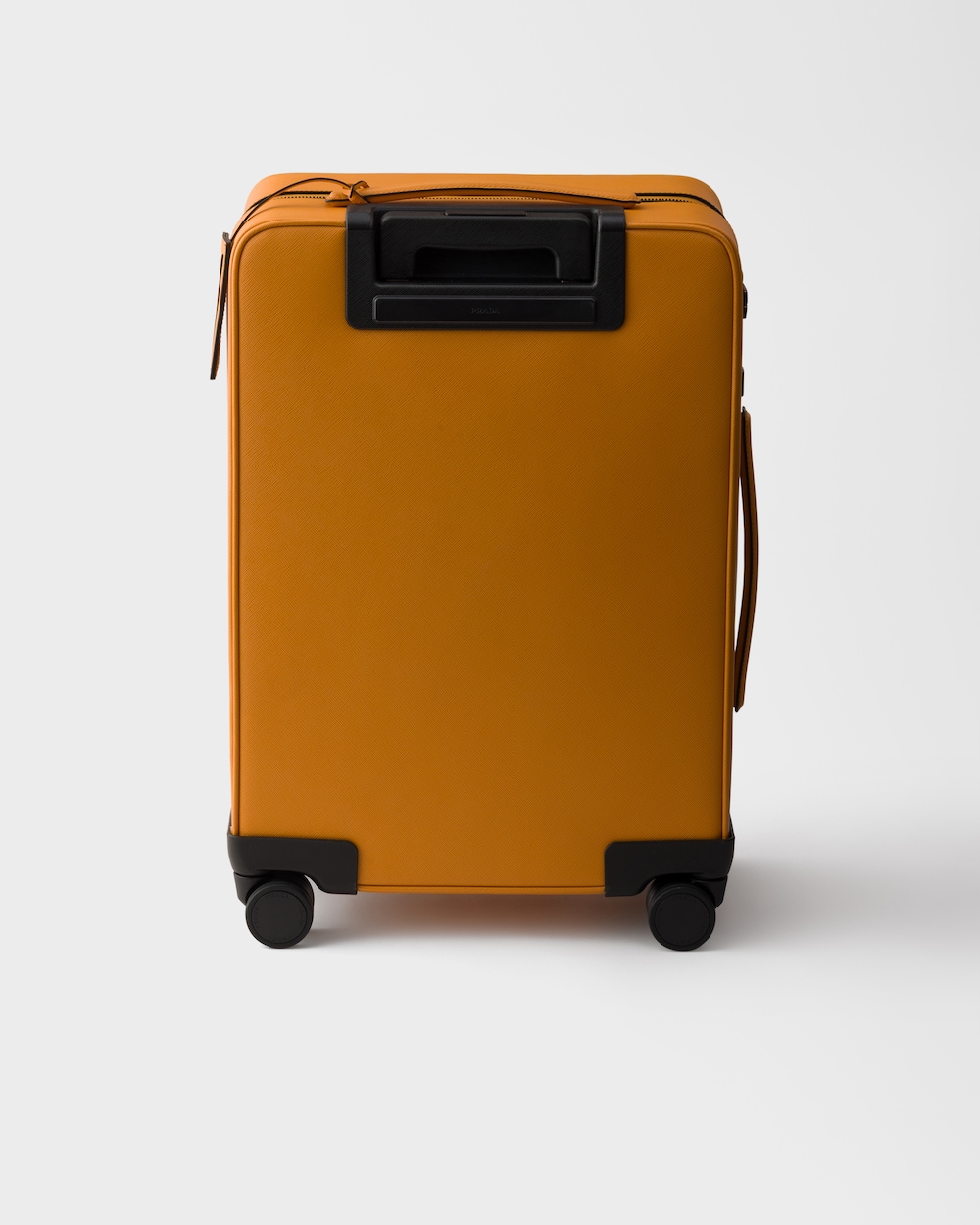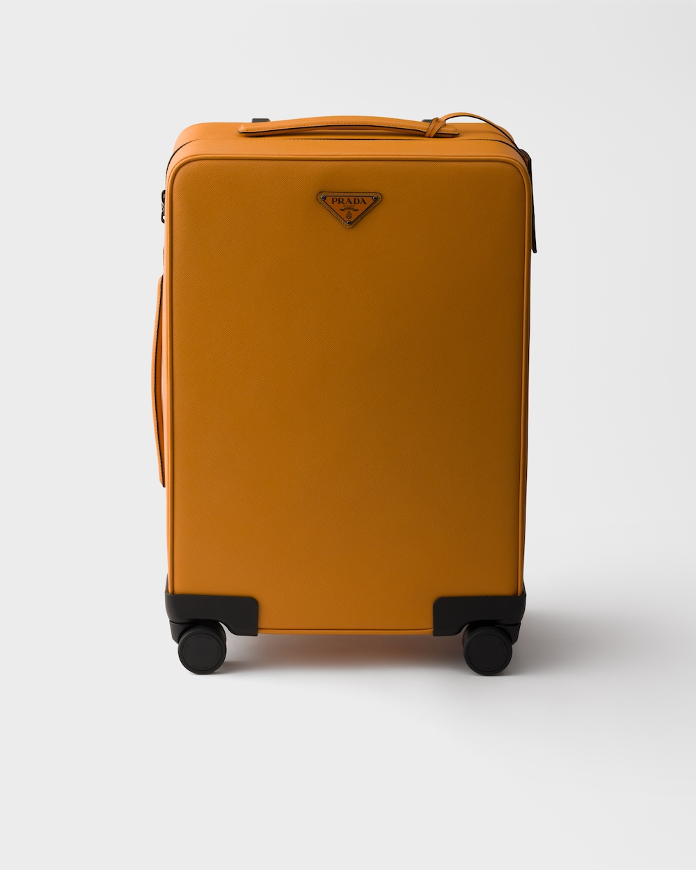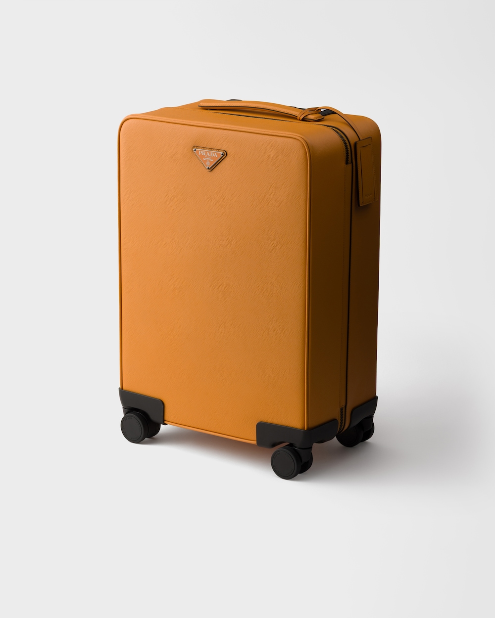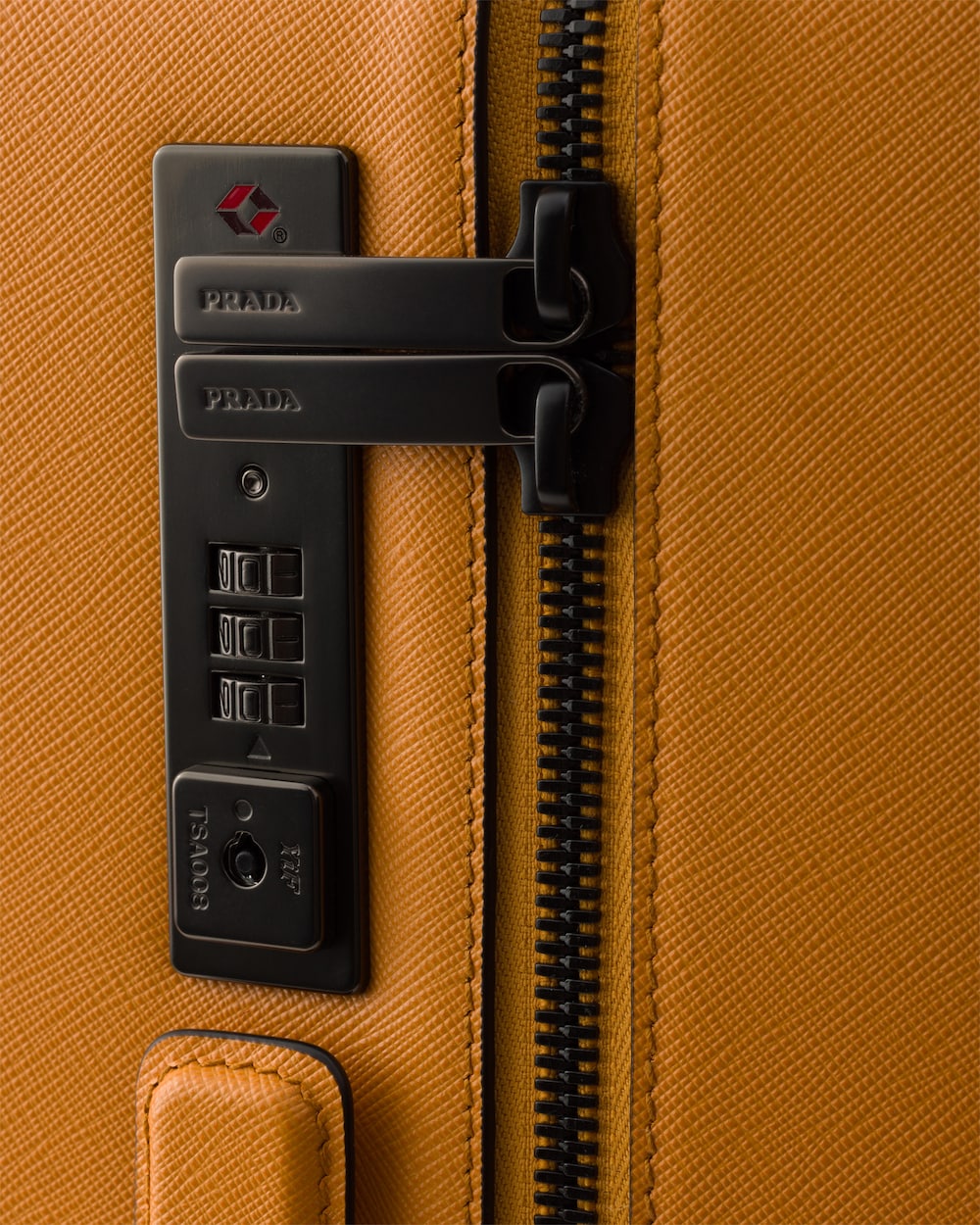 エレガントで機能的なデザインが魅力のトロリー。独特な質感のクロスハッチ加工とワックス仕上げが施された、プラダを象徴する素材サフィアーノレザー(牛革)を使用しています。
