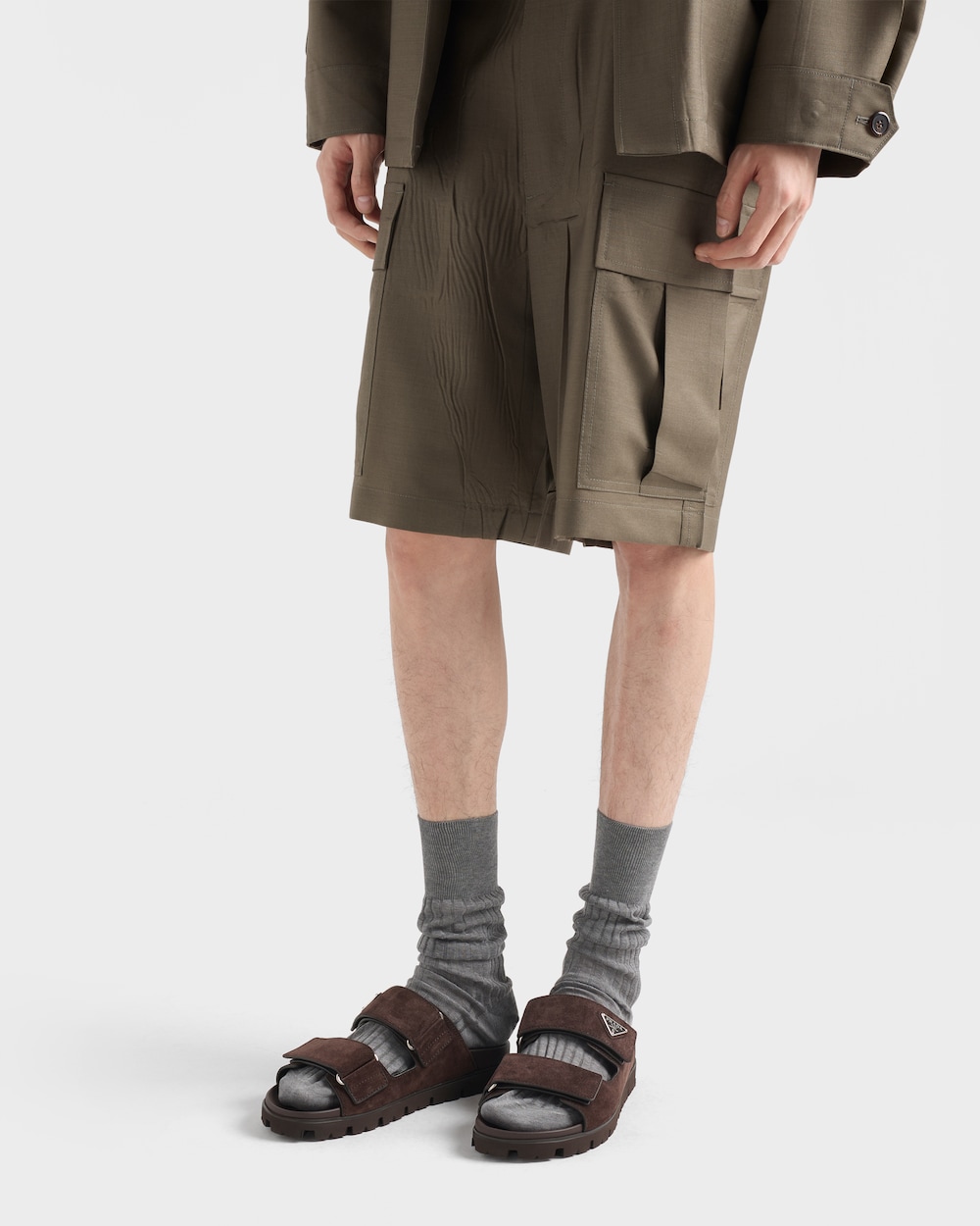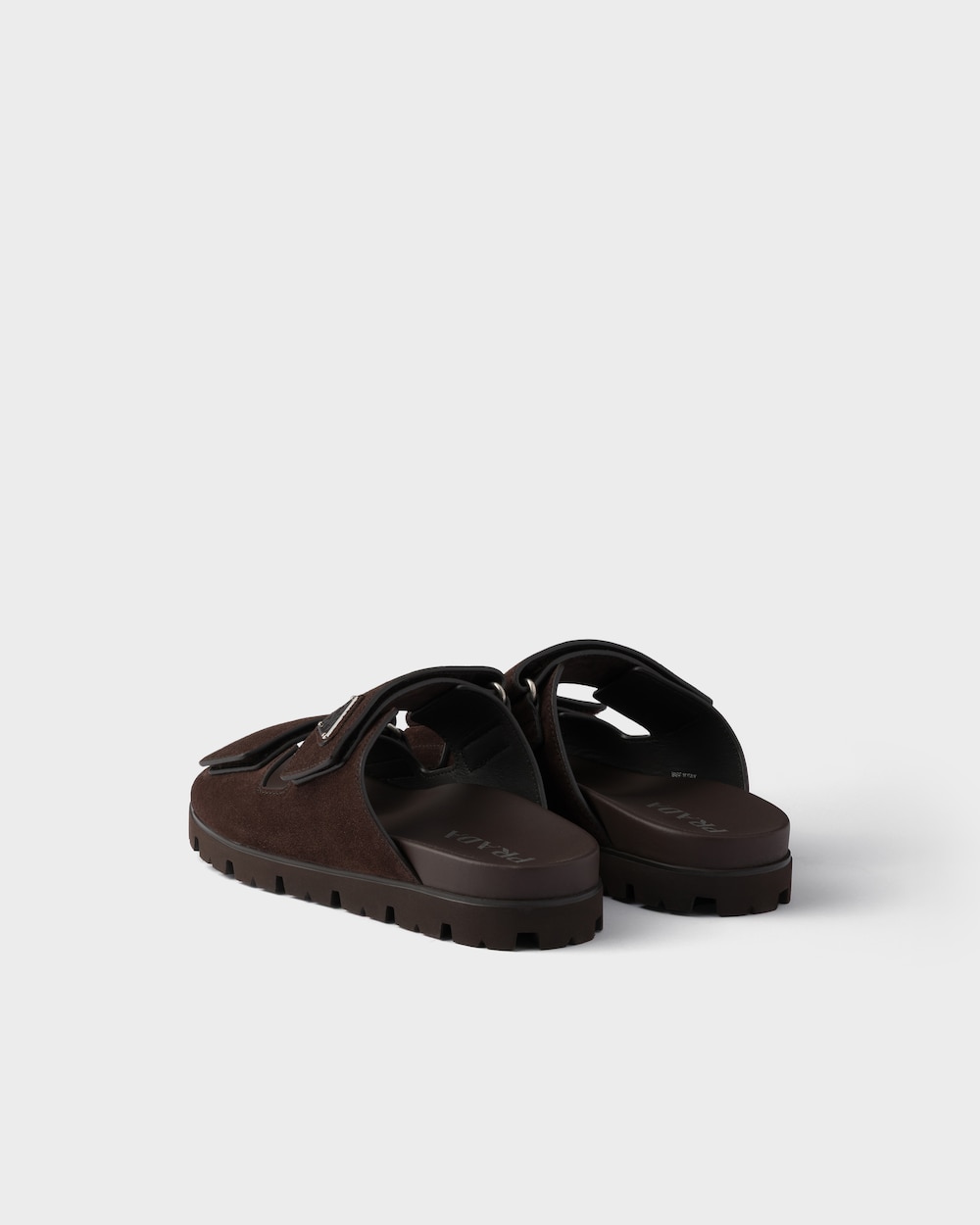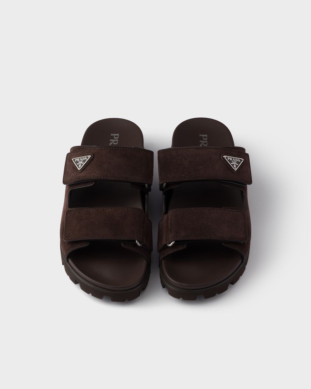 スポーティな機能性と洗練されたディテールが共存する、柔らかなスエードのサンダル。汎用性の高い現代的なシューズに、エナメルメタルのトライアングルロゴがあしらわれています。