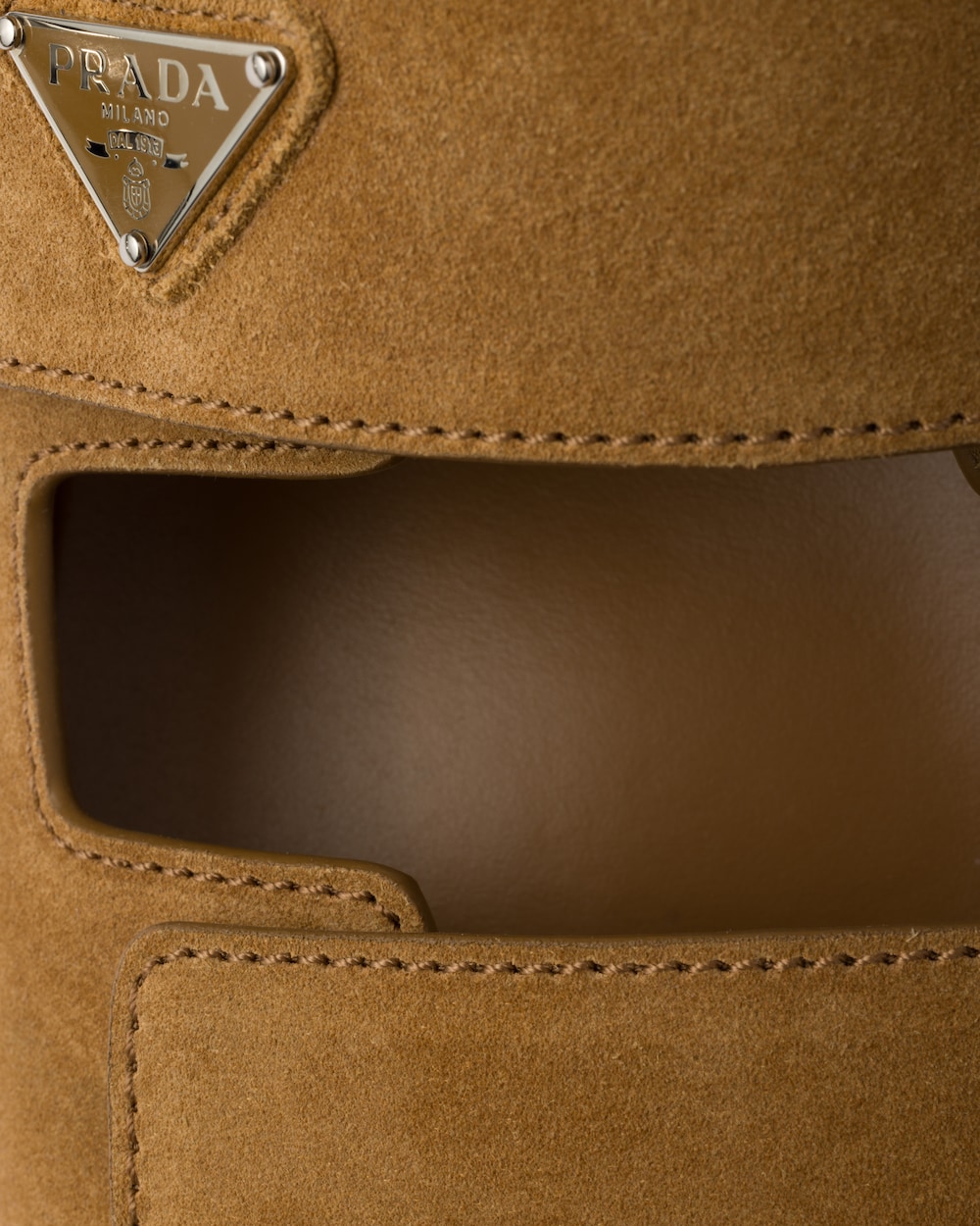 スポーティな機能性と洗練されたディテールが共存する、柔らかなスエードのサンダル。汎用性の高い現代的なシューズに、エナメルメタルのトライアングルロゴがあしらわれています。