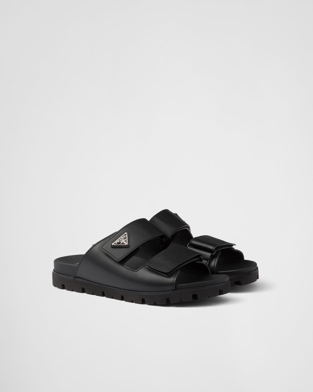 スポーティなディテールがあしらわれたレザーサンダル。すっきりとした現代的なラインが際立ちます。面ファスナーのストラップ付のデザインに、ラバーのラグソールを合わせ、カジュアルなスタイルに仕上げました。エナメルメタルのトライアングルロゴが、プラダらしい洗練された魅力を添えています。