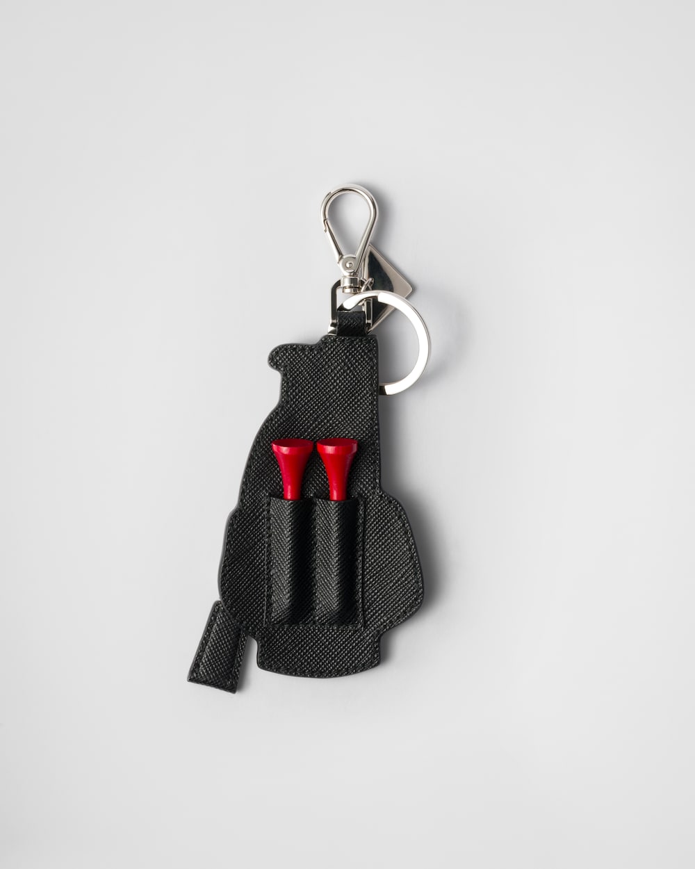 スポーティな「サフィアーノ」レザー(牛革)のバッグチャーム。ゴルフティーを携帯するのに理想的な、遊び心のある多機能デザイン。