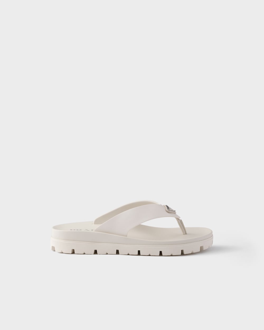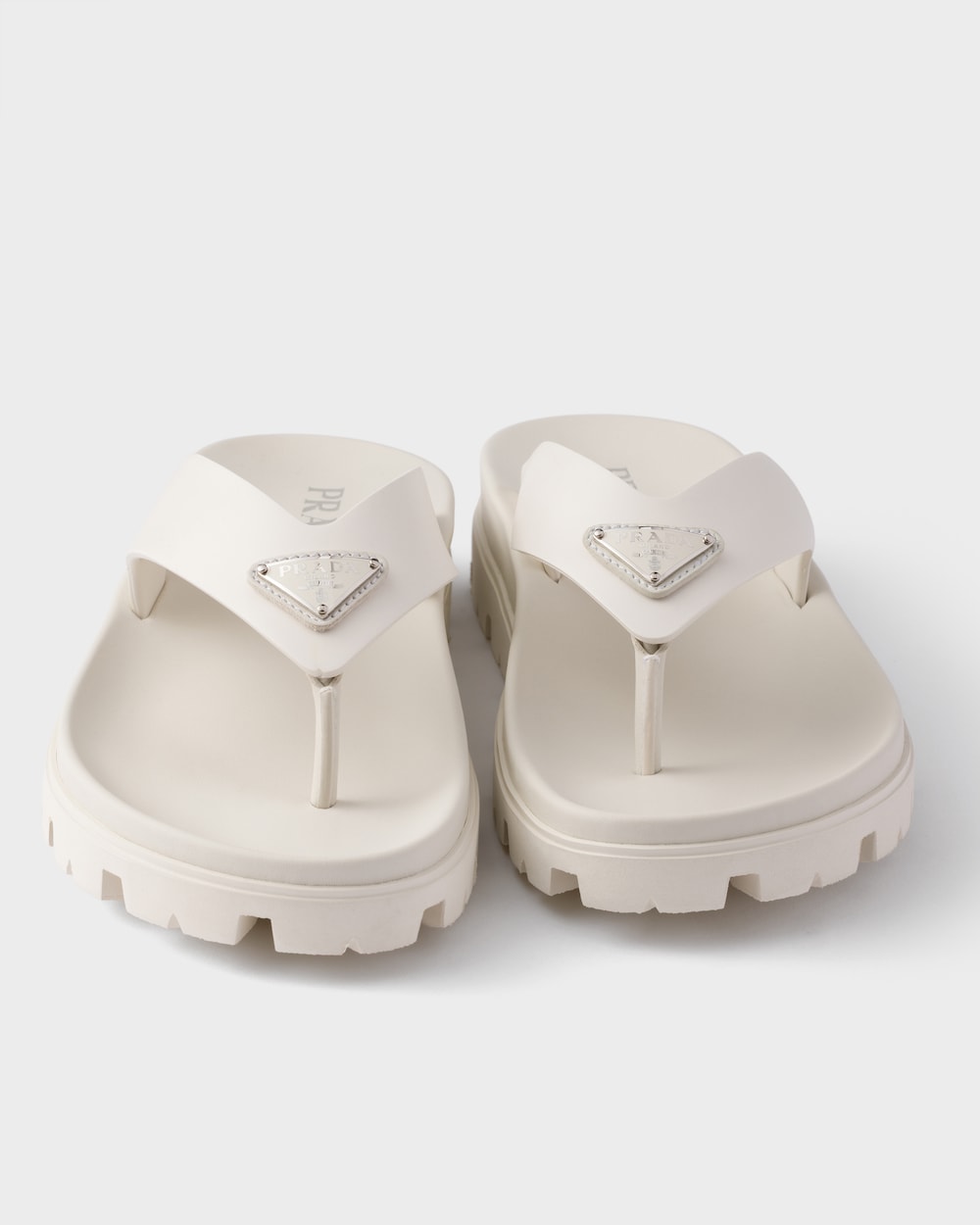 現代的なシルエットと洗練されたディテールが魅力的な、ラバーのトングサンダル。アイコニックなエナメルメタルのトライアングルロゴをあしらい、ラバーのラグトレッドソールを合わせてスポーティな雰囲気をプラスしています。
