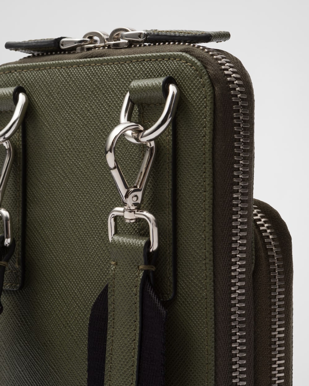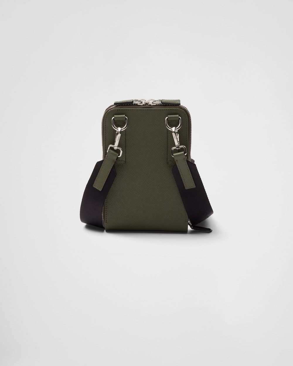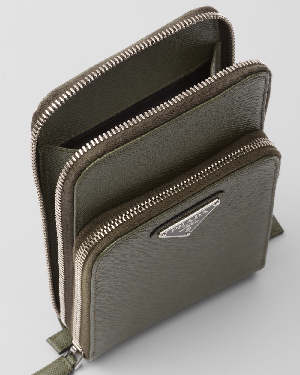 取り外し可能なショルダーストラップが付属したスマートフォンケース。プラダを象徴する素材である「サフィアーノ」レザーを使用。クロスハッチの質感とワックス仕上げが特徴の最高品質のカーフレザー(牛革)です。カードホルダー3個を備えた、ファスナー開閉式のデザイン。