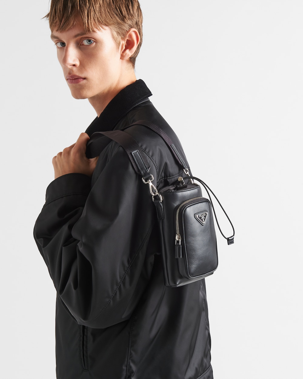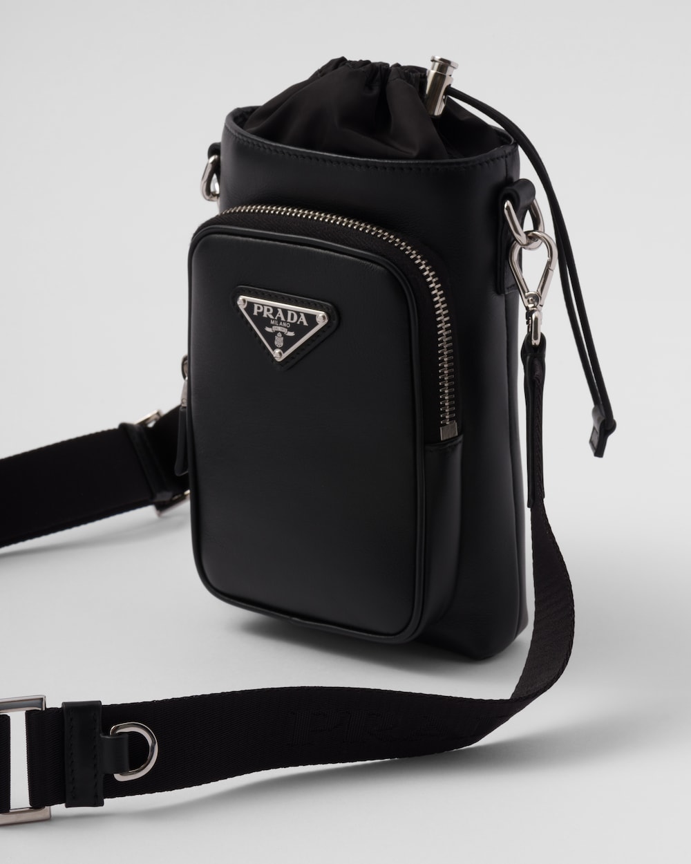モダンで斬新なレザーのスマートフォンケース。調整可能なナイロンテープのストラップ付で、首に掛けることが可能です。プラダを象徴するトライアングルロゴがあしらわれています。