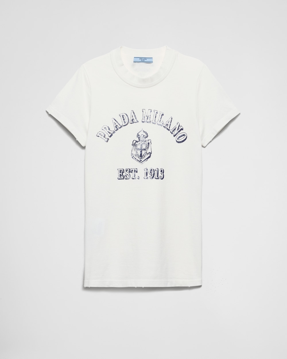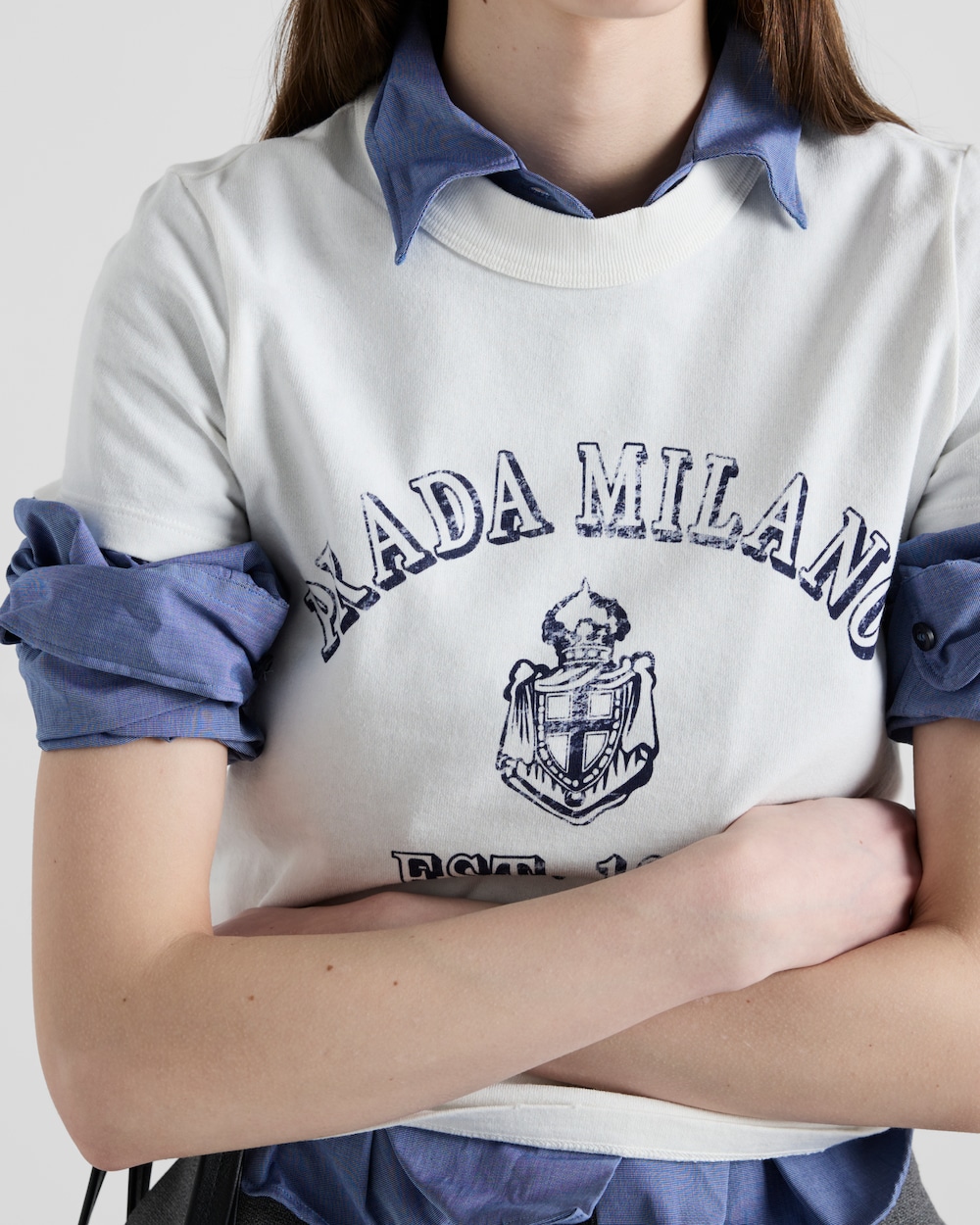 スポーティなデザインエレメントとレトロな雰囲気が融合し、ユーズド加工が施されたカレッジスタイルのジャージーTシャツ。前身頃のロゴプリントが、ヴィンテージの魅力を際立たせています。ニットのトライアングルロゴをあしらい、意外性のある質感とカラーのアクセントを添えました。