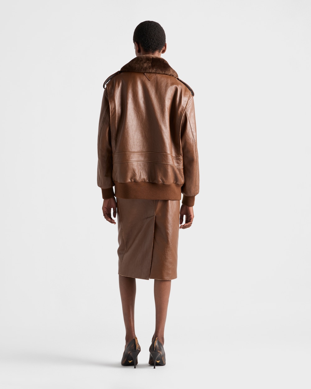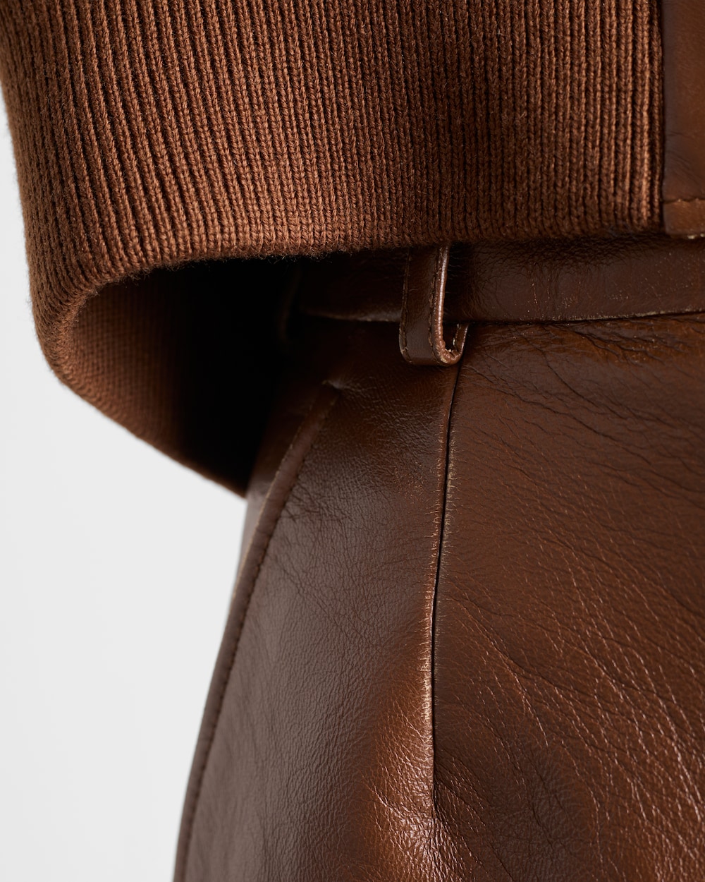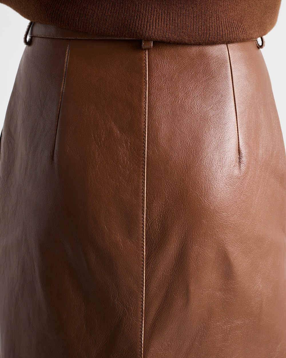 ペンシルスカートはワードローブの定番アイテムでありながら、大胆かつ洗練された表情で再解釈されています。柔らかく軽やかなナッパレザー(羊革)を使用し、ヴィンテージ仕上げによって女性らしいシルエットに奥行きとニュアンスを加えています。