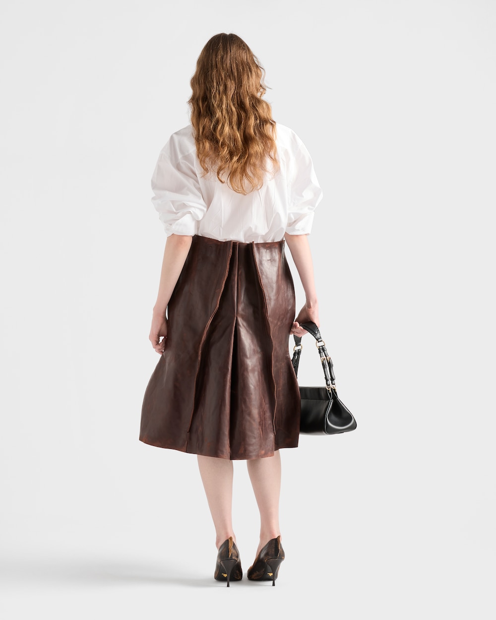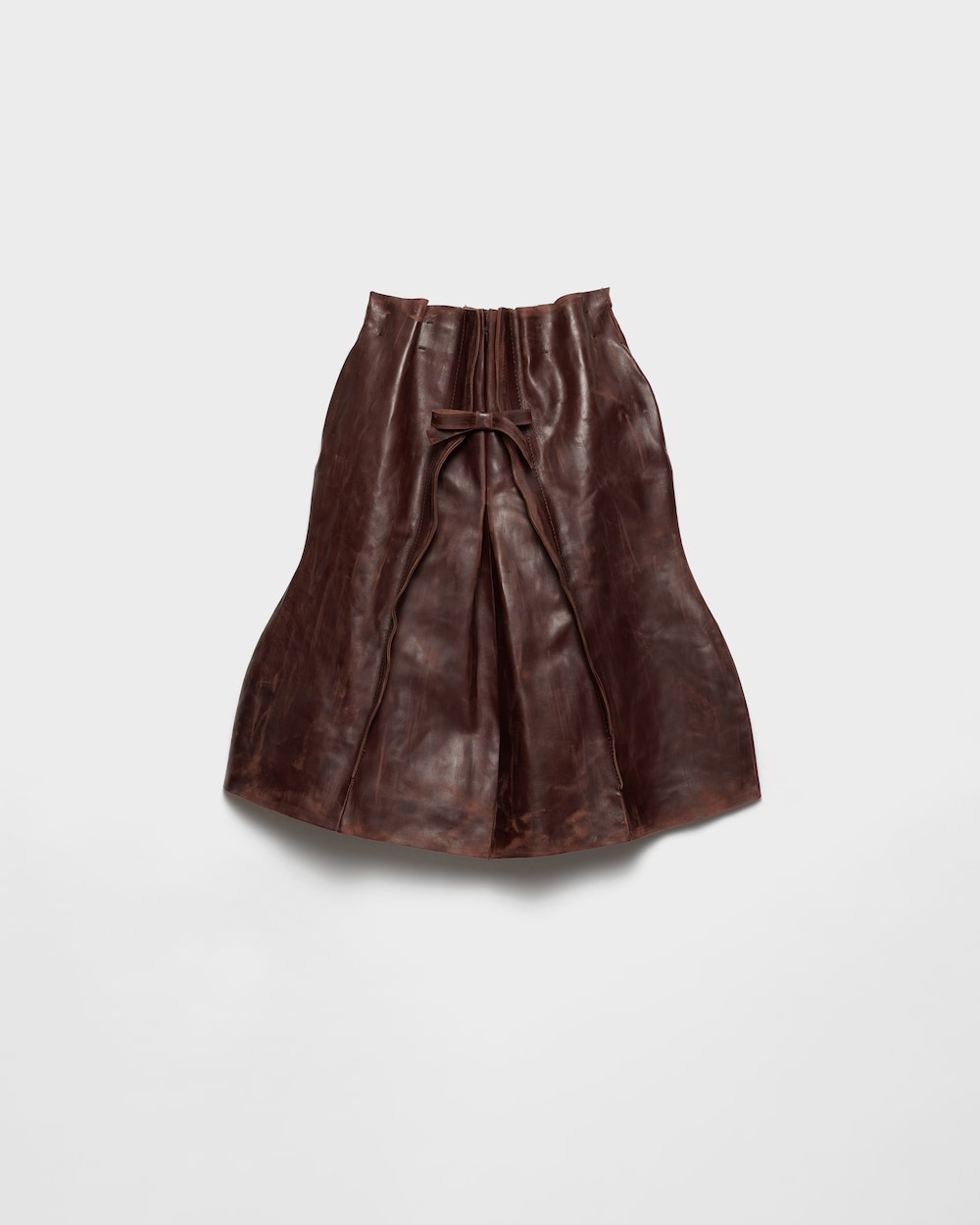 2025年秋冬コレクションは、女性らしさという概念に問いを投げかけ、その象徴的なウェアを再定義します。ヴィンテージ仕上げのレザーを使用したこのスカートは、ウエストの柔らかなドレープ、縫い目のステッチ、そして上品なトーンのリボンが特徴です。