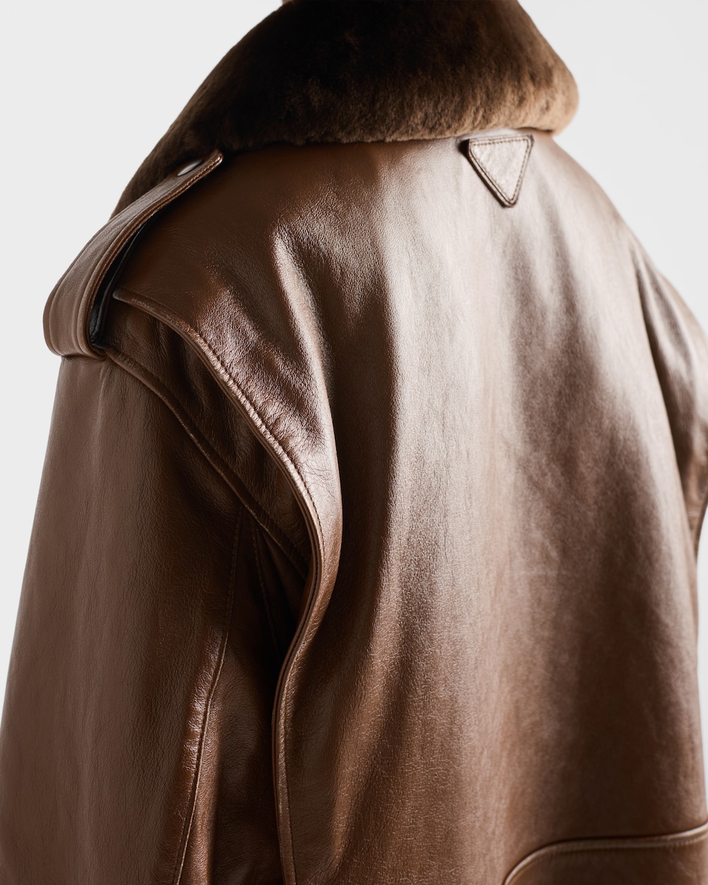 オーバーサイズデザインでメンズコレクションのシルエットを再解釈したボンバージャケット。ヴィンテージ仕上げが施されたナッパレザー(羊革)を使用し、クラシックな魅力と洗練されたスタイルを融合させています。軽量のパッド入り構造に加え、内側にはキルティングを施し、柔らかなシアリングの襟がアクセントとしてあしらわれています。