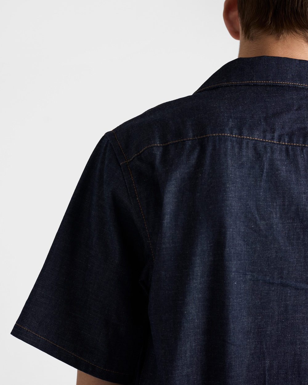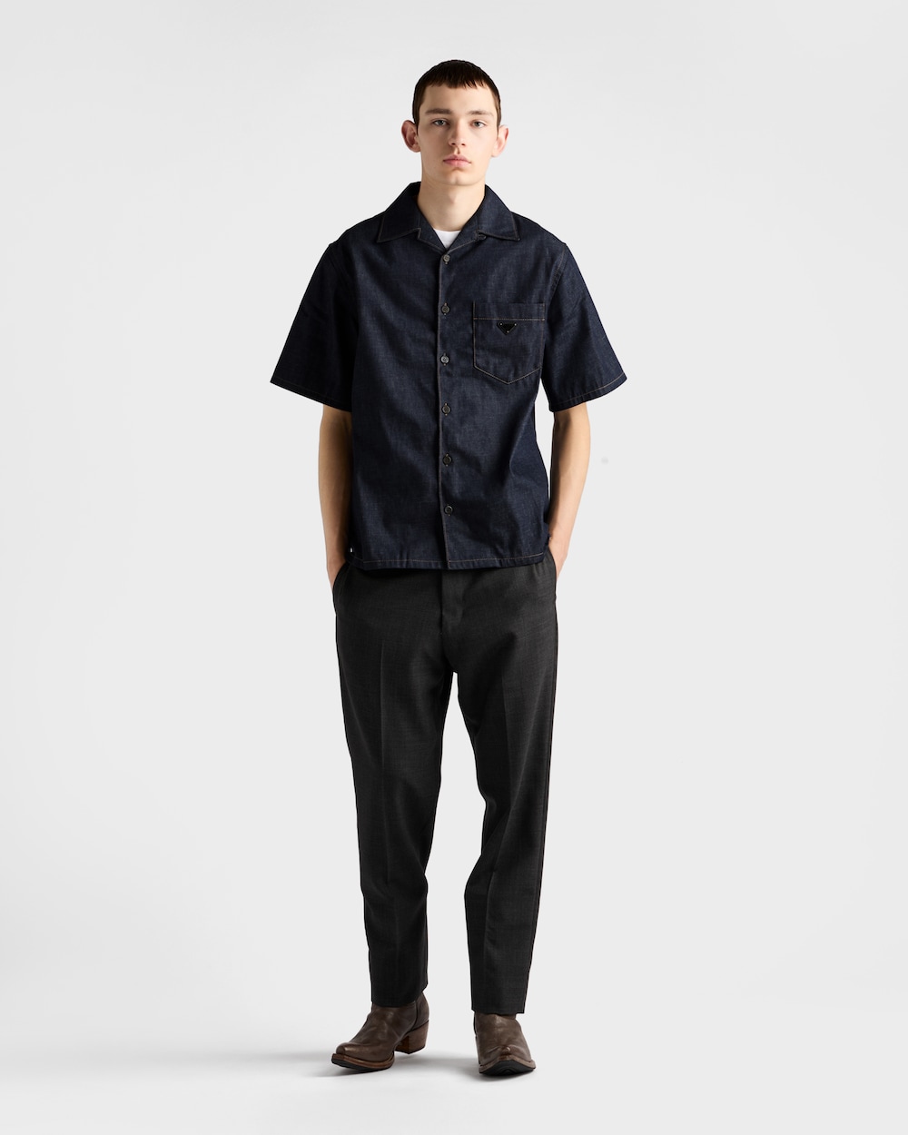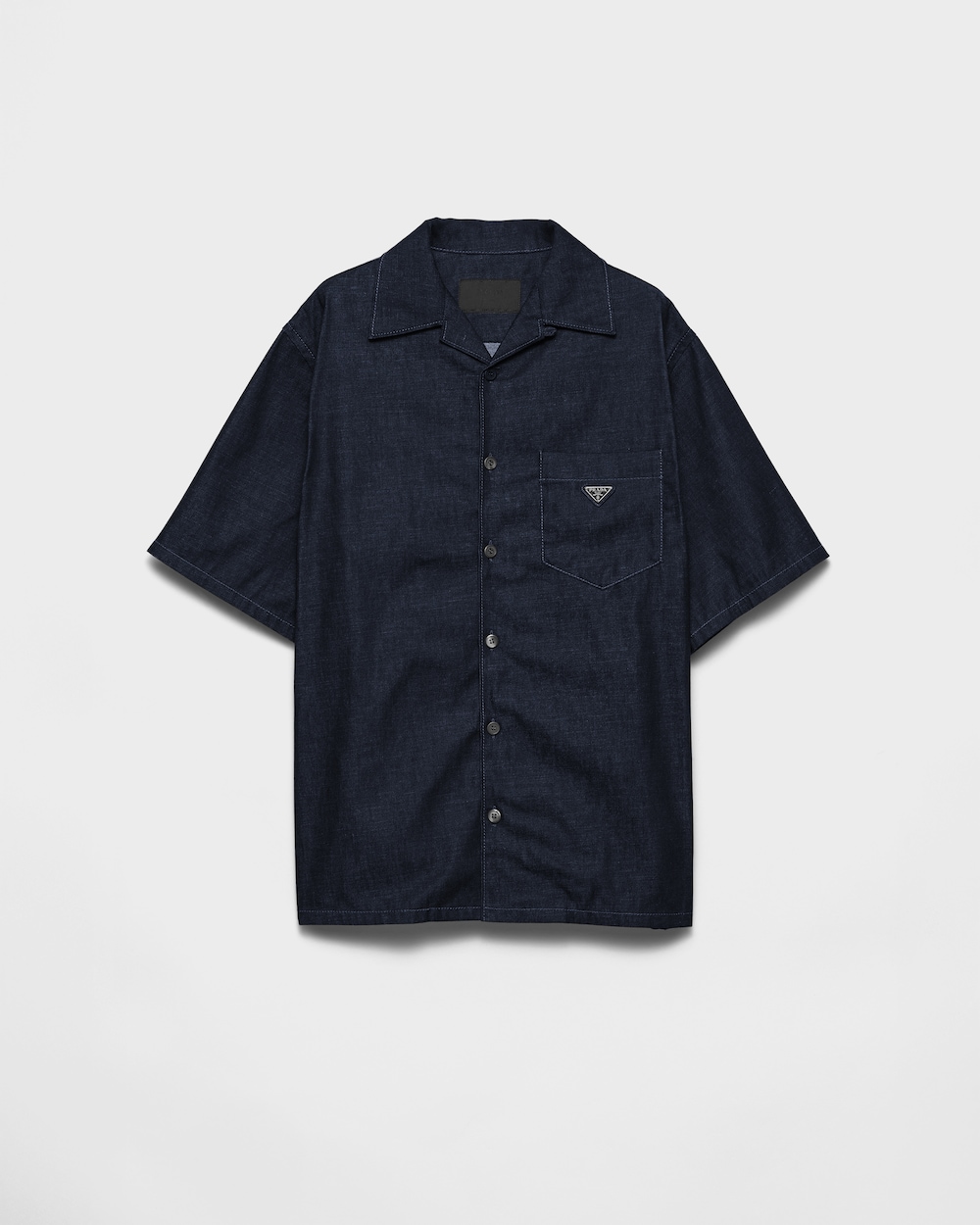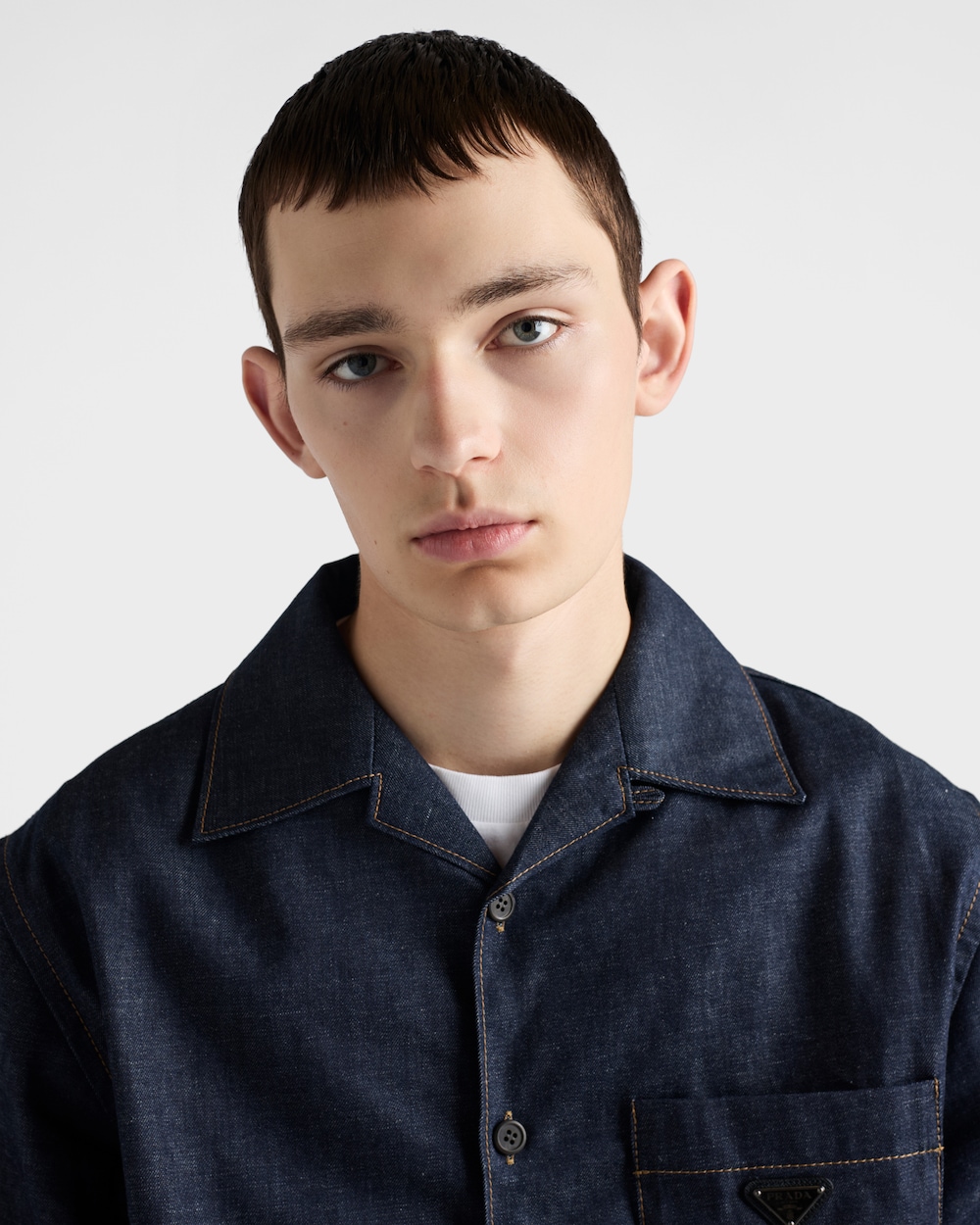 プラダのワードローブの定番であるボウリングシャツは、毎シーズン、新たなディテールと素材によって再解釈されます。コントラストの効いたトップステッチを施した生デニムを使用し、洗練されたミニマルな魅力を備えたスタイルに仕上がっています。