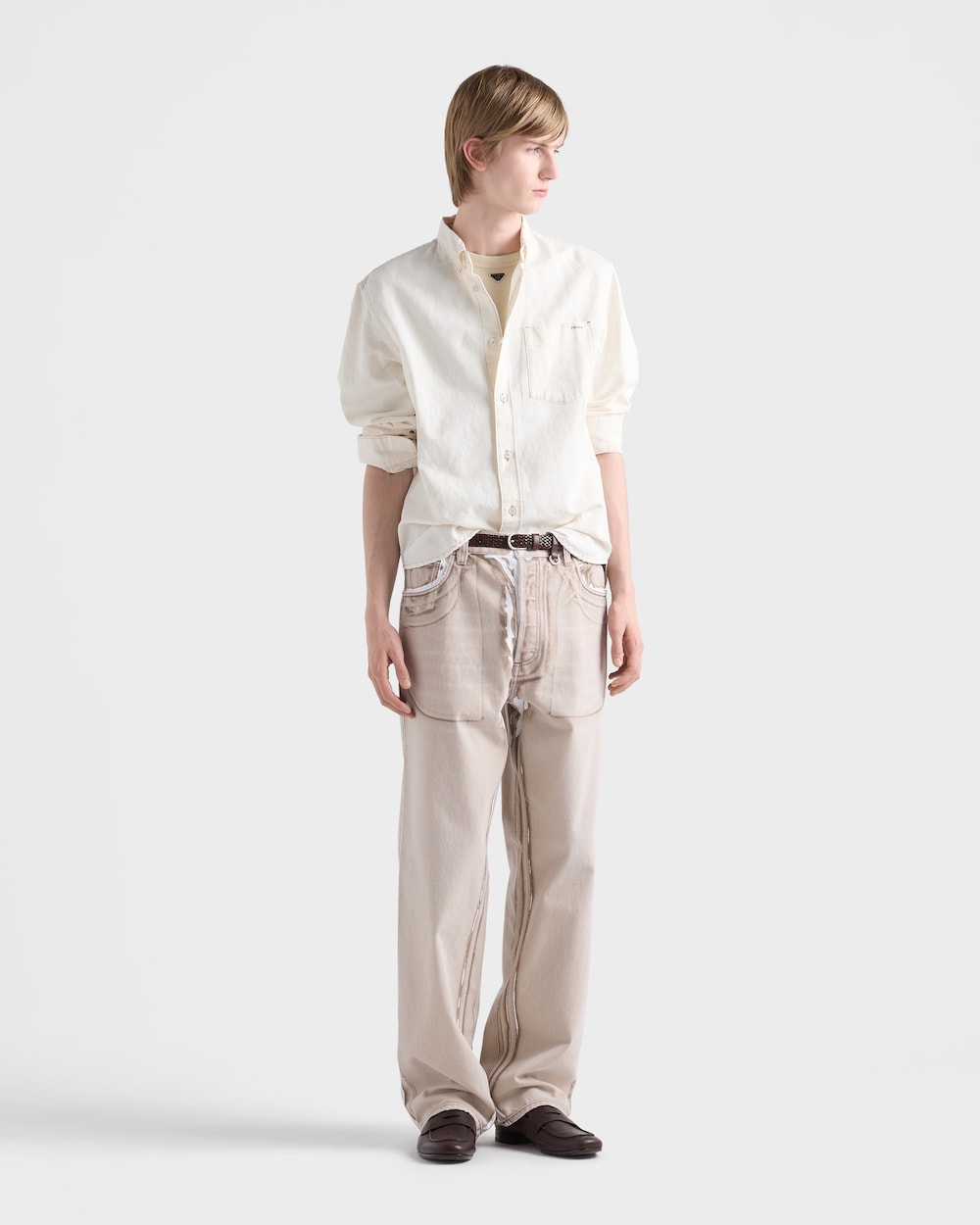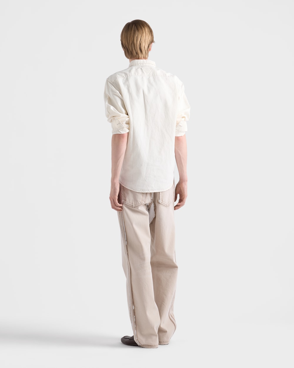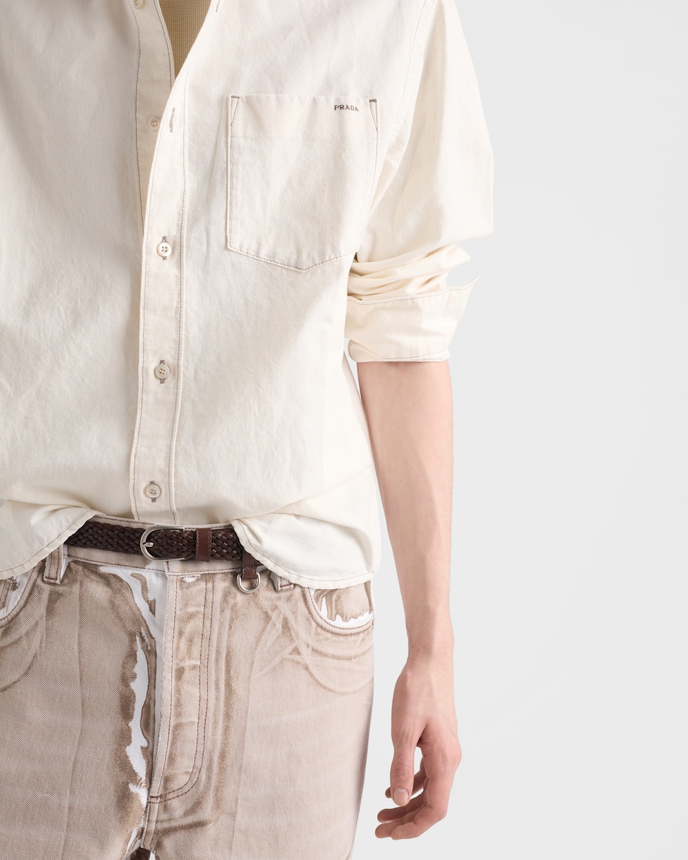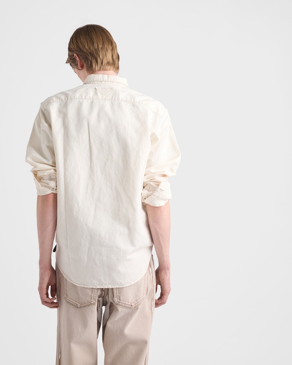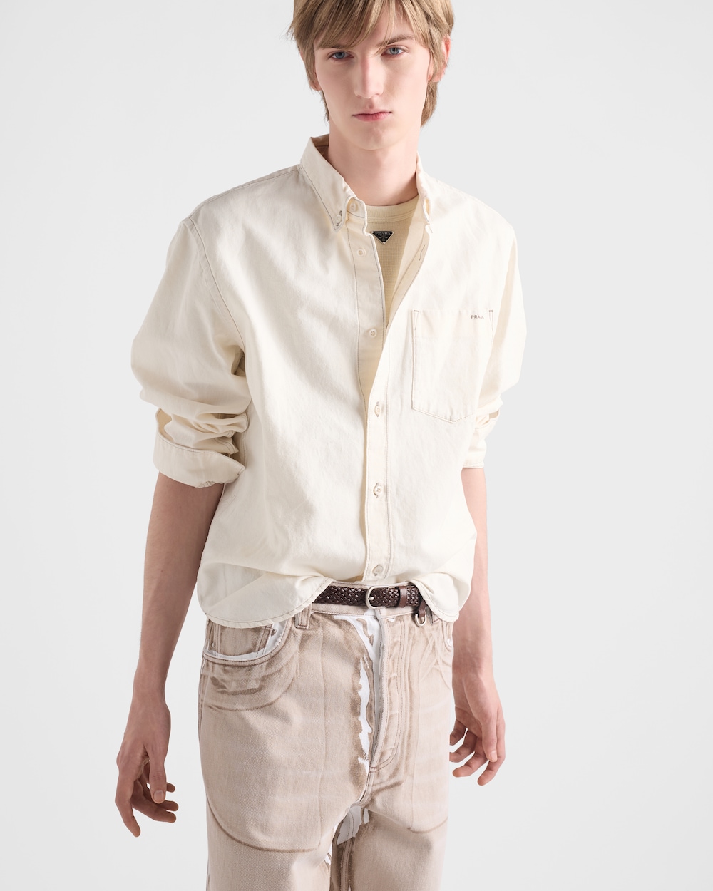 柔らかな肌触りと繊細な質感が特徴のシャンブレーシャツ。夏にぴったりのかっちりとした造りの衣服です。クラシックなシルエットがタイムレスな魅力を表現し、ファブリックのトライアングルロゴがアイコニックなアクセントを加えます。