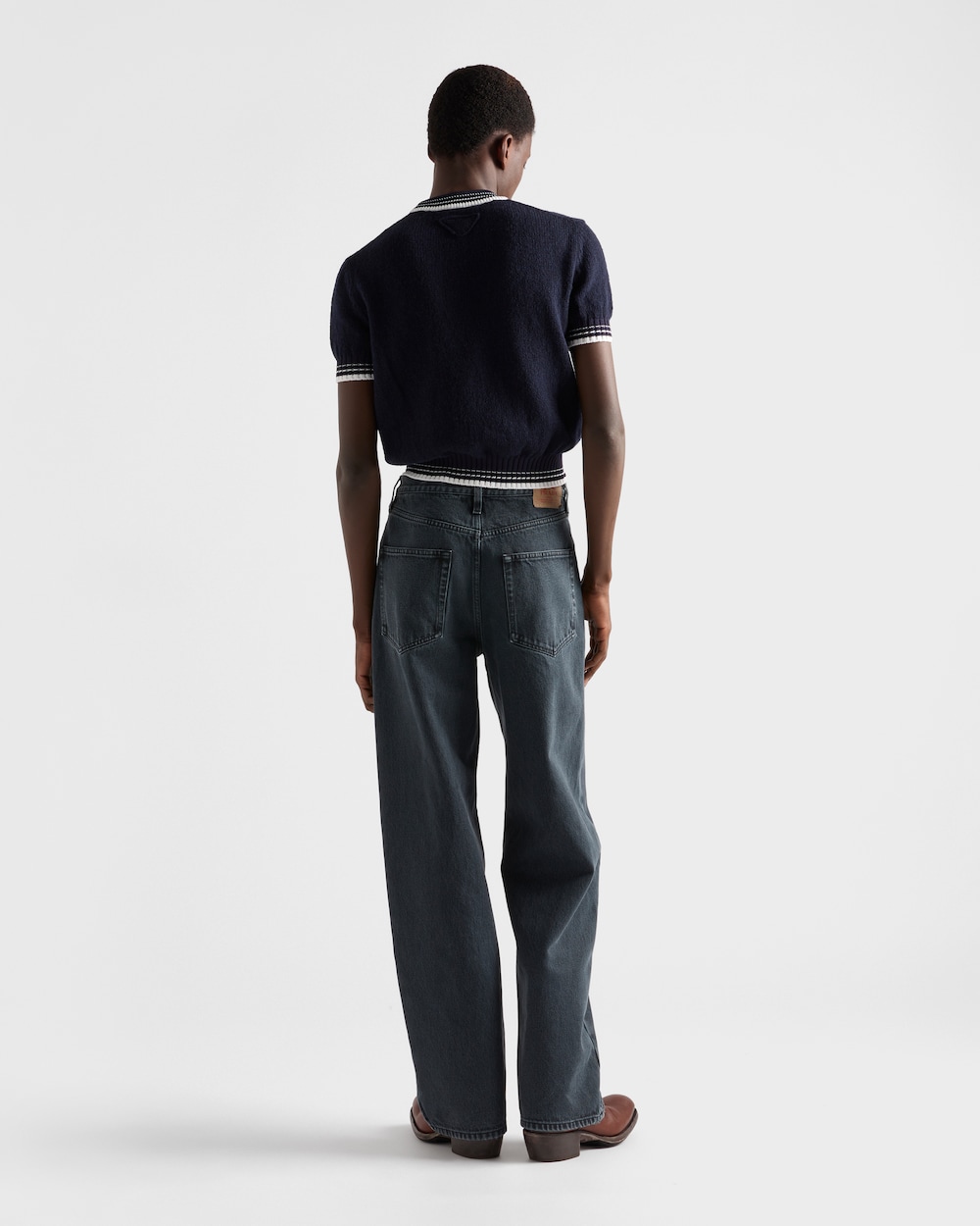 デニム、再解釈。オーバーダイ加工と柔らかなラインが自由な形を作り出します。テクニカルなディテールとプラダ ミラノラベルが、本能的で都会的な新しい日常を表現します。