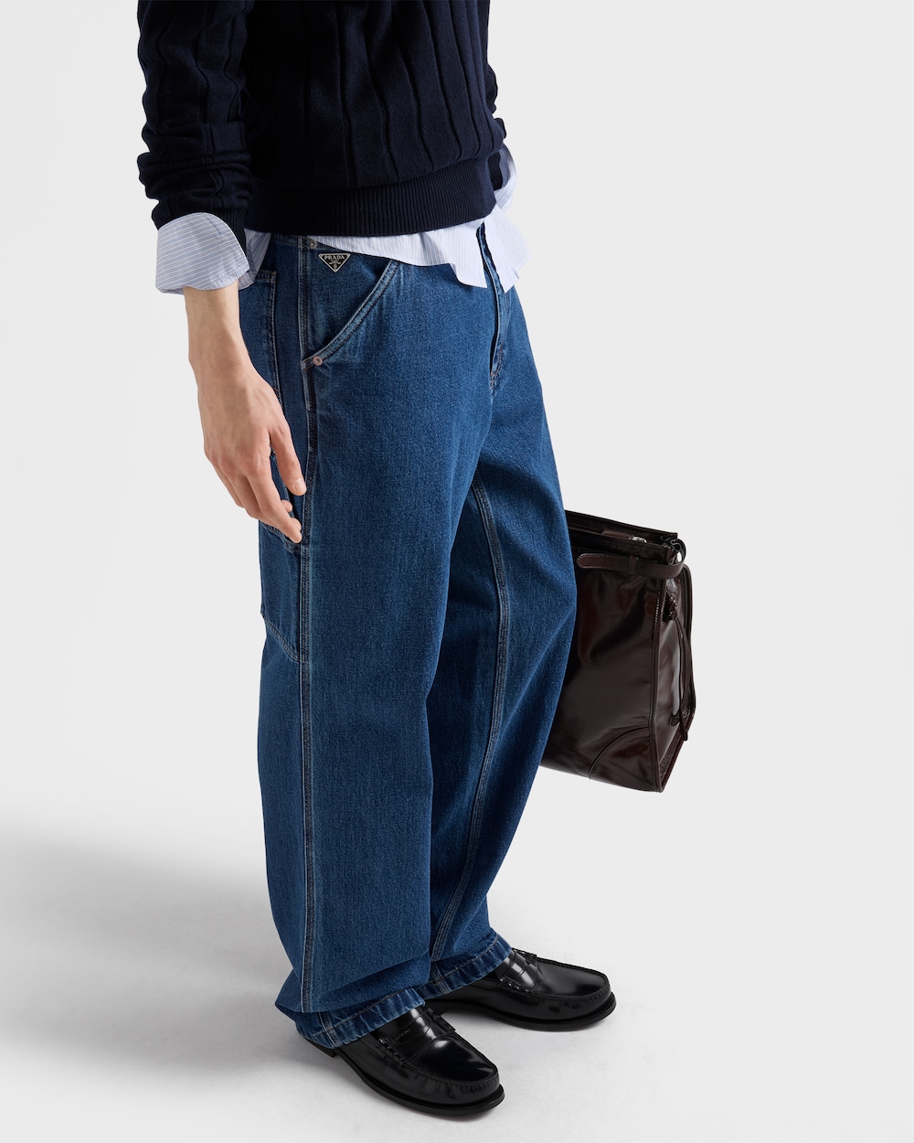 柔らかくリラックスしたフィット感のジーンズ。ヴィンテージ仕上げを施し、デニムの独特な質感を引き立てています。5ポケットスタイルは、アイコニックなプラダトライアングルロゴで完成されています。