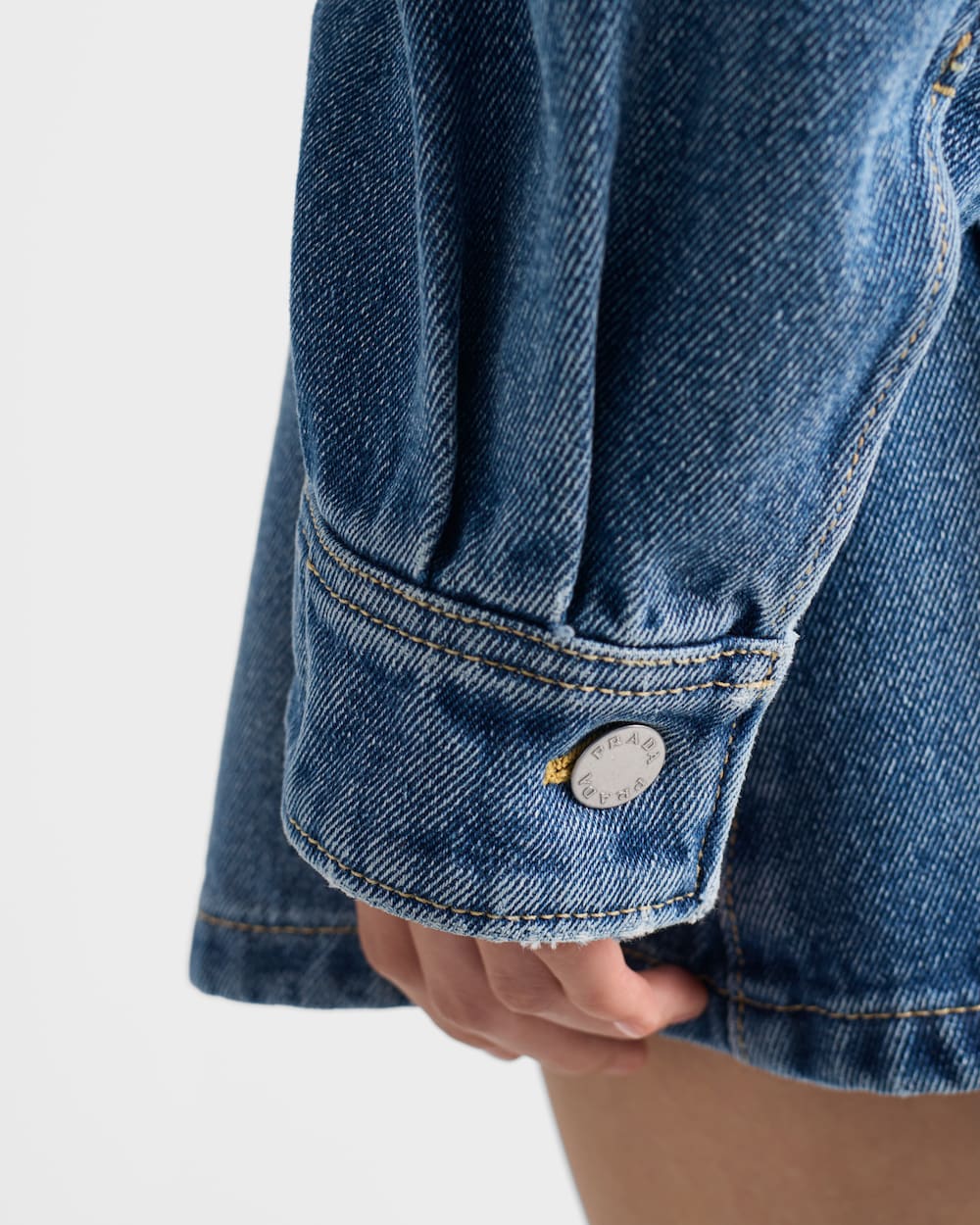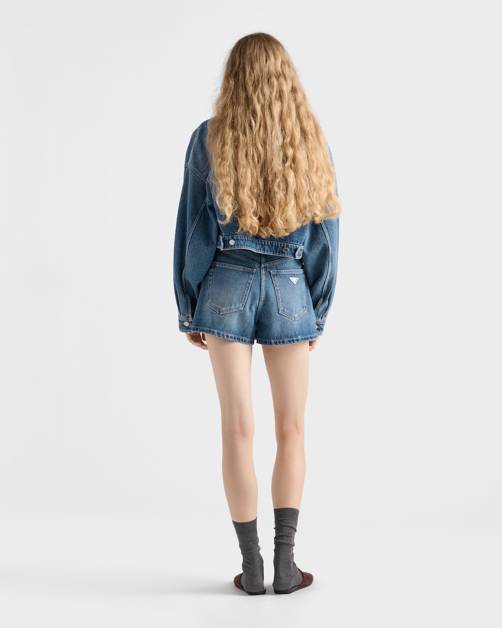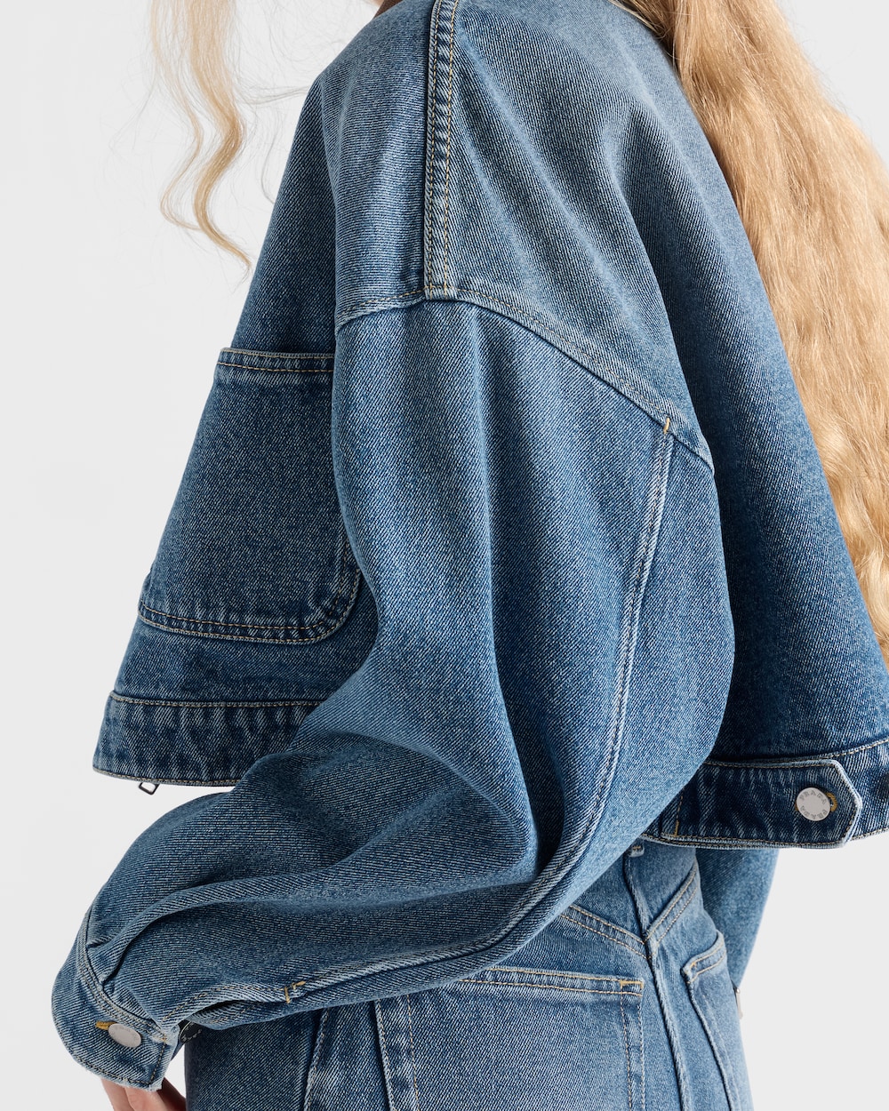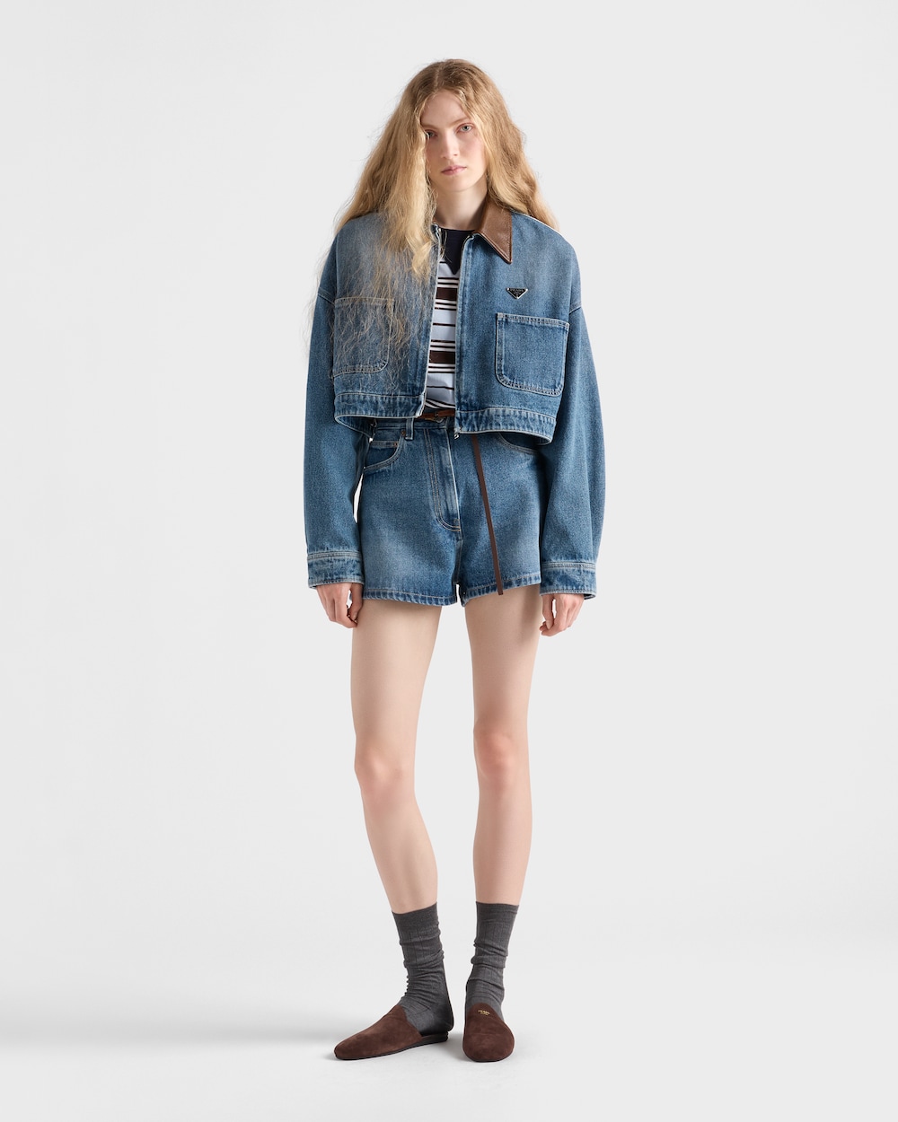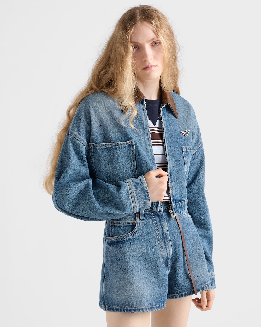 デニムジャケットは、現代的なデザインと洗練されたディテールで再解釈されています。クロップドカットのウェアは、レザーの襟で装飾され、アイコニックなエナメルメタルトライアングルロゴがアクセントを添えています。