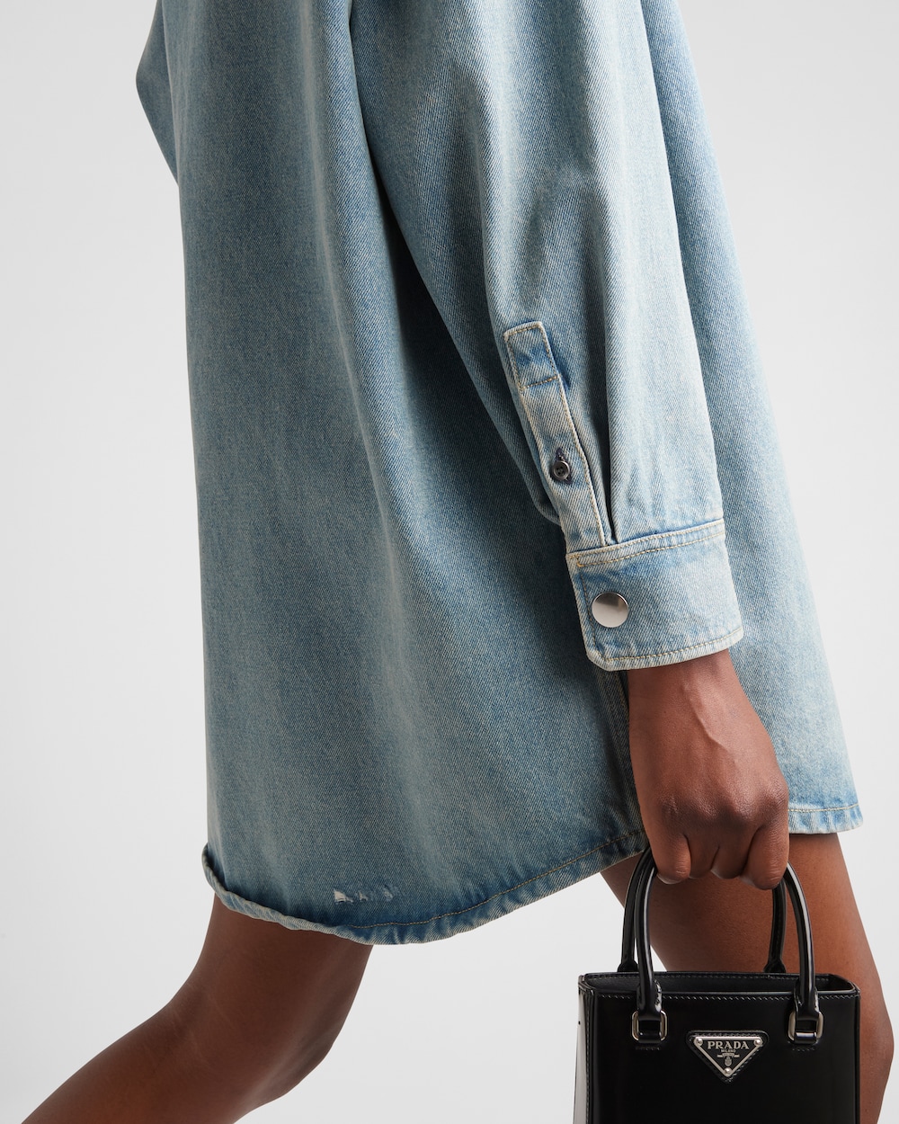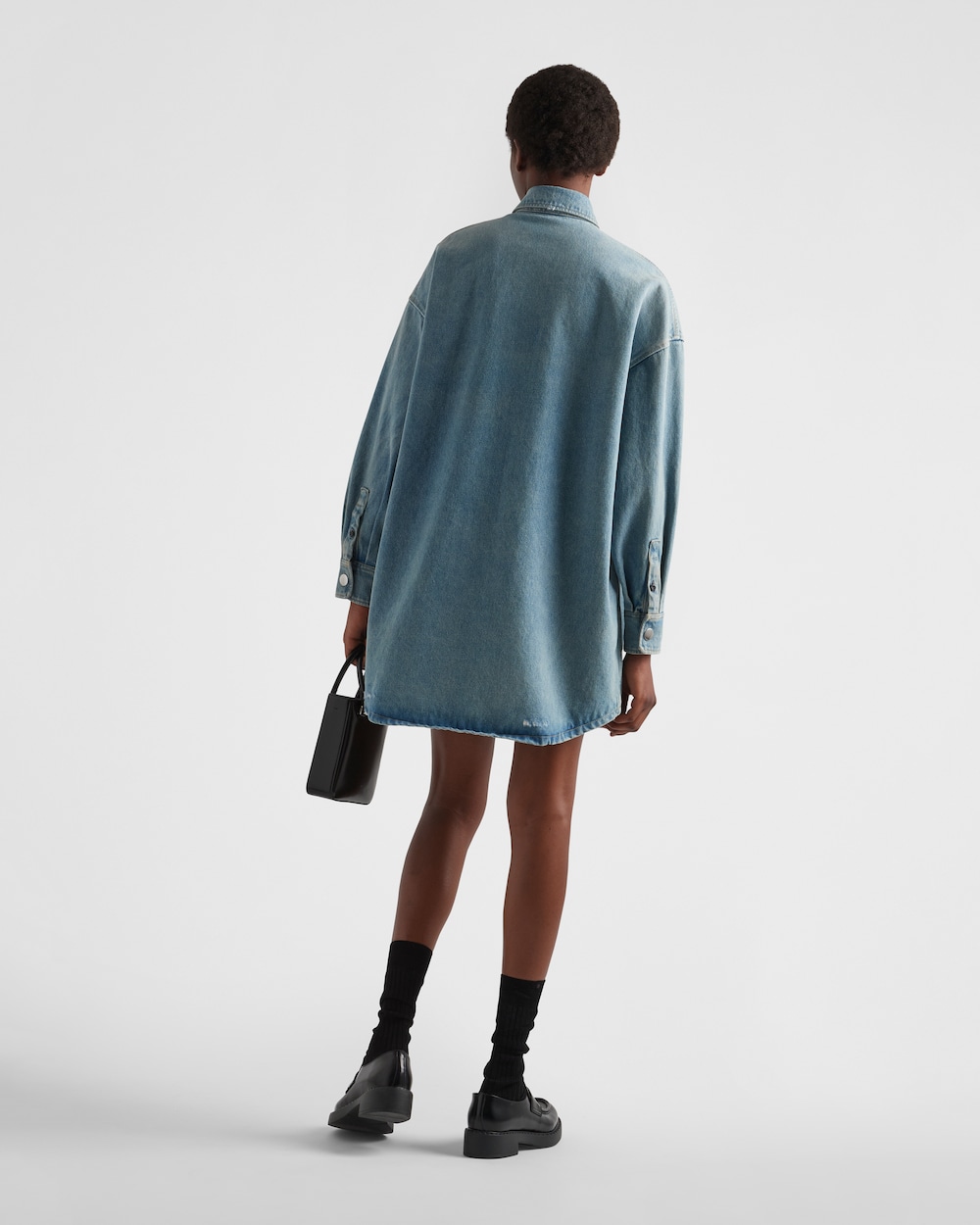 ウォッシュ加工でヴィンテージな風合いに仕上げたオーガニックデニムを使用した、スポーティなディテールが特徴のオーバーサイズ シャツ。コントラストの効いたステッチでシルエットを際立たせ、アイコニックなエナメル トライアングルロゴ付パッチポケットのアクセントをプラスしたデザイン。