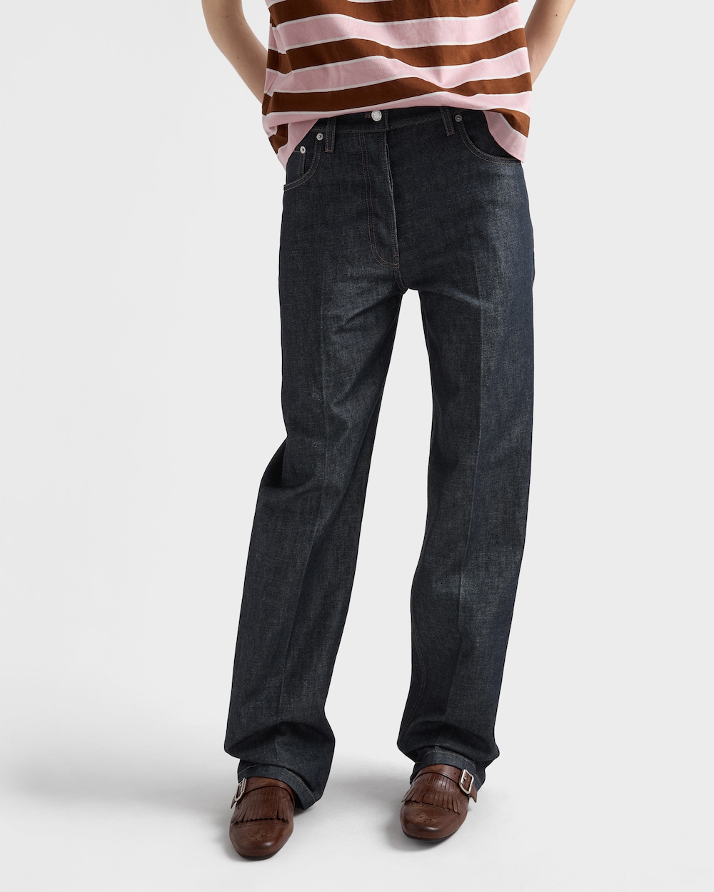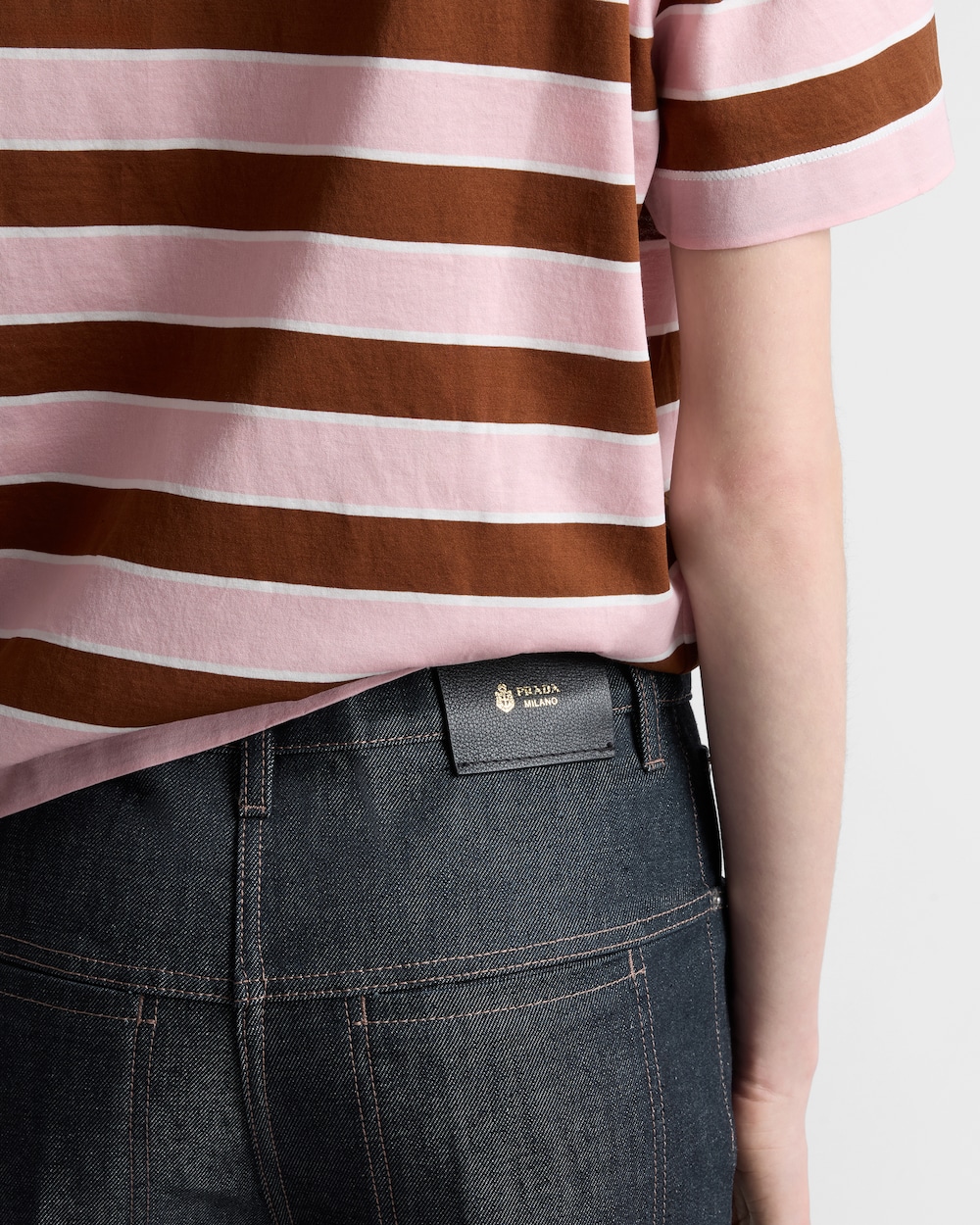 時代を超越したクラシックなアイテムにディテールを加えたデザイン。ノンウォッシュデニム、コントラストの効いたトップステッチ、精密な構造。レギュラーフィットが自然なエレガンスで動きをサポートし、Prada Milano レザーのパッチがアイコニックな真正性を確立します。