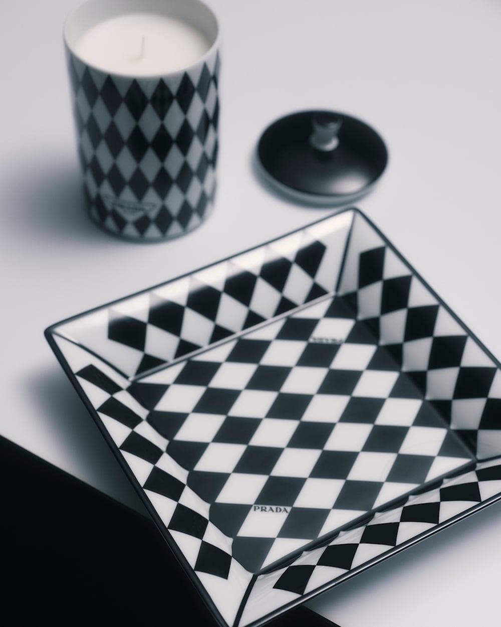 洗練されたデザインのキャッチオールトレー。ミラノのガレリア・ヴィットリオ・エマヌエーレⅡ世にある、歴史的なプラダ第一号店の大理石の床を彷彿とさせる、アイコニックな白黒の格子柄のモチーフで飾られています。上質なポーセリンを使用した汎用性の高い洗練されたオブジェクトが、モダンなエレガンスのアクセントとして空間を引き立てます。