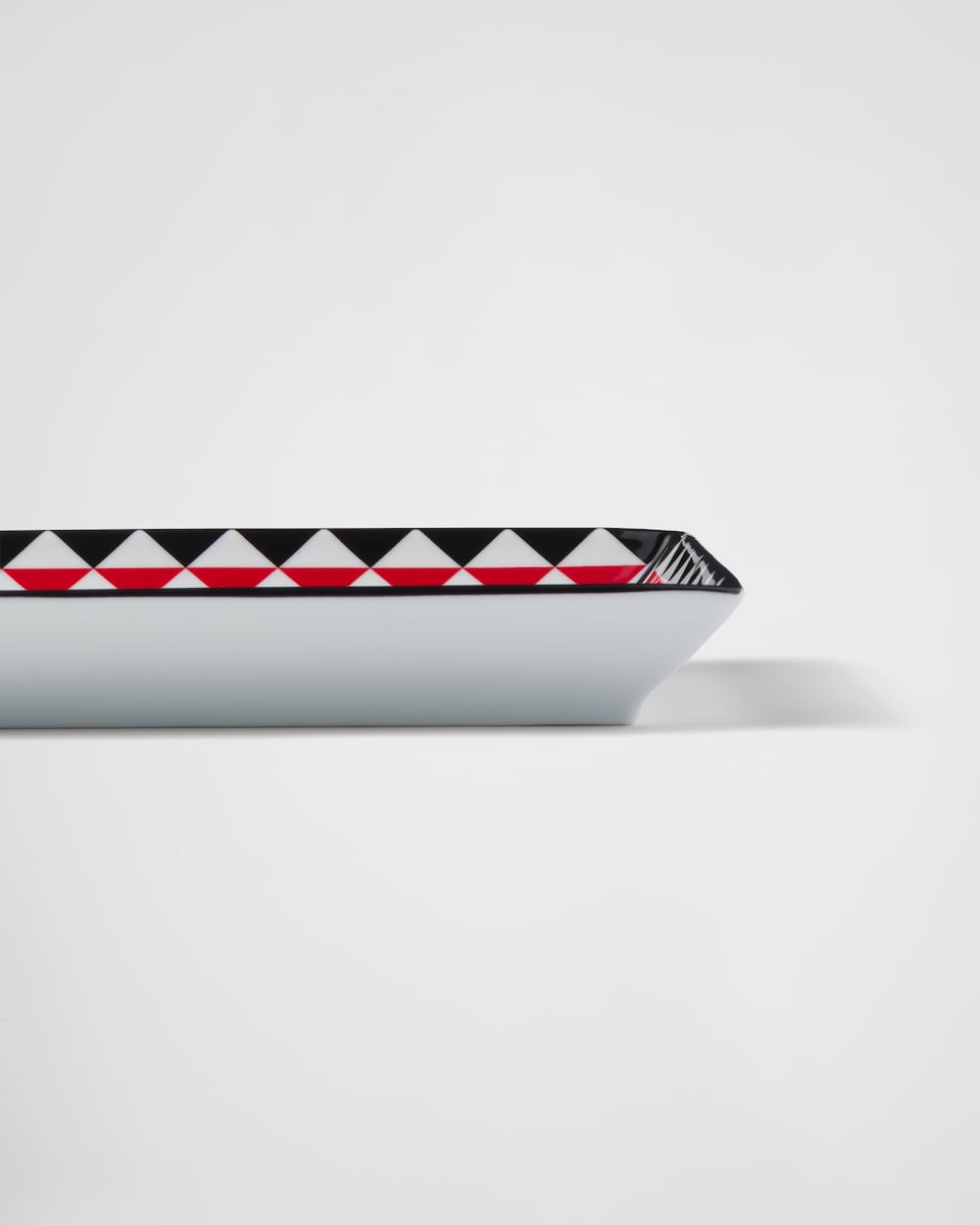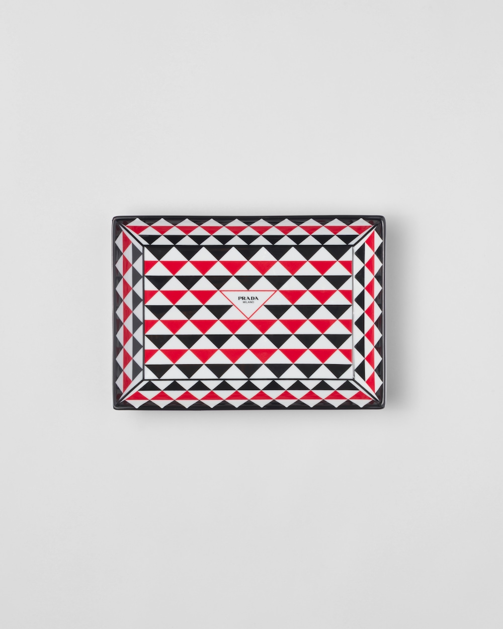 洗練されたデザインのレクタンギュラーのキャッチオールトレー。プラダのコレクションのシグネチャーである、アイコニックなトライアングルロゴを讃える幾何学モチーフで飾られています。幾何学的なラインとカラーコントラストの絶妙なバランスが際立つ、上質なポーセリンのオブジェクト。モダンで意外性のあるアクセントとして空間を引き立てます。