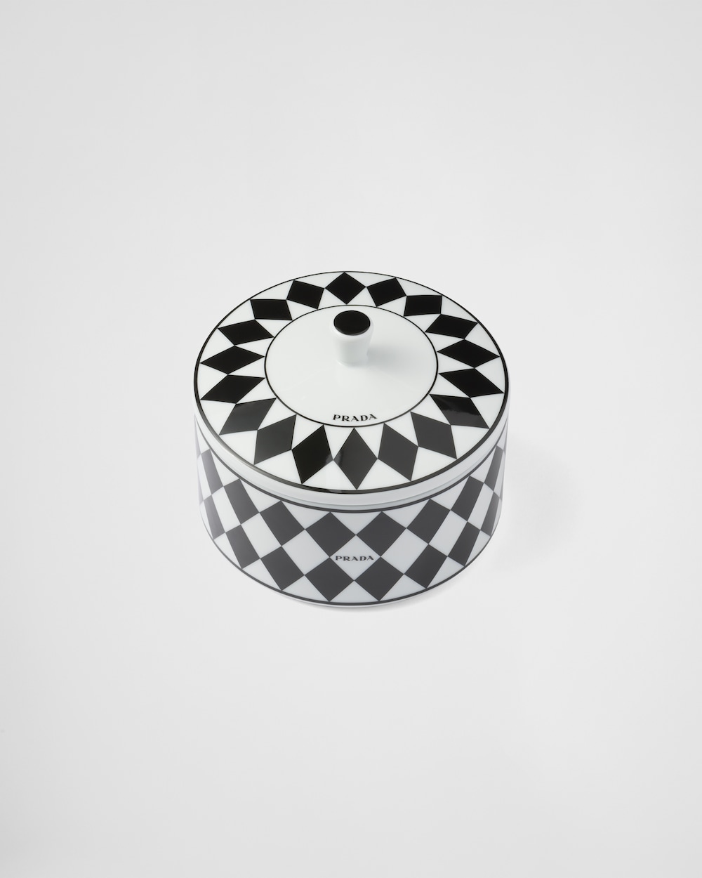 上質なポーセリンを使用した、洗練されたデザインのボックス。ミラノのガレリア・ヴィットリオ・エマヌエーレⅡ世にある、歴史的なプラダ第一号店の大理石の床を彷彿とさせる、アイコニックな白黒の格子柄のモチーフで飾られています。過去と現在の美学を取り入れたエレガントで汎用性の高いオブジェクトは、優美なジュエリーボックスとして、あるいはモダンな魅力が漂うインテリアのラグジュアリーなデザインオブジェクトとして使用できます。
