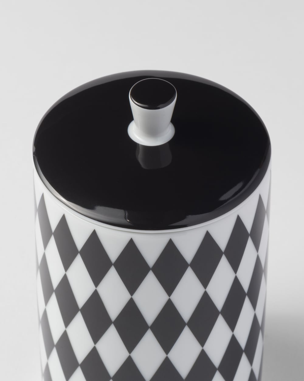モダンなデザインのポーセリンのキャンドルホルダー。ミラノのガレリア・ヴィットリオ・エマヌエーレⅡ世にある、歴史的なプラダ第一号店のアイコニックな白黒の市松模様の床を彷彿とさせる、幾何学模様のモチーフで飾られています。ドワーフミント、アイリス、ムスクの調和のとれたブレンド、エクスクルーシブなMentheフレグランスのフレッシュで洗練された香りが詰まったラグジュアリーなデザインオブジェクト。