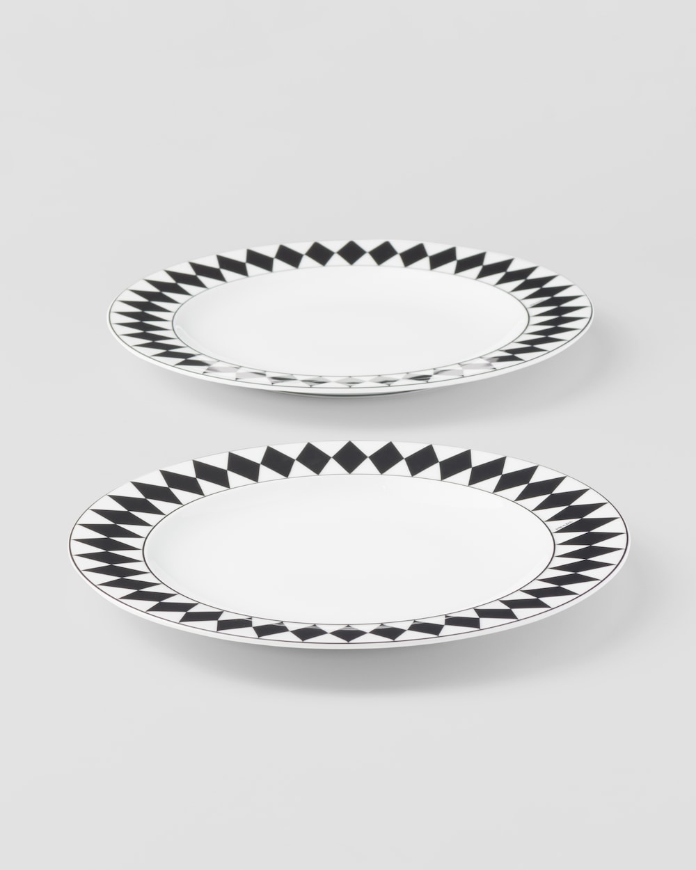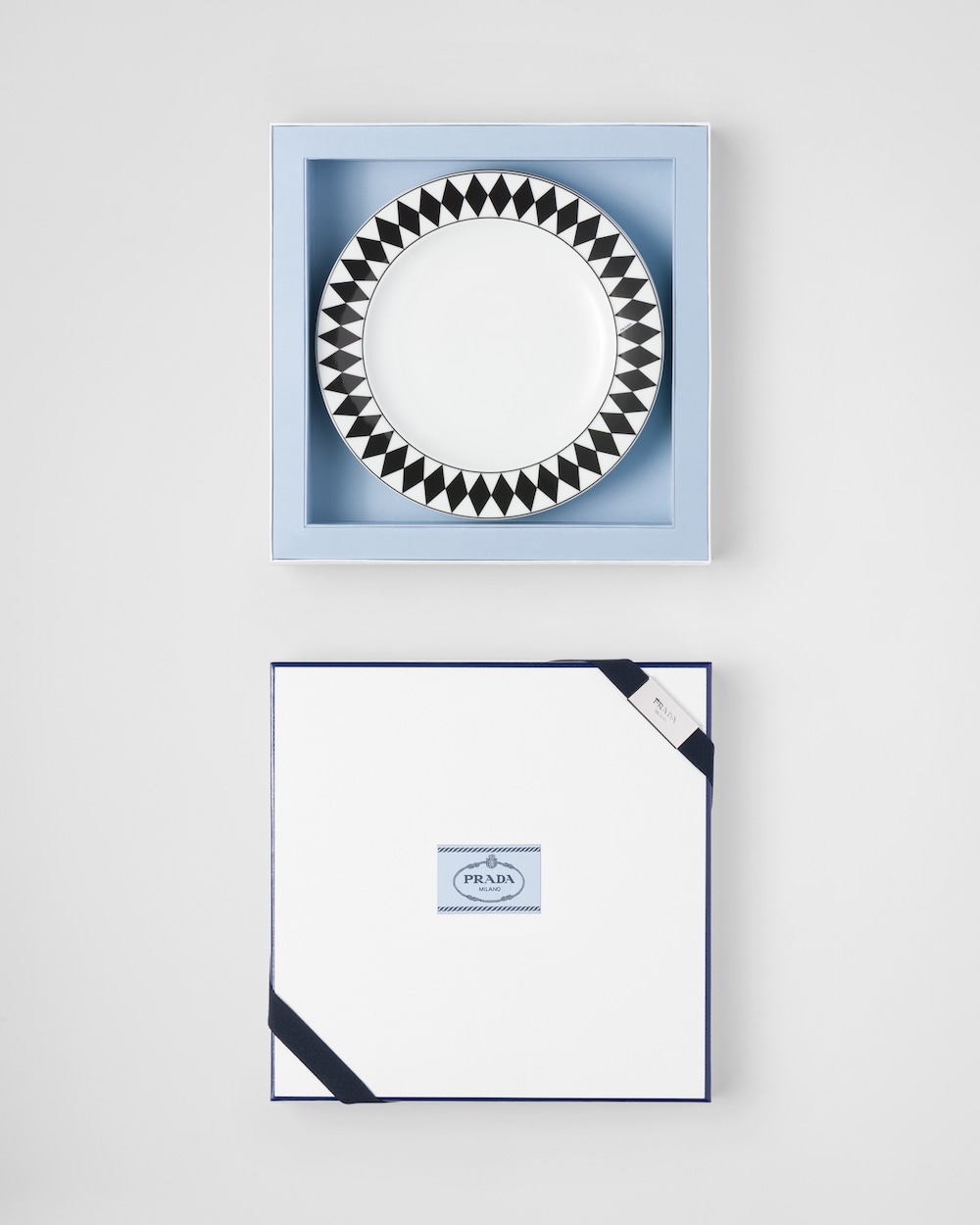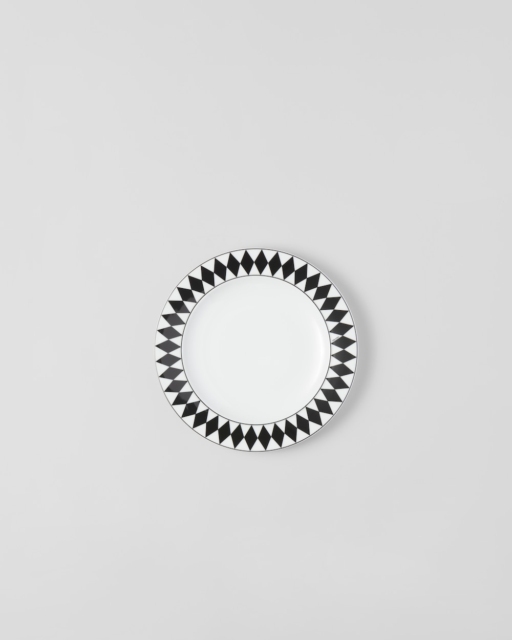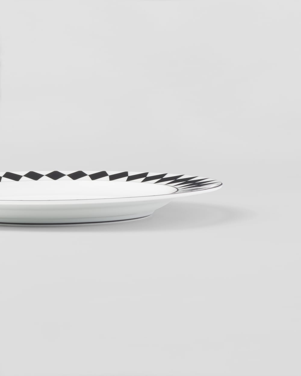 エレガントな魅力にあふれるディナープレート。ミラノのガレリア・ヴィットリオ・エマヌエーレⅡ世にある、歴史的なプラダ第一号店の白黒の市松模様の大理石の床を彷彿とさせる、アイコニックな格子柄のモチーフで飾られています。洗練とクラフツマンシップを象徴する底の手塗りの装飾ラインが、デザインを引き立てています。モダンで洗練された雰囲気でテーブルを彩る、上質なポーセリンを使用したセット。