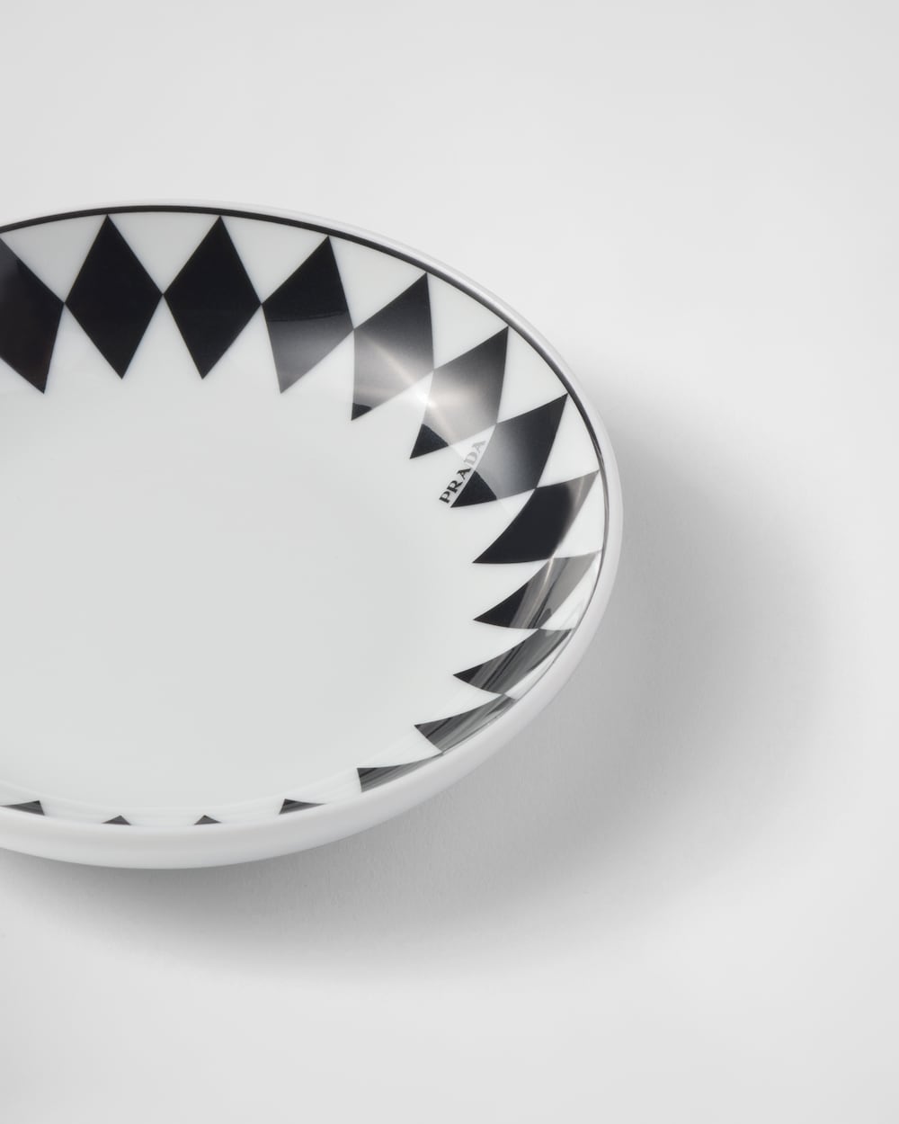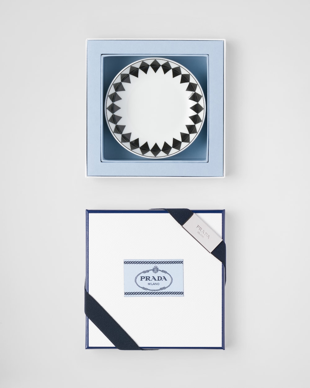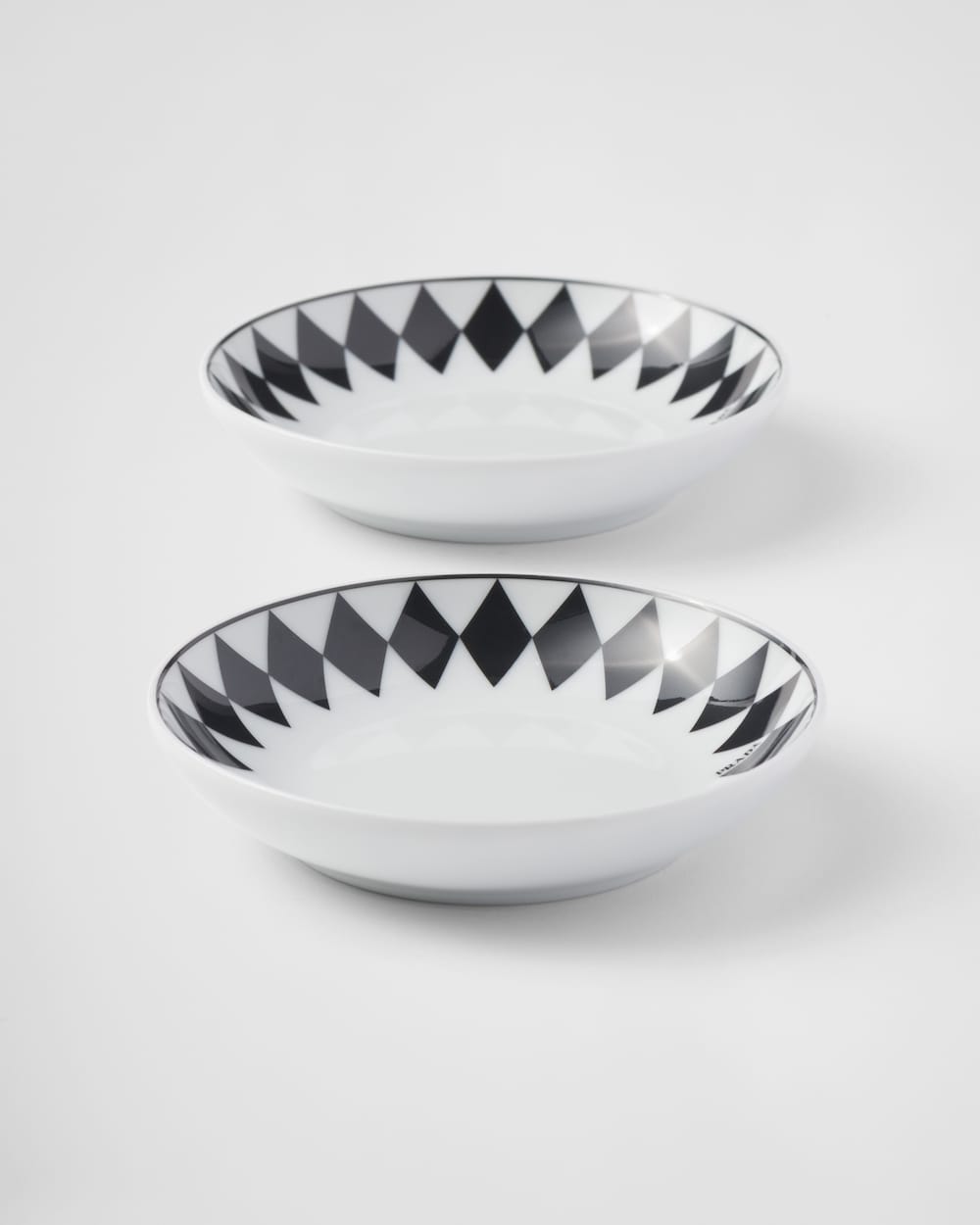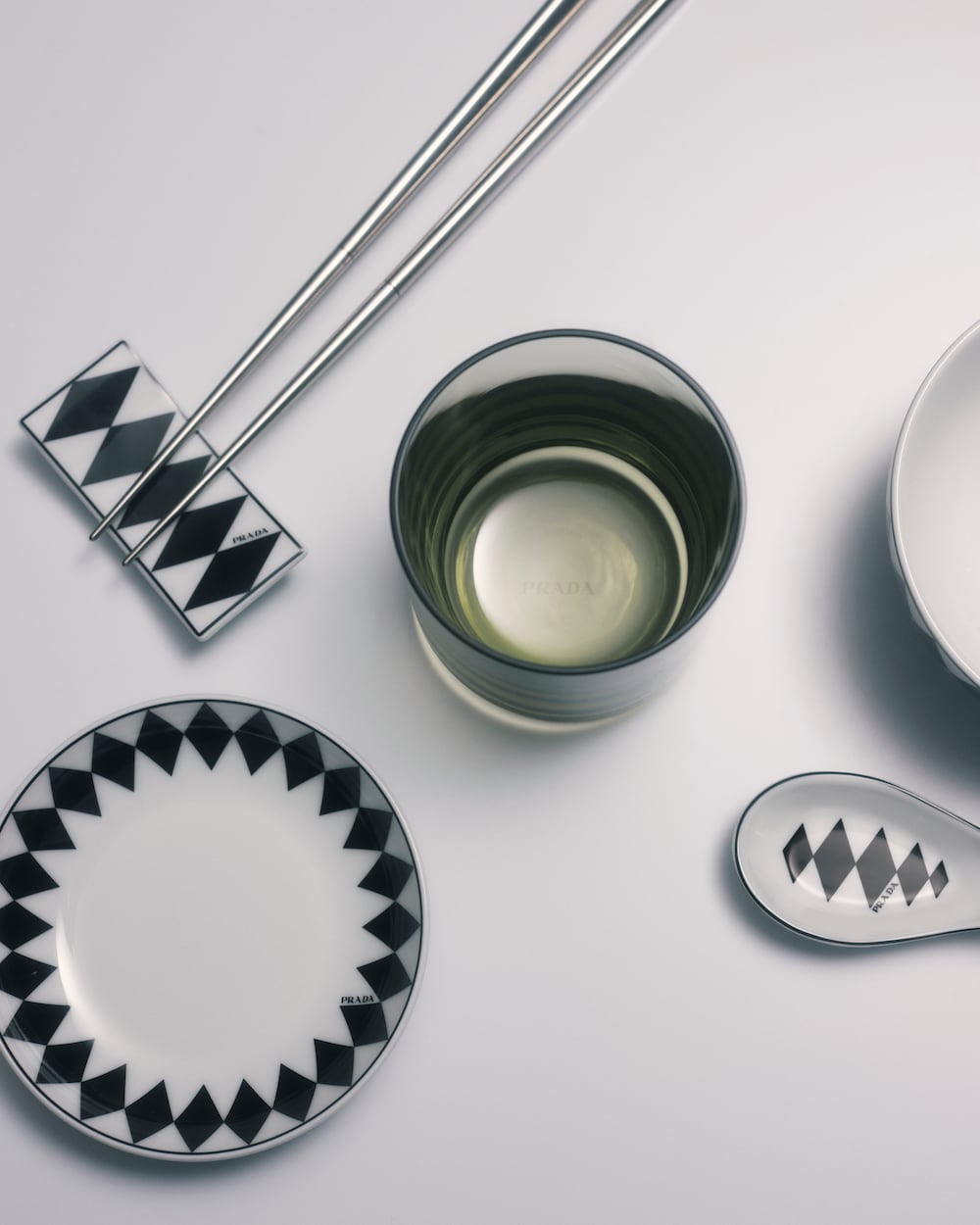 上質なポーセリンのソースボウルセット。ミラノのガレリア・ヴィットリオ・エマヌエーレⅡ世にある、歴史的なプラダ第一号店の白黒の市松模様の大理石の床を彷彿とさせる、アイコニックな格子柄のモチーフで飾られています。洗練されたラインが魅力的なセットは、テーブルセッティングに最適。エレガントでモダンにテーブルを彩ります。
