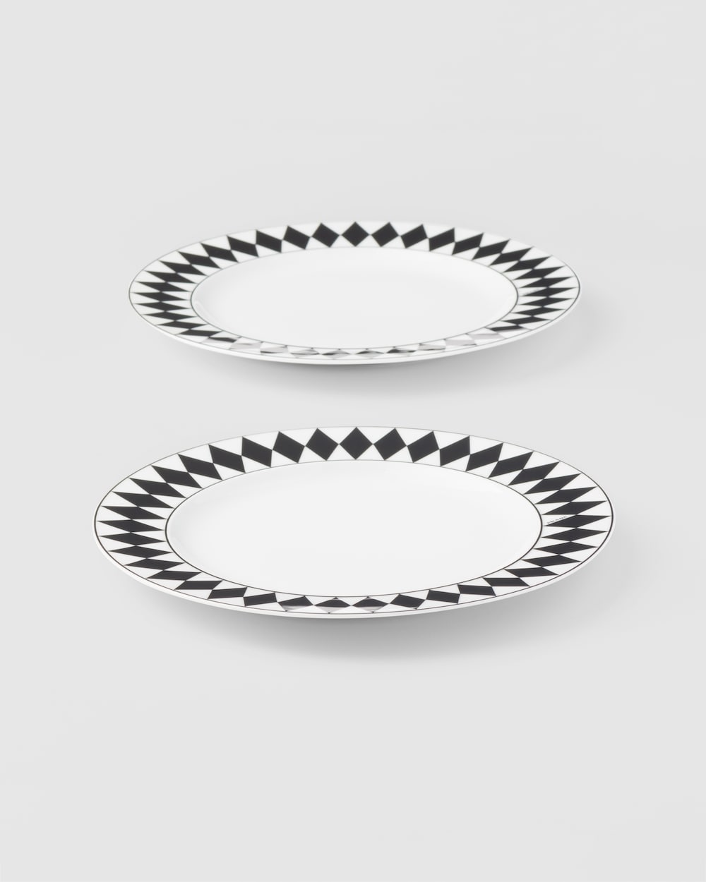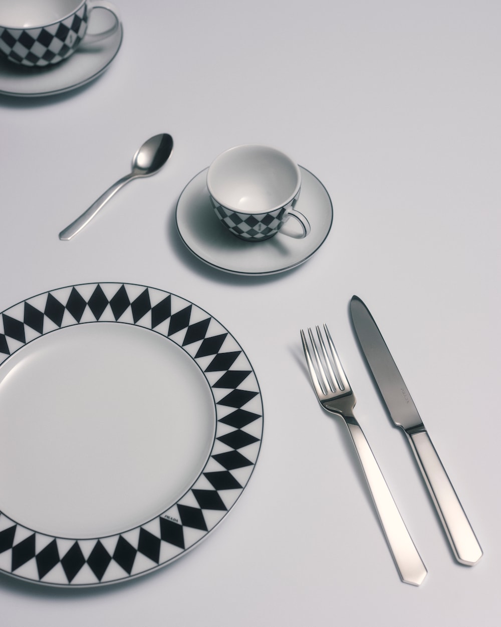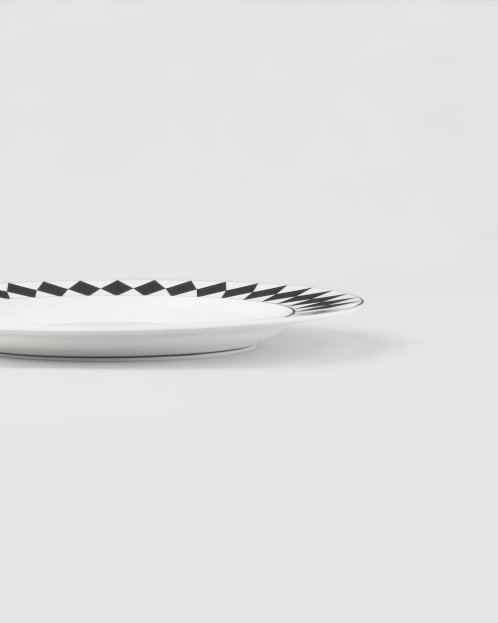エレガントなデザインのデザートプレート。ミラノのガレリア・ヴィットリオ・エマヌエーレⅡ世にある、歴史的なプラダ第一号店の白黒の市松模様の大理石の床を彷彿とさせる、アイコニックな格子柄のモチーフで飾られています。洗練とクラフツマンシップを象徴する底の手塗りの装飾ラインが、デザインを引き立てています。モダンで洗練された雰囲気でテーブルを彩る、上質なポーセリンを使用したセット。