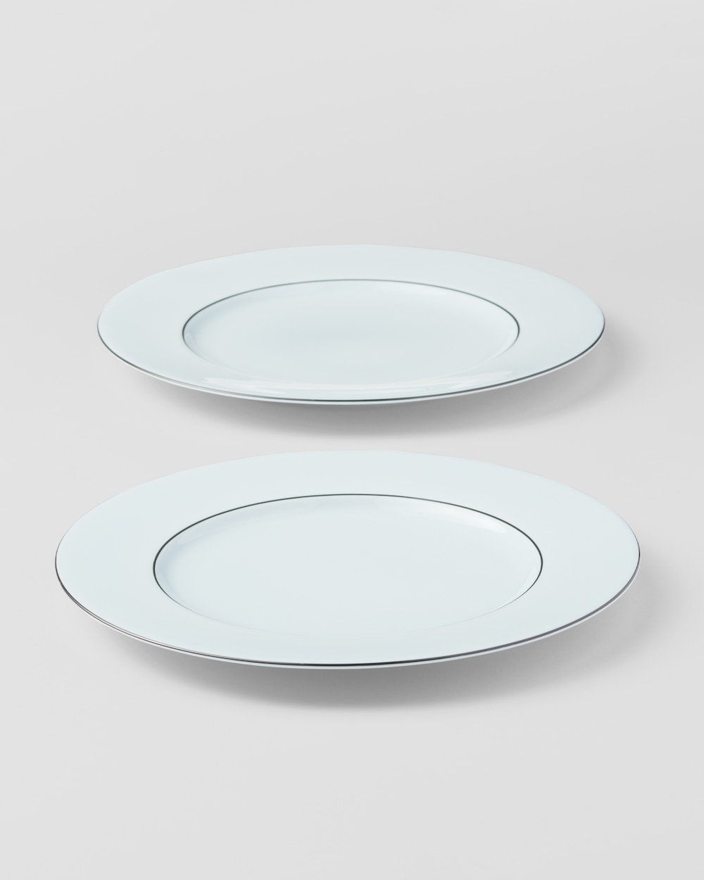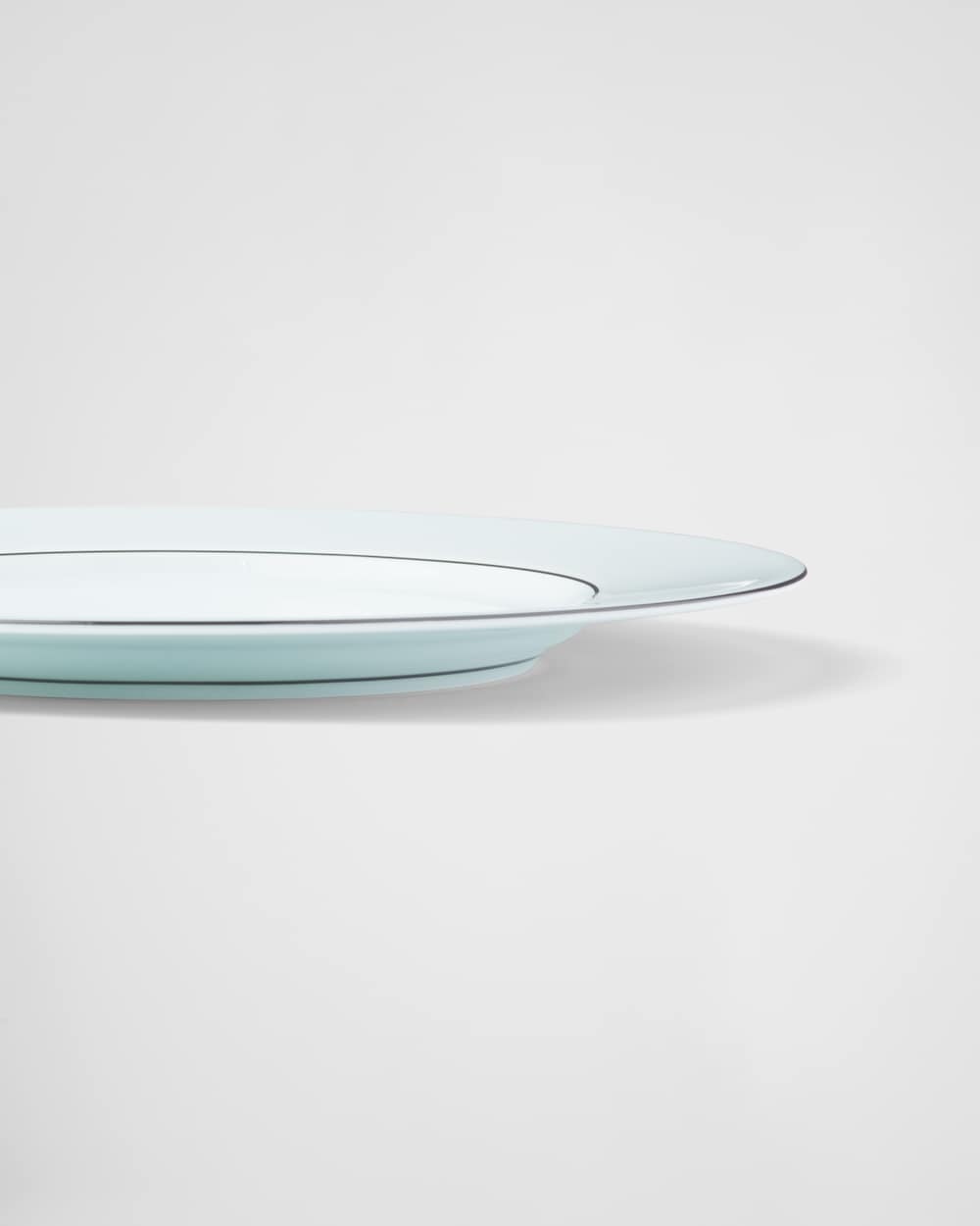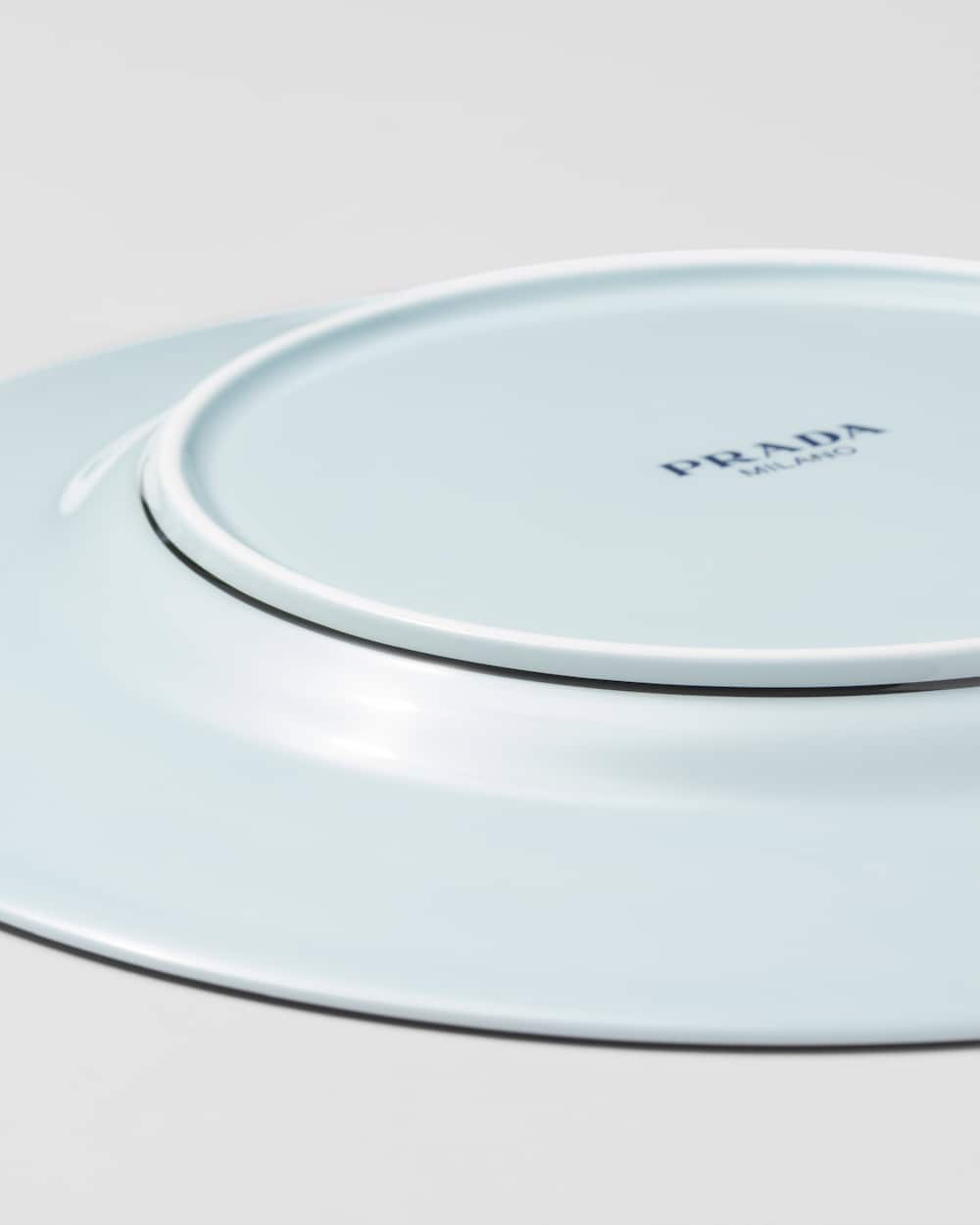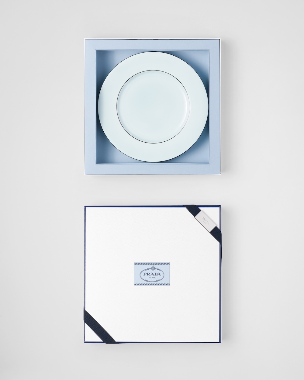 釉薬のかかった上質なポーセリンを使用し、職人技とプラダのデザインコードを洗練されたモダンなデザインに融合したディナープレート。日本の青磁器に着想を得て、アイコニックで繊細なニュアンスに美しい手塗りの縁を施したアイテム。