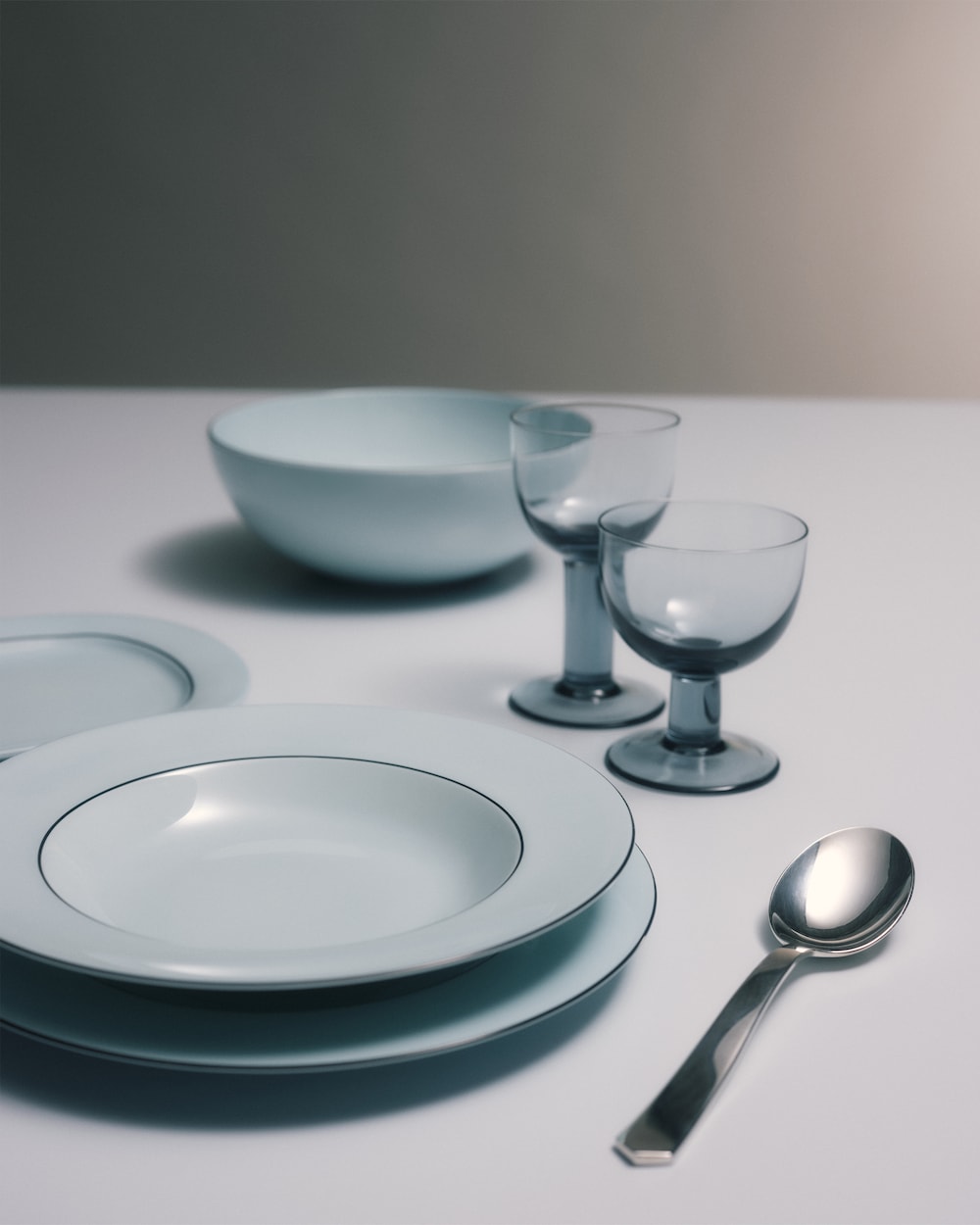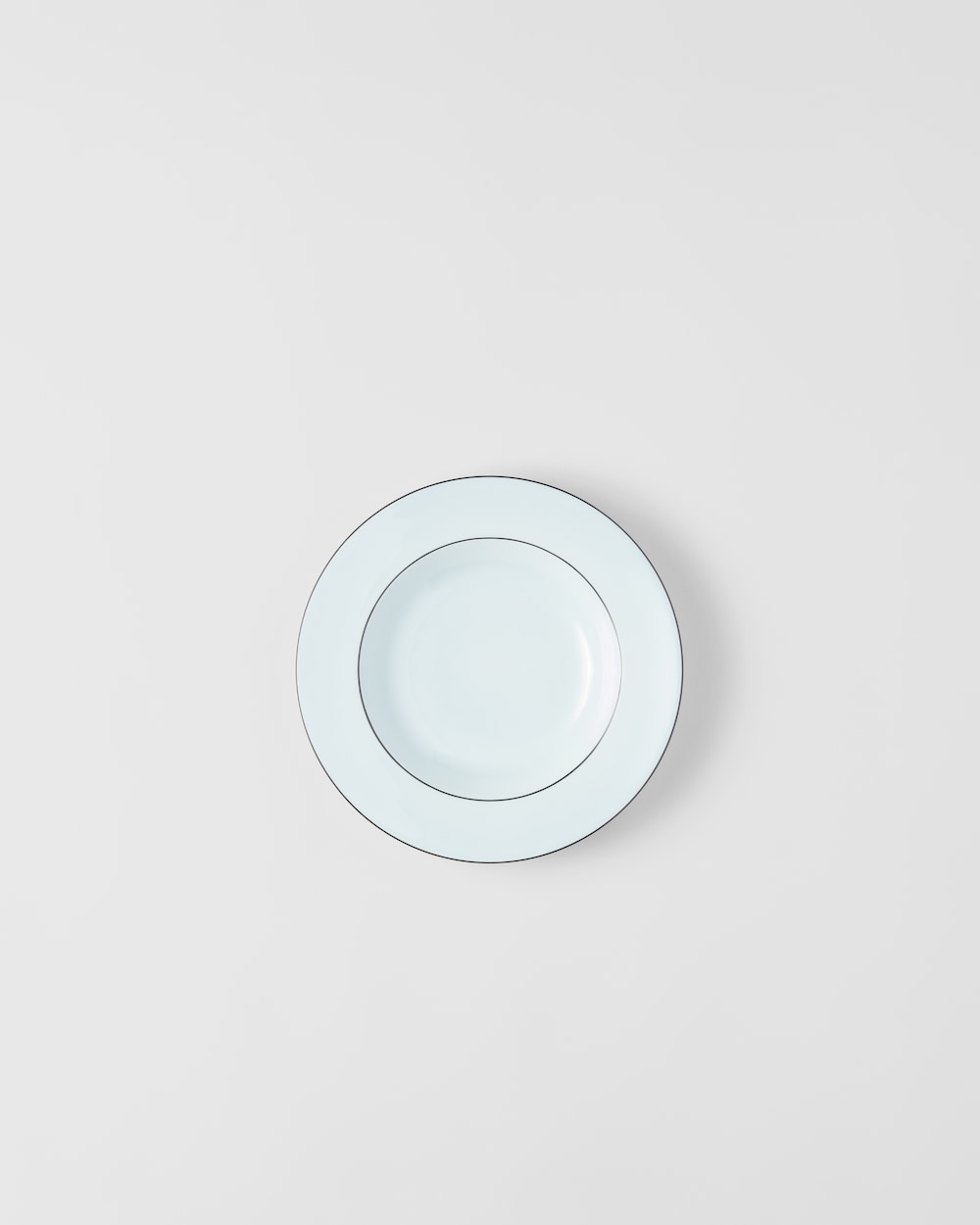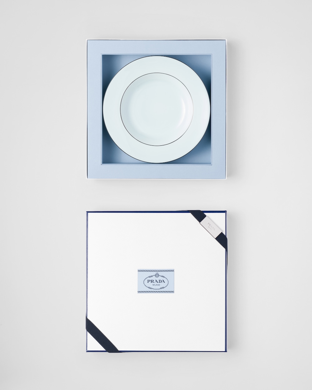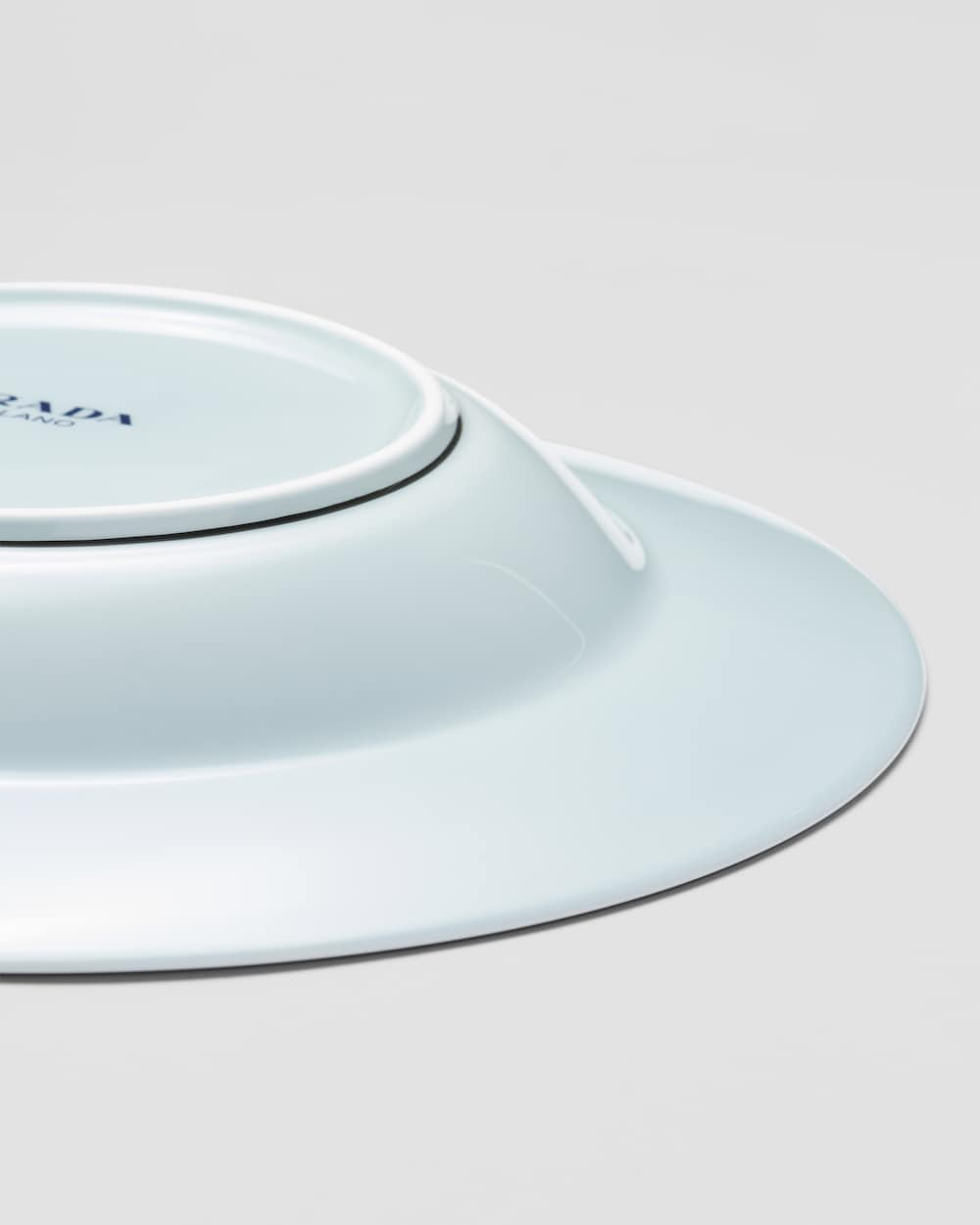 釉薬のかかった上質なポーセリンを使用し、職人技とプラダのデザインコードを洗練されたモダンなデザインに融合したスーププレート。日本の青磁器に着想を得て、アイコニックで繊細なニュアンスに美しい手塗りの縁を施したアイテム。