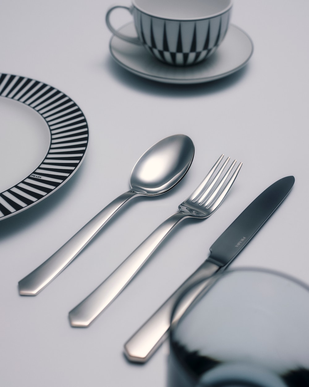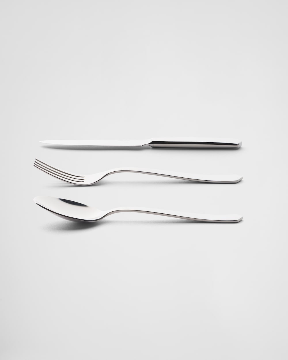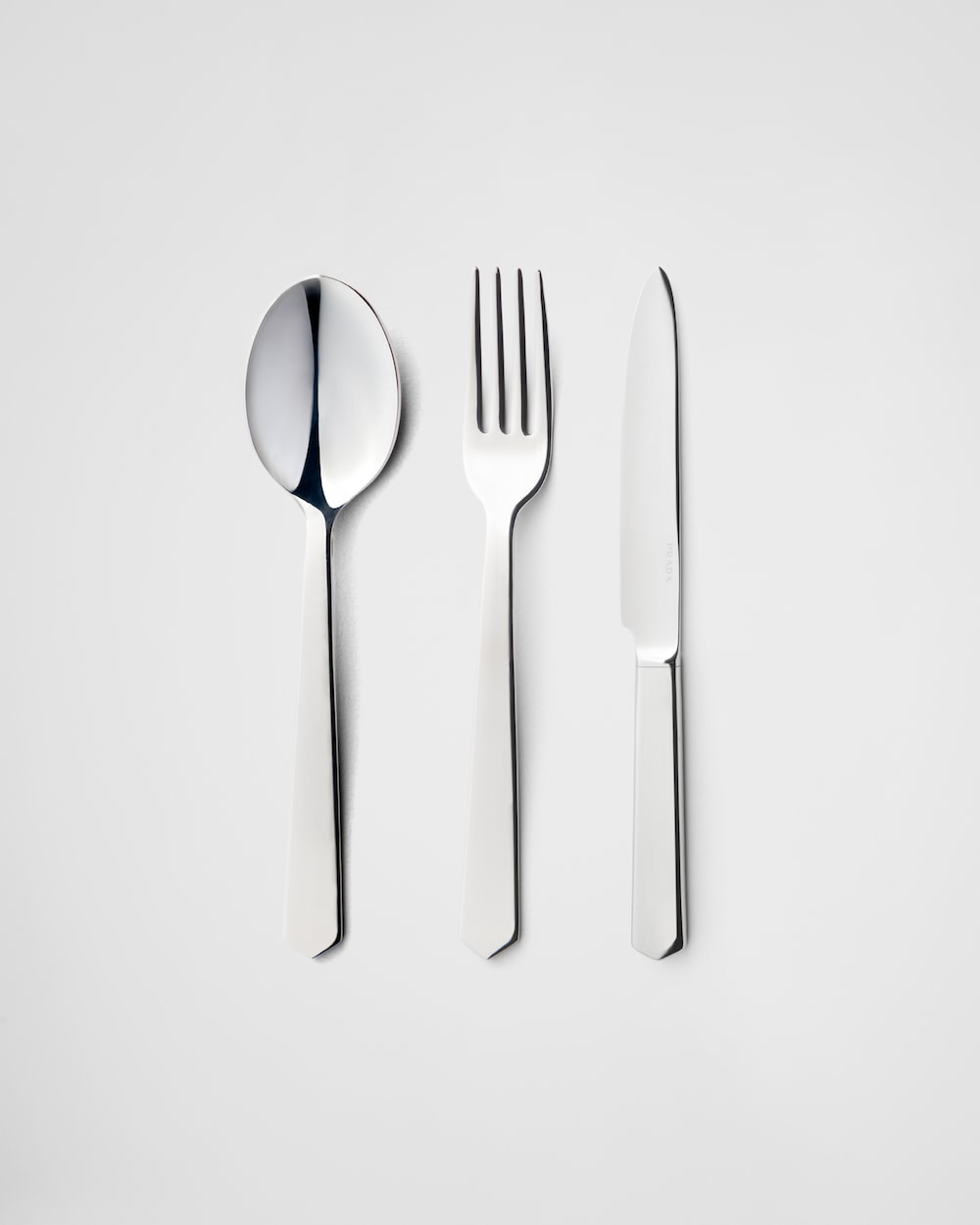 洗練された力強いラインがシルエットを際立たせる、スプーン、フォーク、ナイフのデザートフラットウェア セット。プラダのアイコニックなトライアングルロゴのフォルムを想起させる快適な幾何学ハンドルをあしらい、メタルの耐久性とエレガントなデザインが融合したステンレススティール製のフラットウェア。