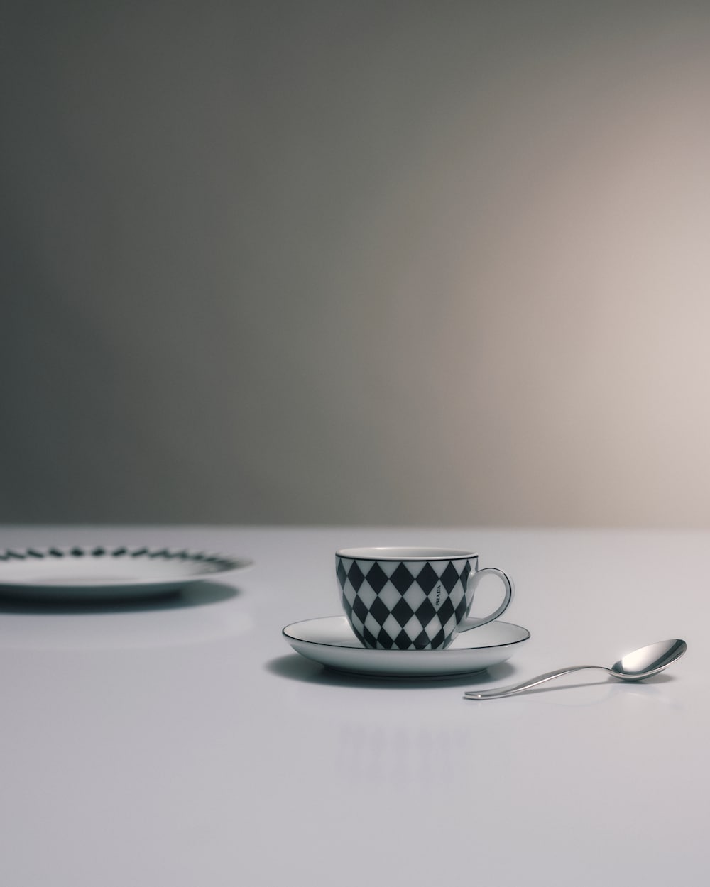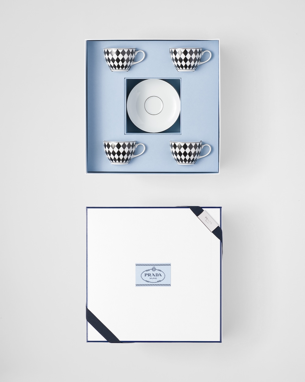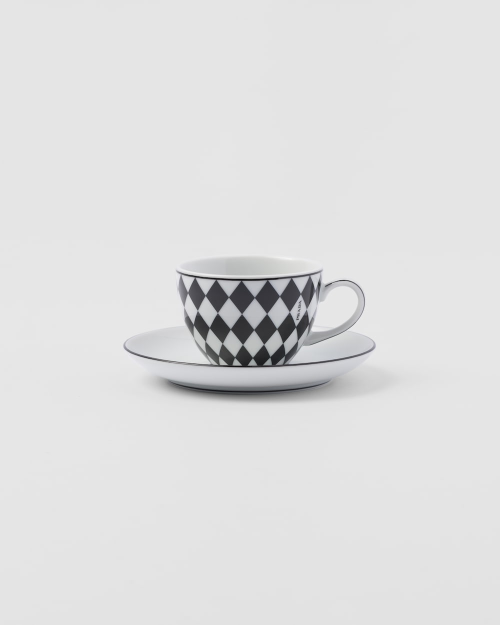 揃いのソーサー付のエレガントなエスプレッソカップ。ミラノのガレリア・ヴィットリオ・エマヌエーレⅡ世にある、歴史的なプラダ第一号店の白黒の市松模様の大理石の床を彷彿とさせる、アイコニックな格子柄のモチーフで飾られています。上質なポーセリンを使用した朝食に最適なセット。モダンで洗練された雰囲気で毎日のテーブルを彩ります。