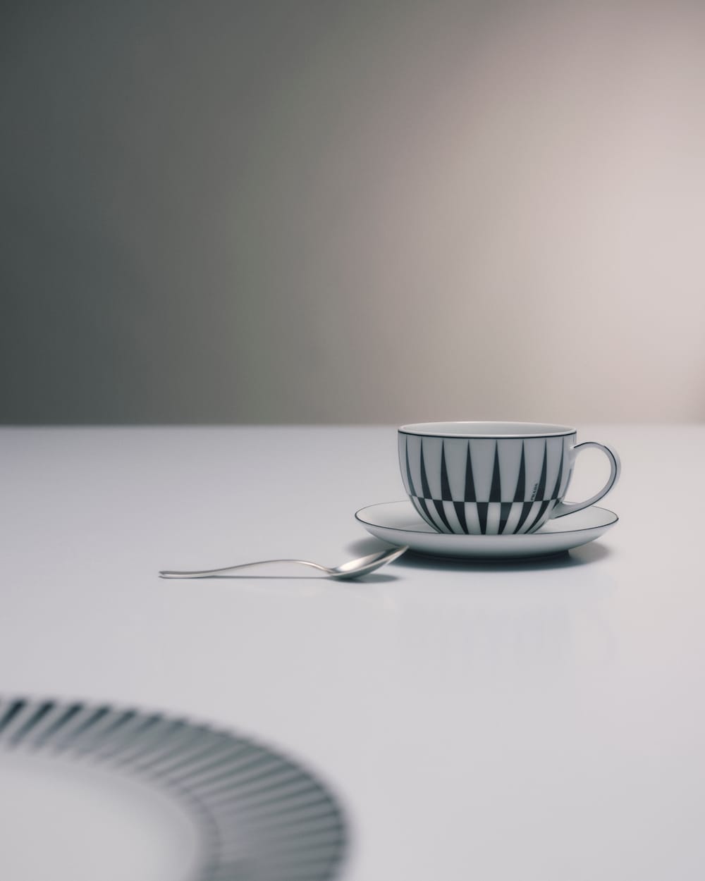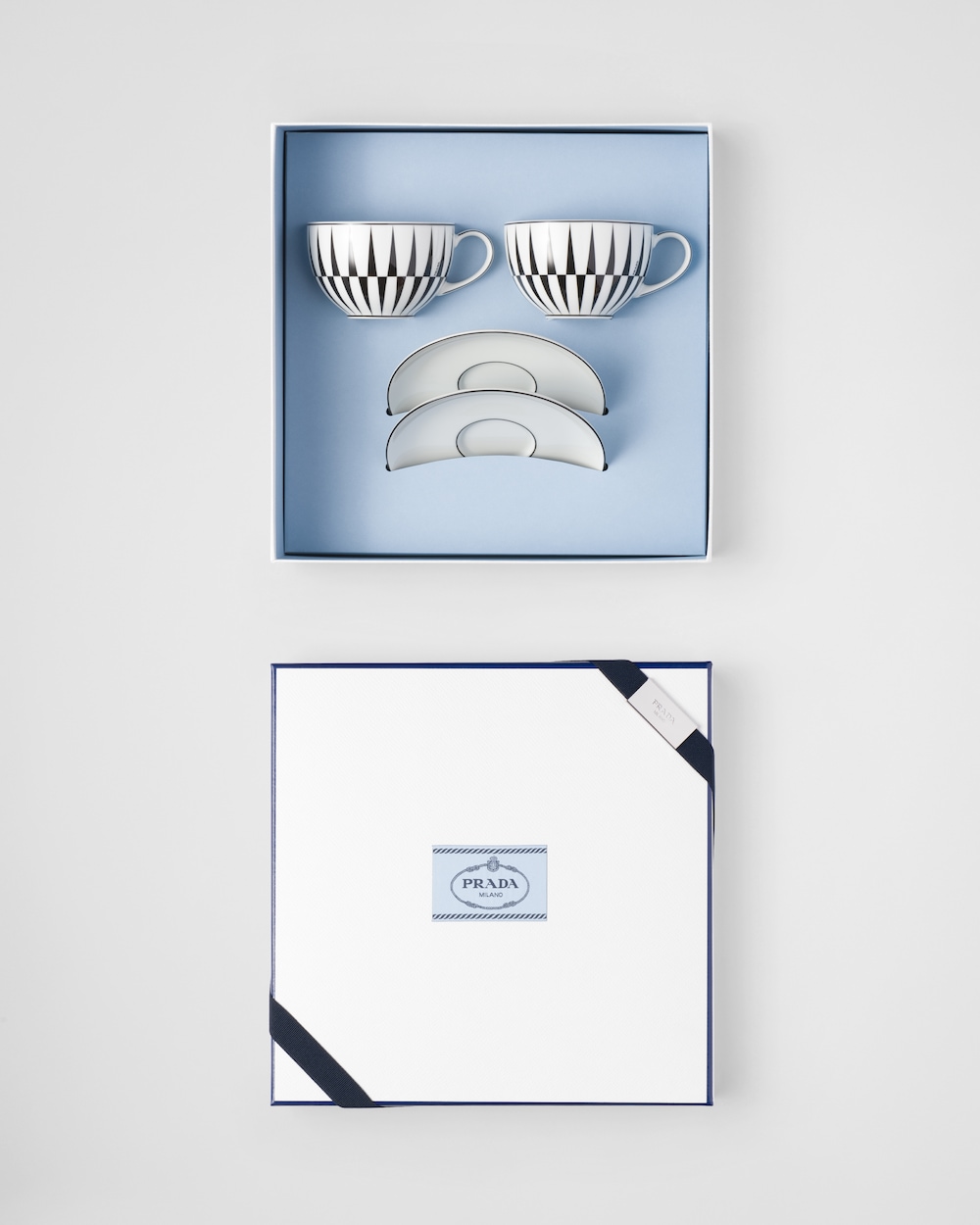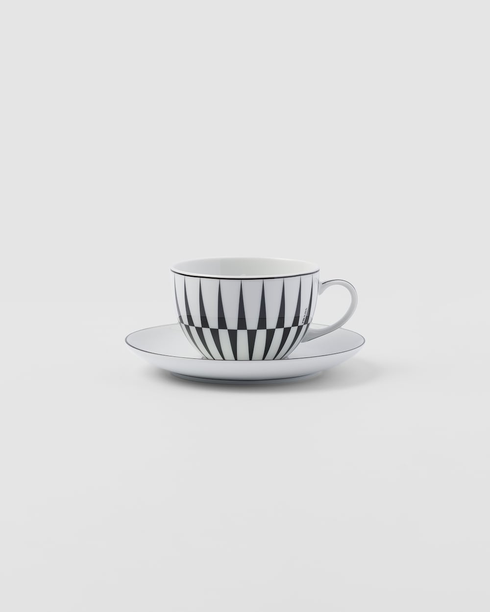 ミラノのガレリア・ヴィットリオ・エマヌエーレⅡ世にある、歴史的なプラダ第一号店の白黒の市松模様の大理石の床を彷彿とさせるアイコニックな格子柄を、1950年代のイタリアのキネティックアートを想起させるダイナミックなグラフィックプリントで再解釈しています。このモチーフを上質なポーセリンのカプチーノカップに飾りました。上品でモダンなセットにコントラストの効いたパターンをミックスすることで、意外性のある洗練されたテーブルセッティングを実現します。