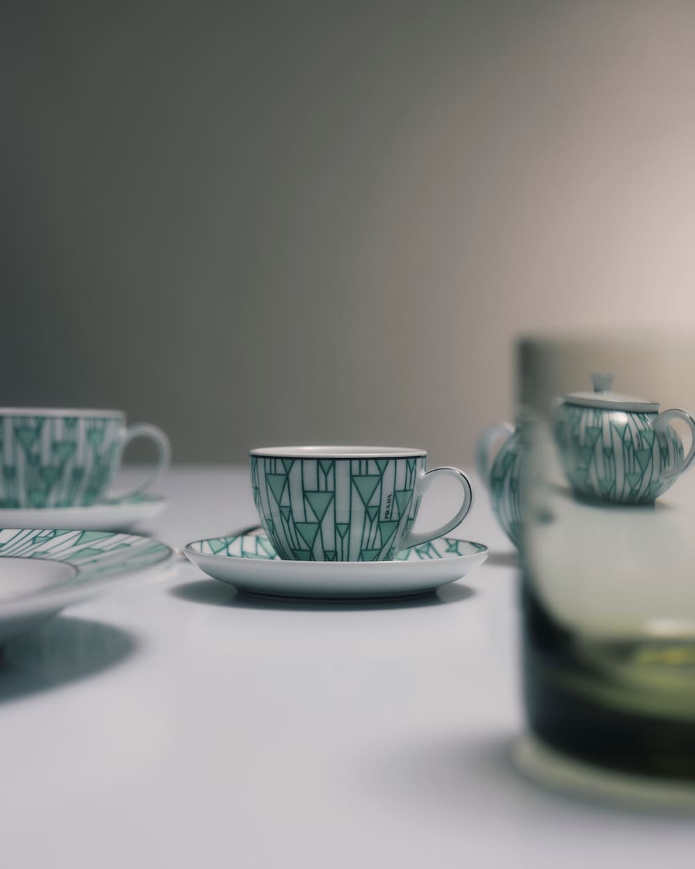揃いのソーサー付の洗練されたデザインのエスプレッソカップ。1904年に有名なウィーンの建築家ヨーゼフ・ホフマンがデザインしたグラフィックモチーフにインスピレーションを得た、モダンな幾何学装飾があしらわれています。毎日のさまざまなシーンで活躍する、上質なポーセリンのセット。エレガントな朝食を演出したり、モダンなテーブルに洗練されたエレガンスのタッチを添えます。
