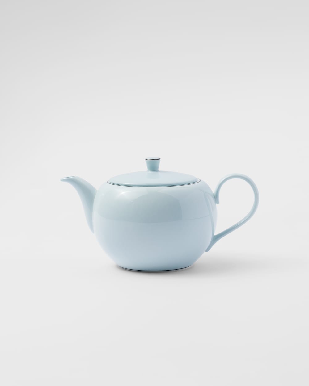釉薬のかかった上質なポーセリンを使用し、職人技とプラダのデザインコードを洗練されたモダンなデザインに融合したティーポット。日本の青磁器に着想を得て、アイコニックで繊細なニュアンスに美しい手塗りの縁を施したアイテム。