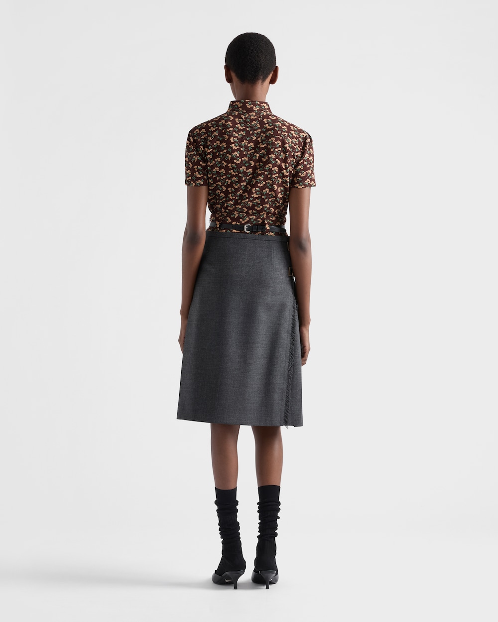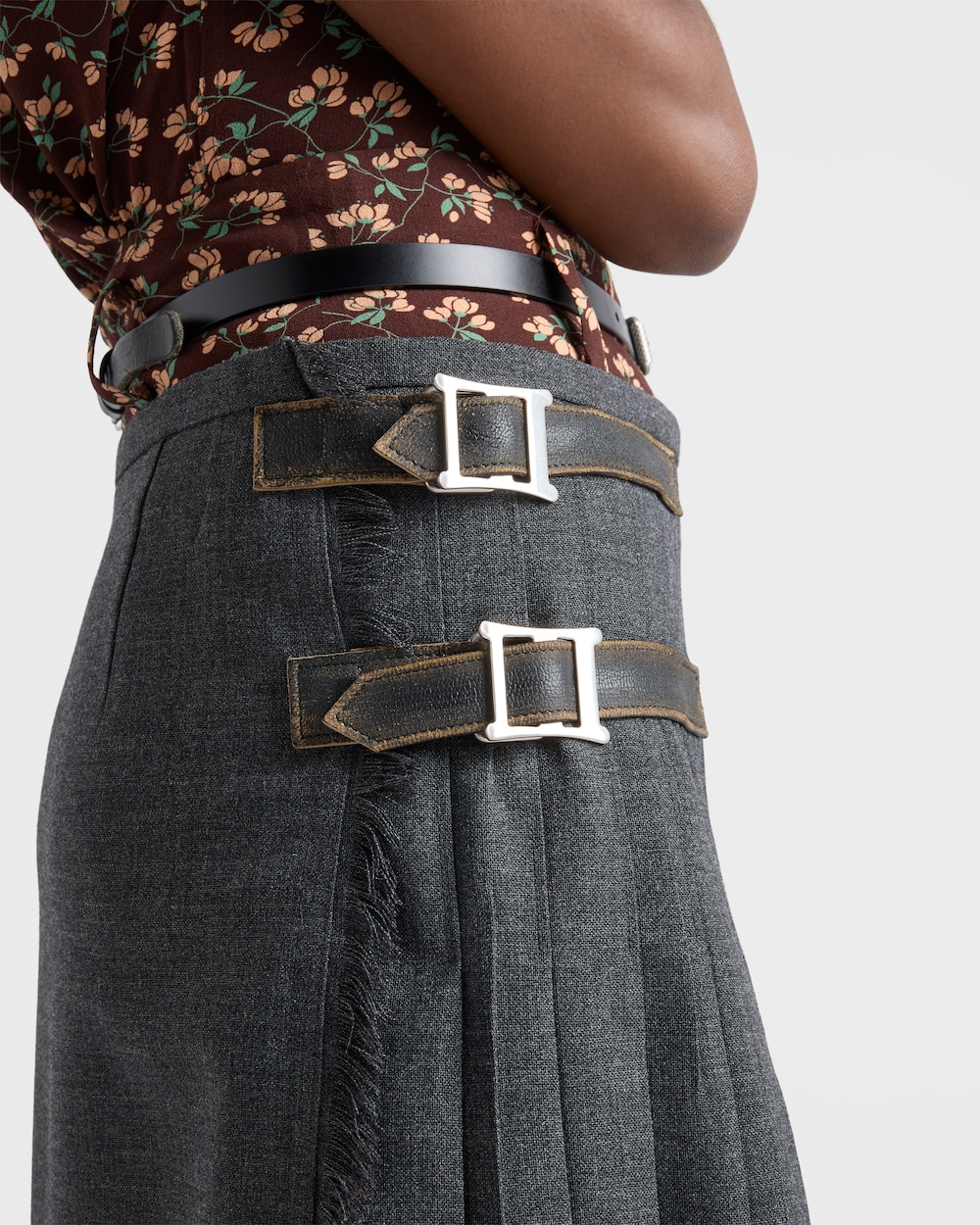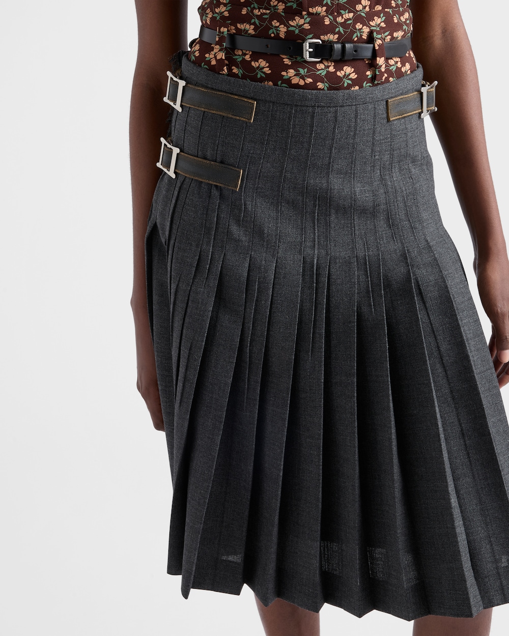 プリーツスカートは、プラダのワードローブの重要なアイテムであり、常に新しい生地やディテールで再解釈され、そのタイムレスなシルエットを演出しています。このウールバージョンは、フェミニンな要素とヴィンテージ風のレザーストラップのような大胆なディテールを重ね合わせた遊び心を加えています。