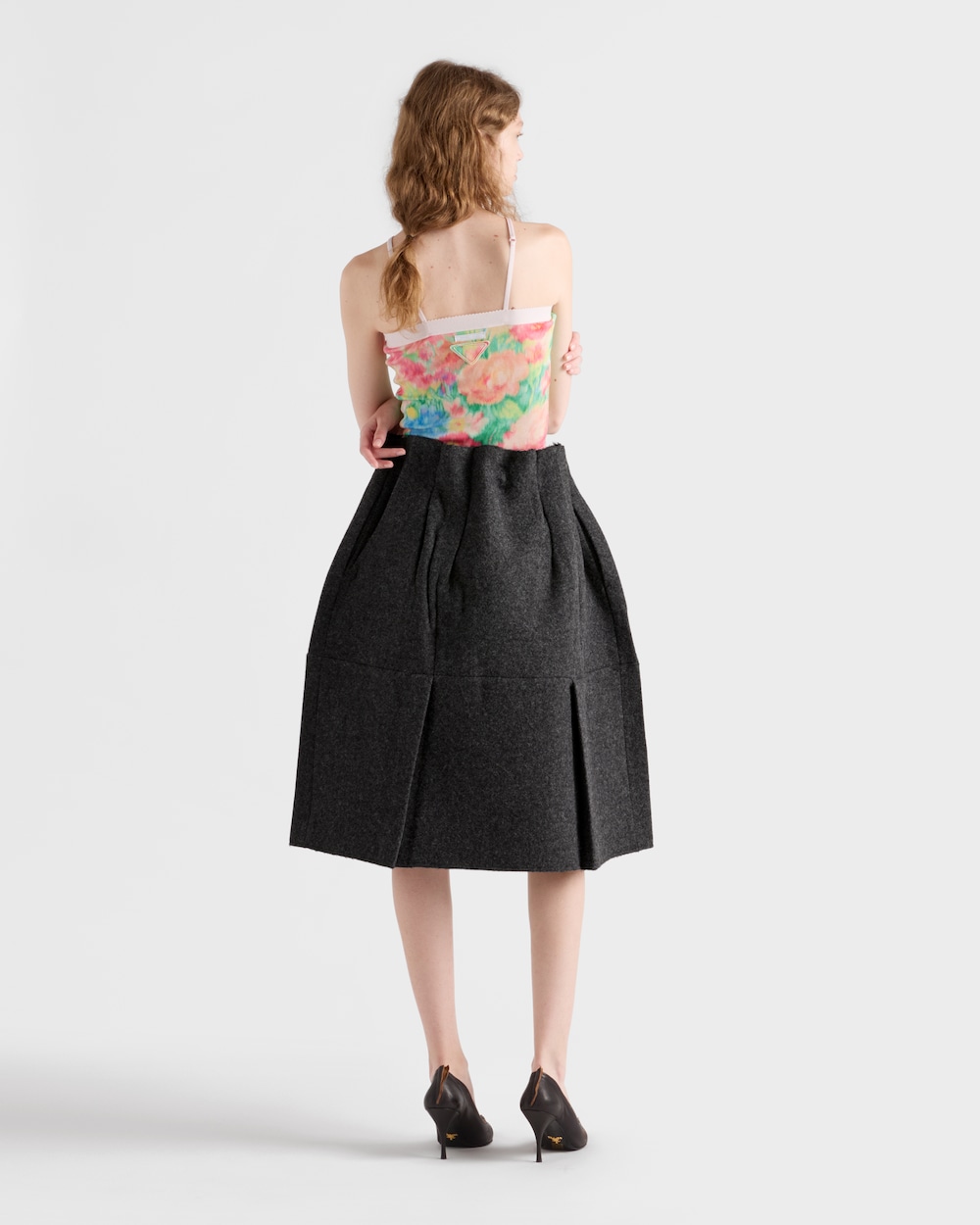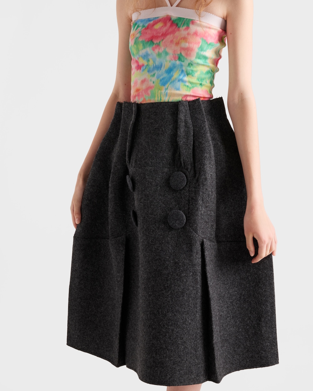 2025年秋冬コレクションは、女性らしさの概念を探求し、その象徴的なアイテムを再定義します。このシェットランドウールのスカートは、ウエストに施された柔らかなドレープと、同系色のオーバーサイズボタンがヴィンテージの魅力を引き立てる、構築的なシルエットが特徴です。