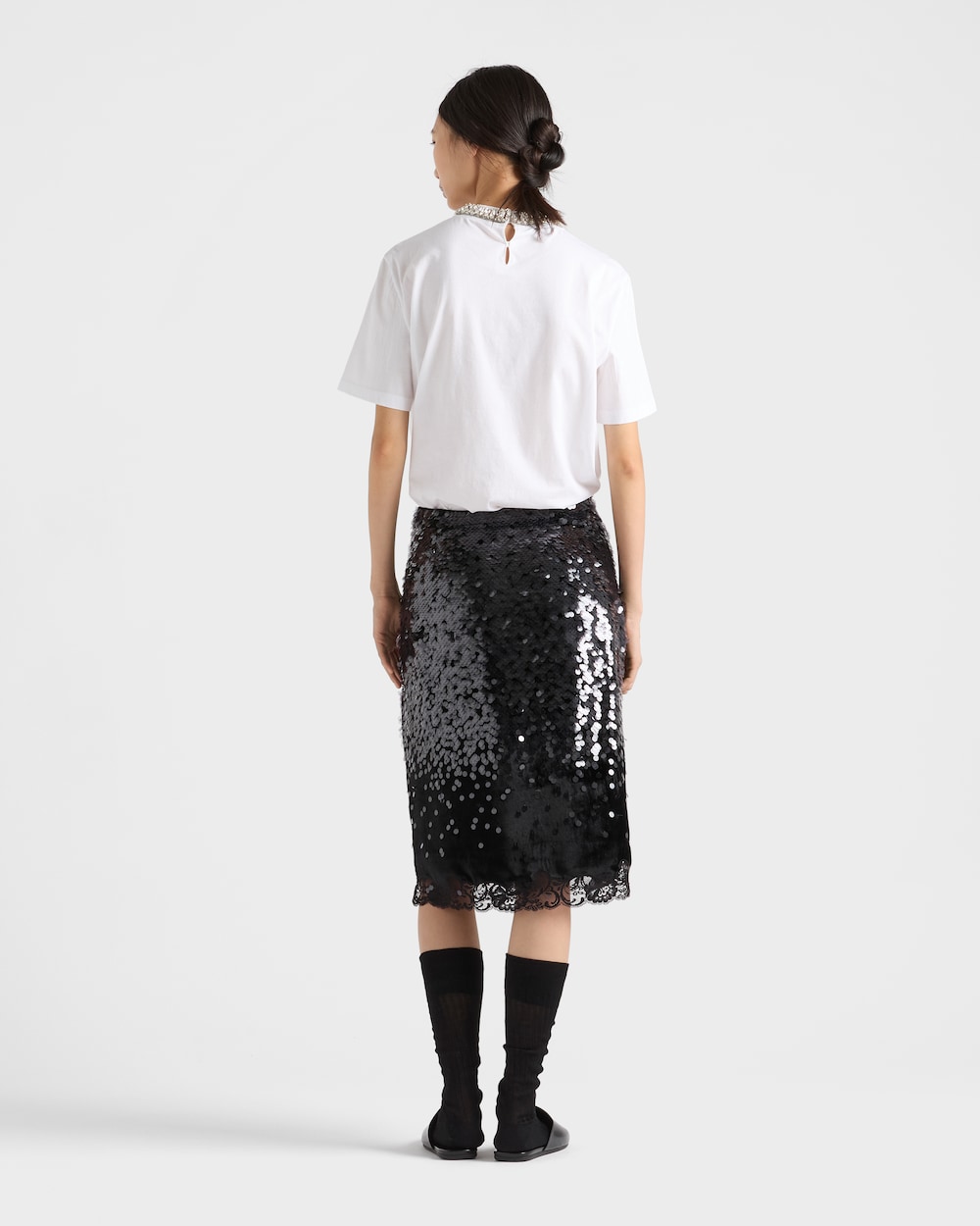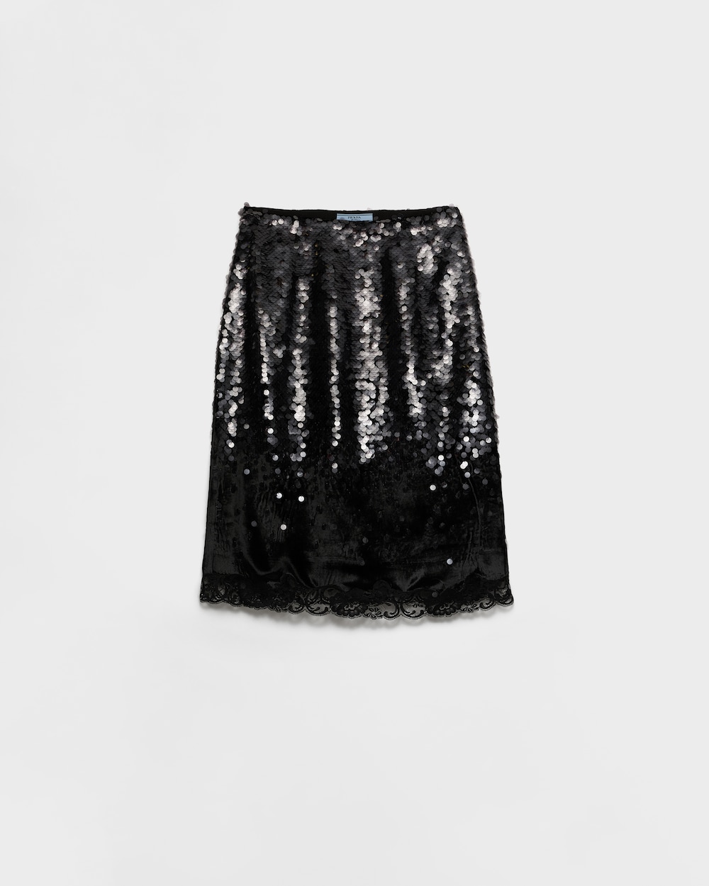 繊細さと気品を兼ね備えたデザインが、洗練されたフェミニニティを際立たせる一着。ベルベット素材にグラデーションのスパンコールとレーストリムをあしらい、ペンシルシルエットを華やかに引き立てます。アンダースカートとファスナー開閉式のサイドジッパーを使用した構造が、洗練されたテーラリング技術を反映しています。
