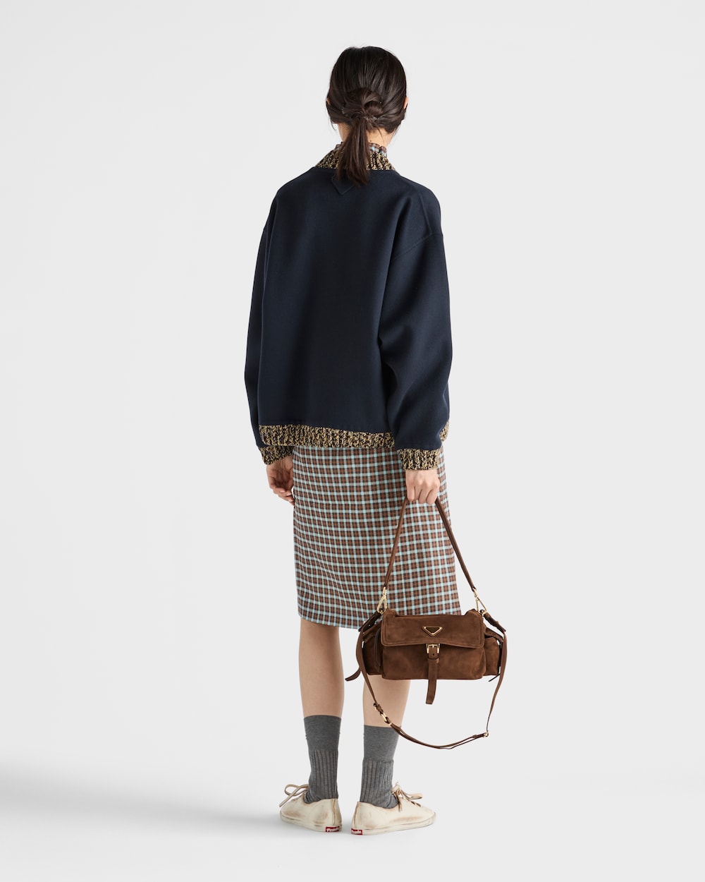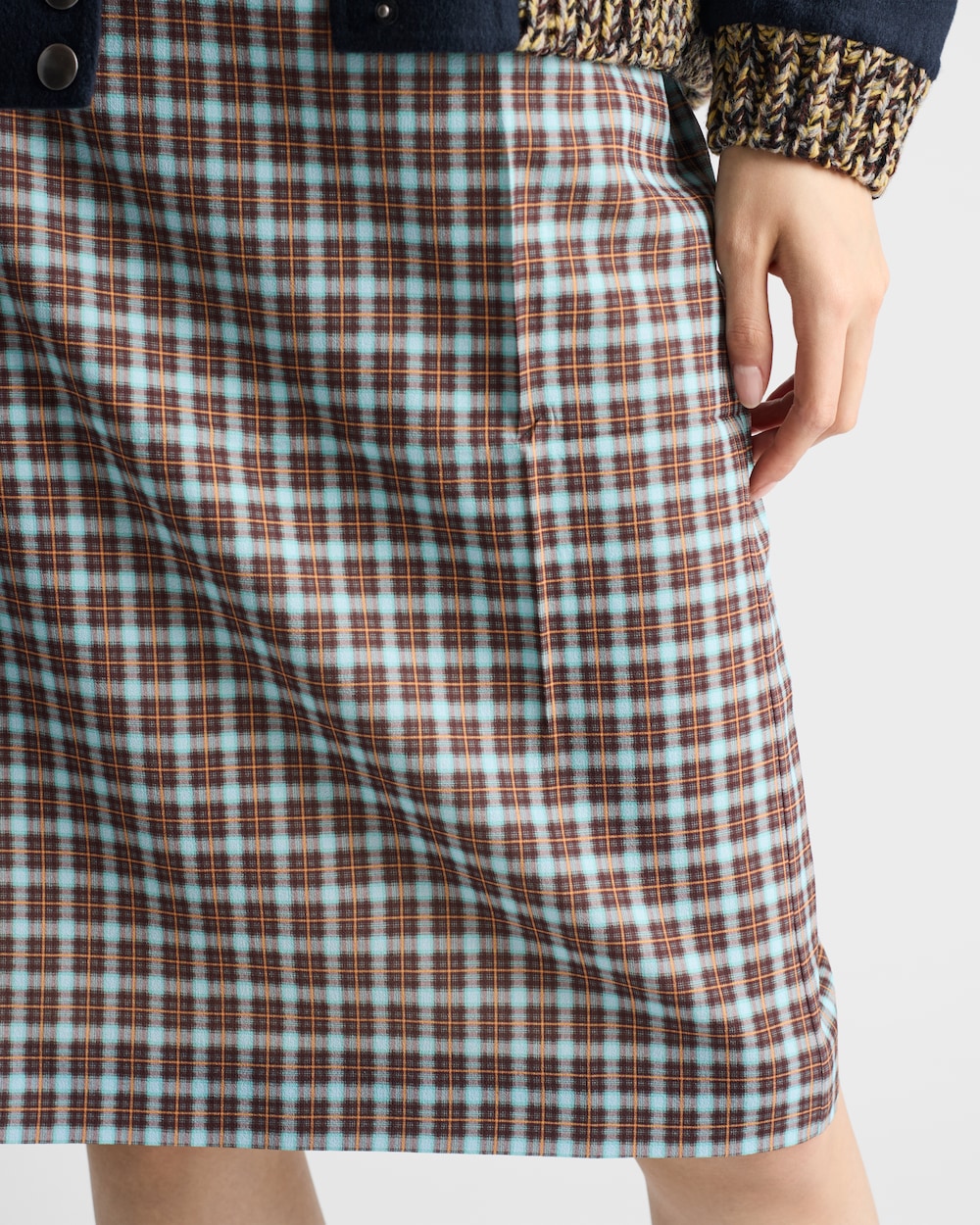 モダニストスタイルのチェックプリントが、ストレートカットのジョーゼットスカートに豊かな表情を与えます。同色のトライアングルロゴが、カジュアルなエレガンスを備えたアイテムにシグネチャータッチを加えています。
