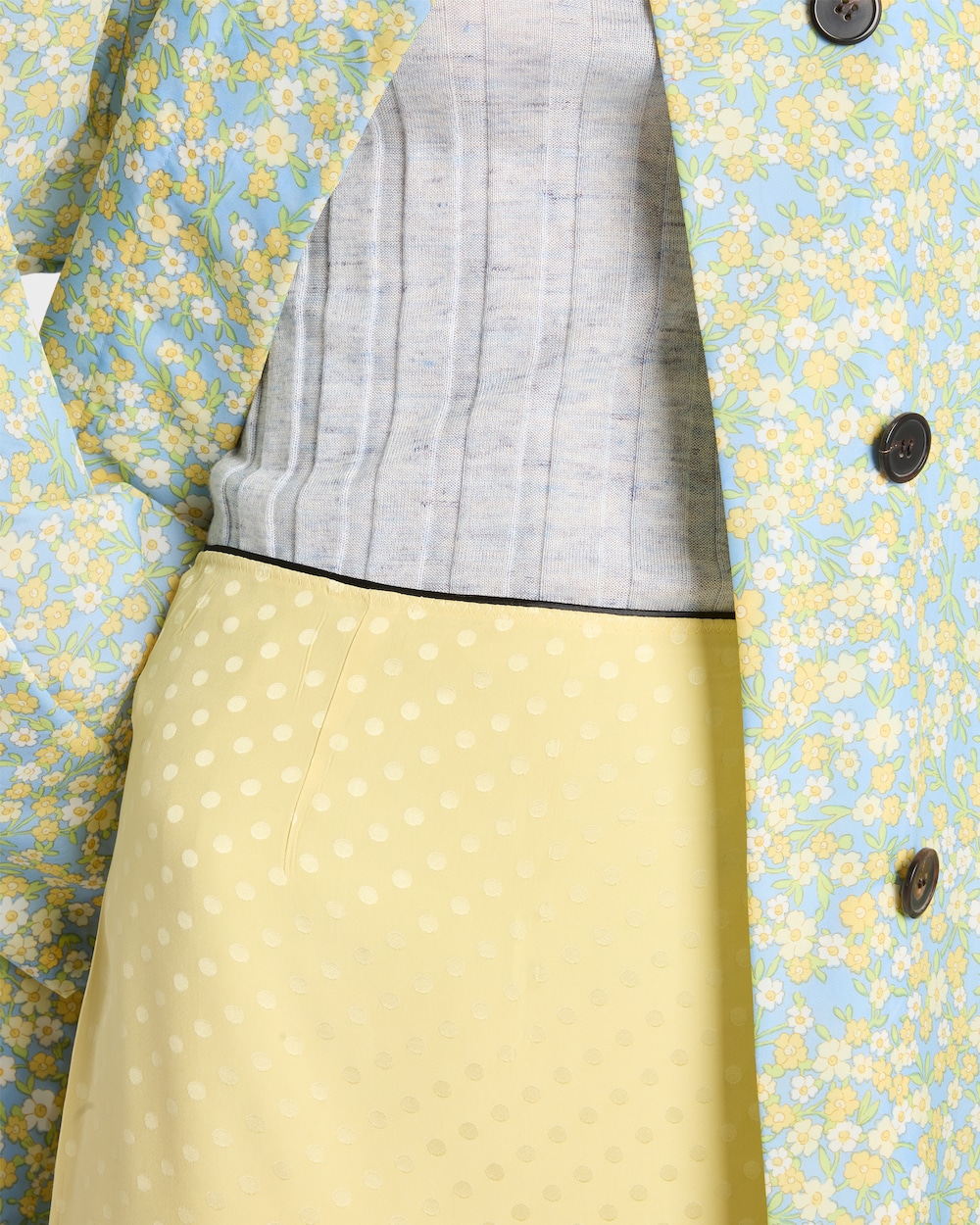厳格さとレトロな精神が、プラダの世界を特徴づけるコントラストと二面性の遊びによって新たに表現されています。この軽やかなサテンのスカートには、遊び心あふれるポルカドットのモチーフがあしらわれています。