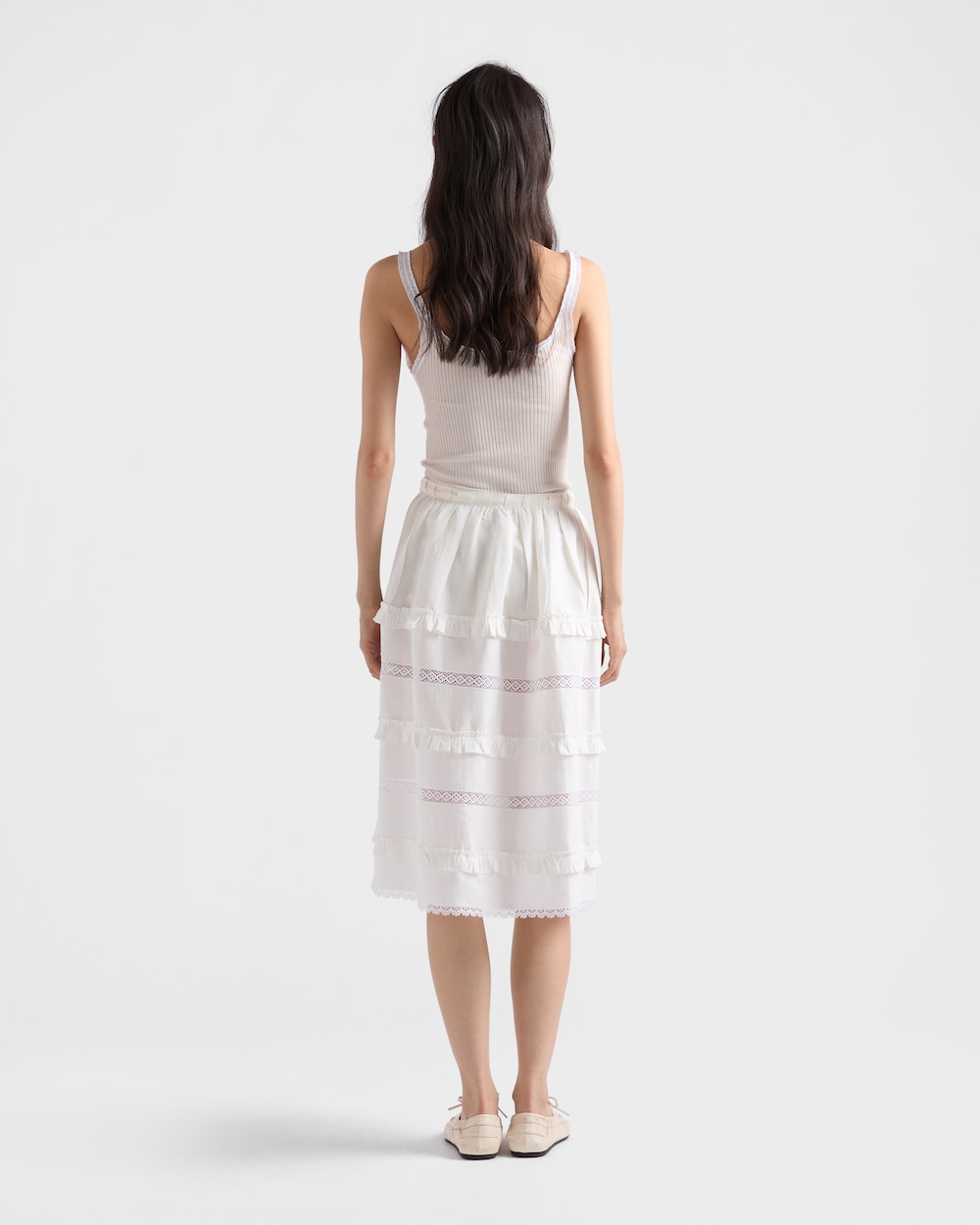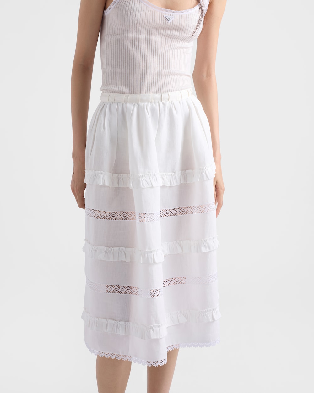 ロマンティックなフリルと貴重な手作り刺繍がこのリネンスカートのフルシルエットを作り出しています。軽やかさと職人技がプラダ トライアングルロゴの特徴的なシンボルに表現されています。