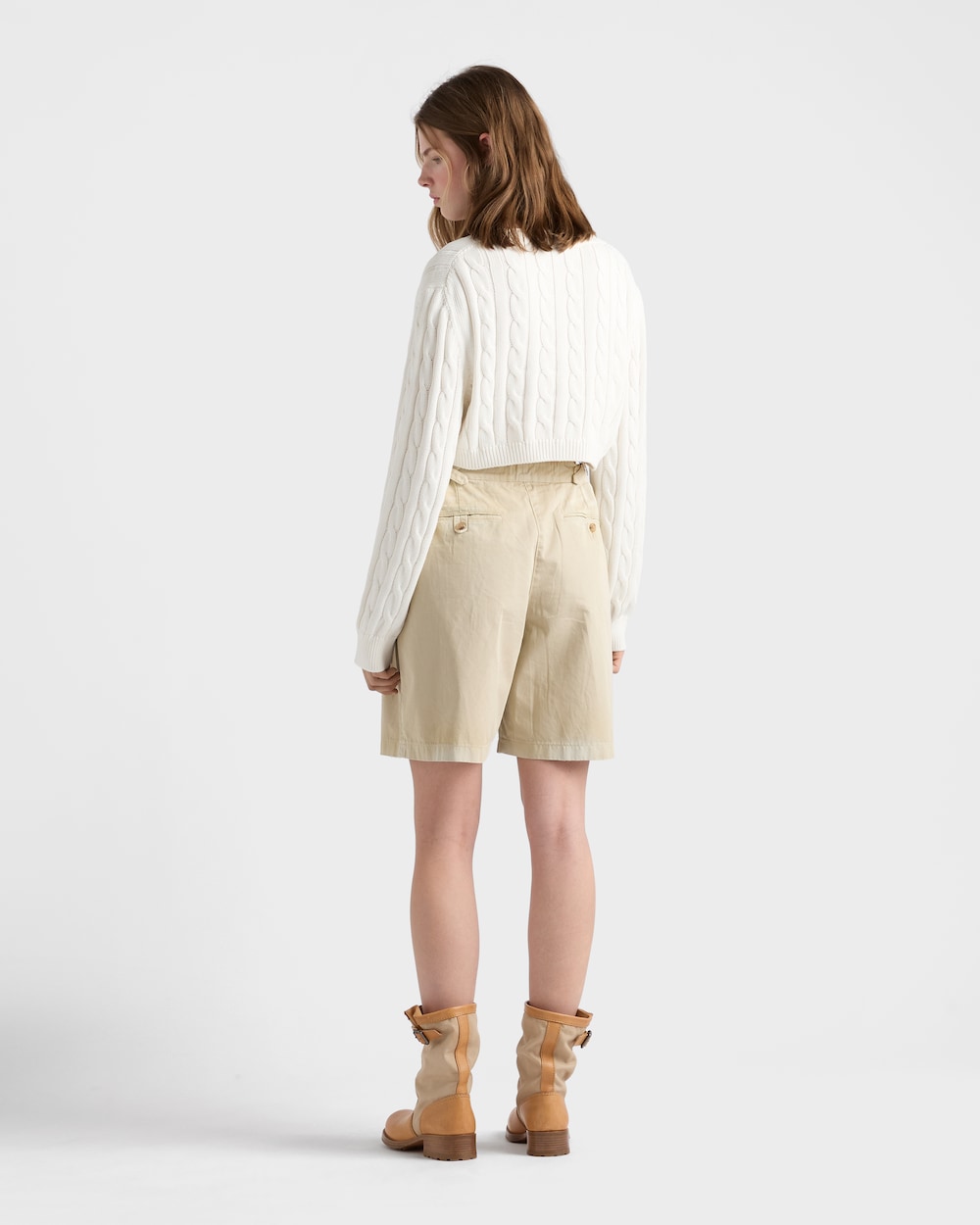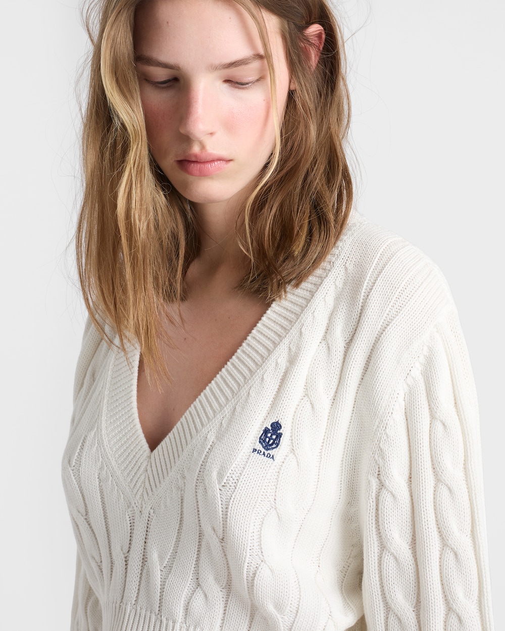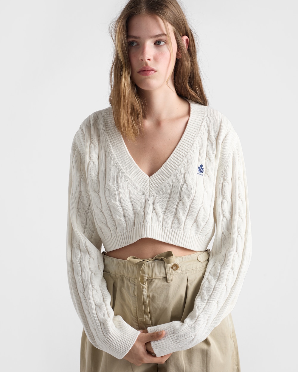 コットンの心地よい軽さが、洗練されたクラシックなラインのこのセーターを特徴づけています。クロップド丈はVネックとケーブル編みのモチーフが特徴です。